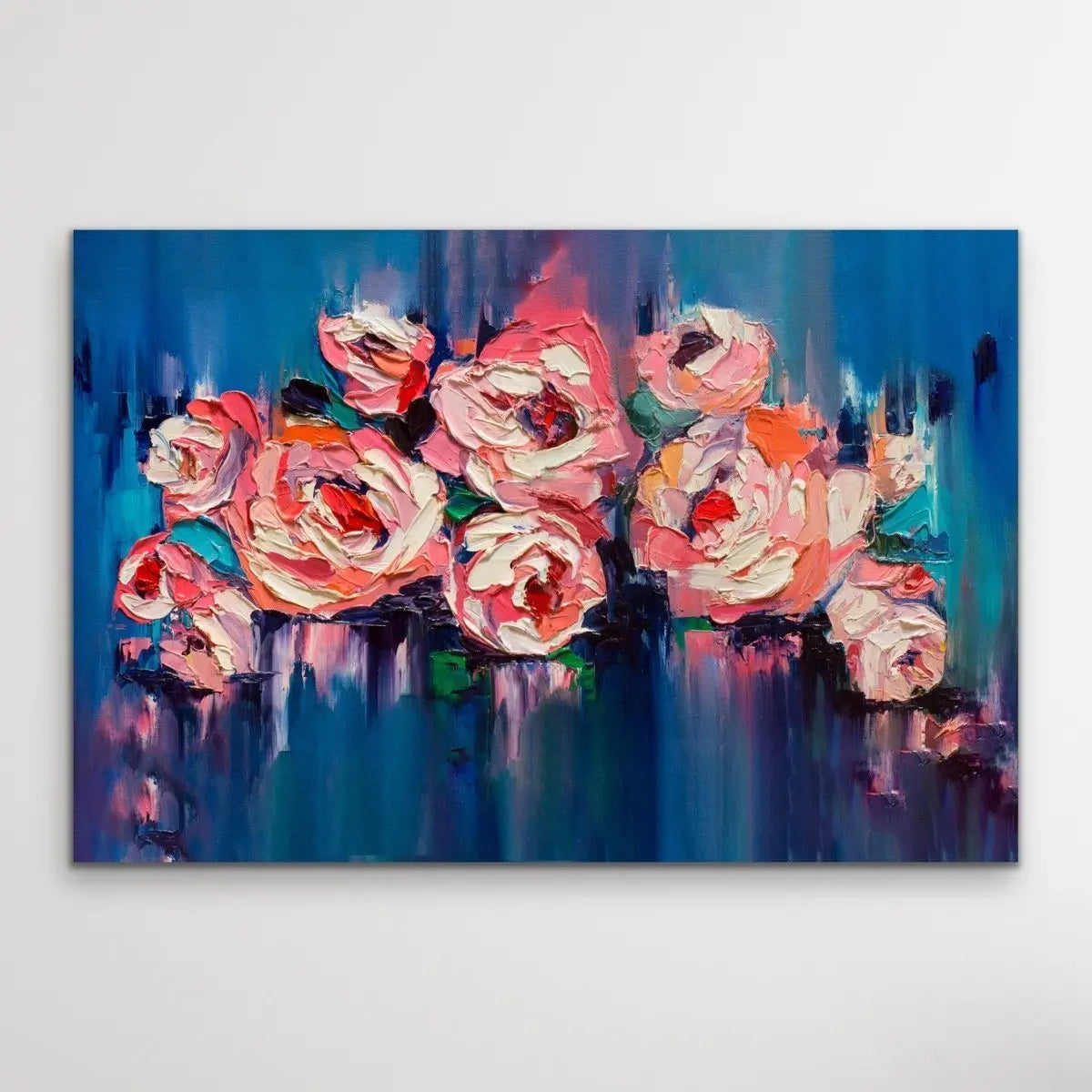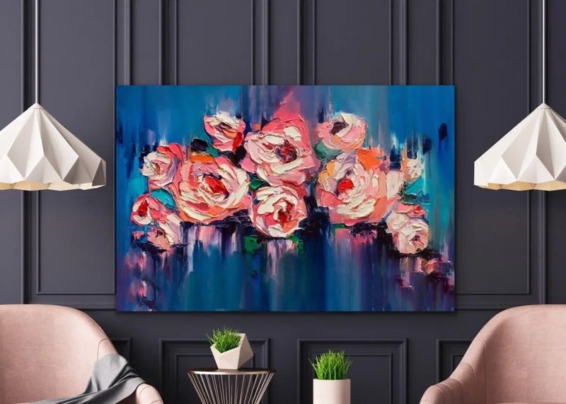 The background is textural and rich, giving this piece a deep layeredlook.The textural application also helps give the flowers an edgy and contemporaryfeel that elevates it beyond many other floral prints around.