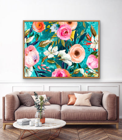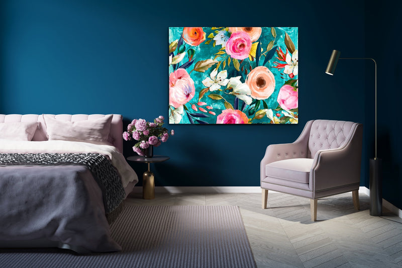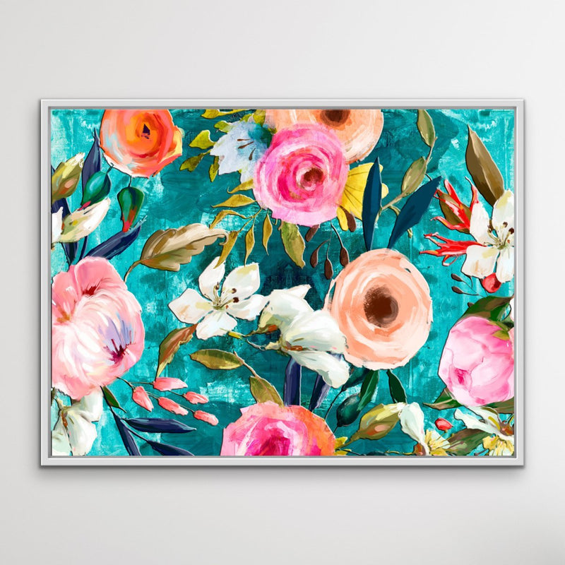 The background is textural and rich, giving this piece a deep layered look.The textural application also helps give the flowers an edgy and contemporary feel that elevates it beyond many other floral prints around.
