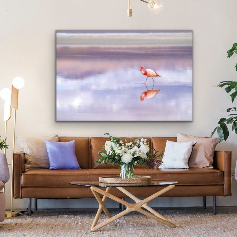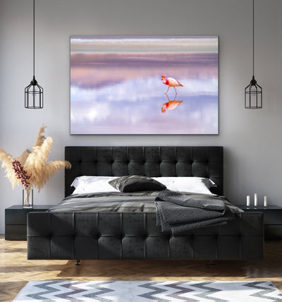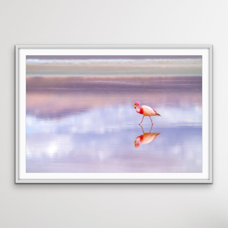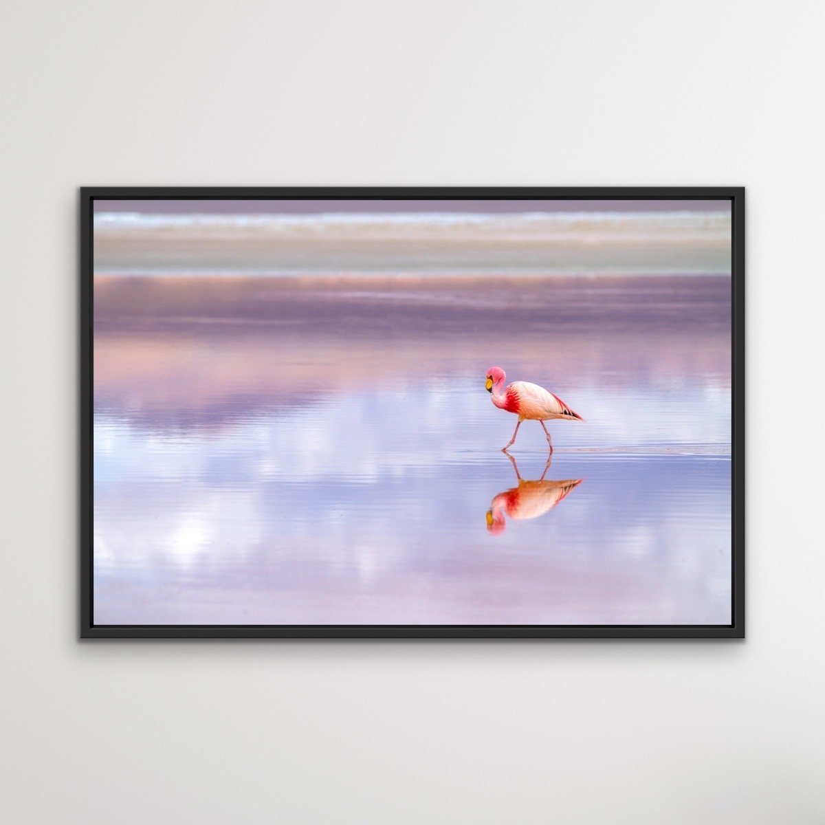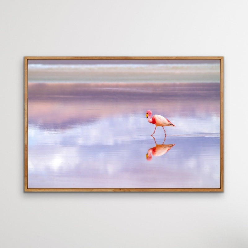Fun and fabulous, this bold pink print features a beautiful flamingo alone on a softly lit beach at Sunset. This print is warm and inviting and offers a beautiful coastal scene captured forever.
