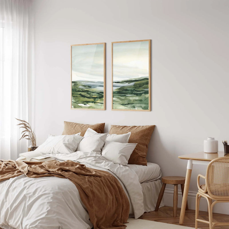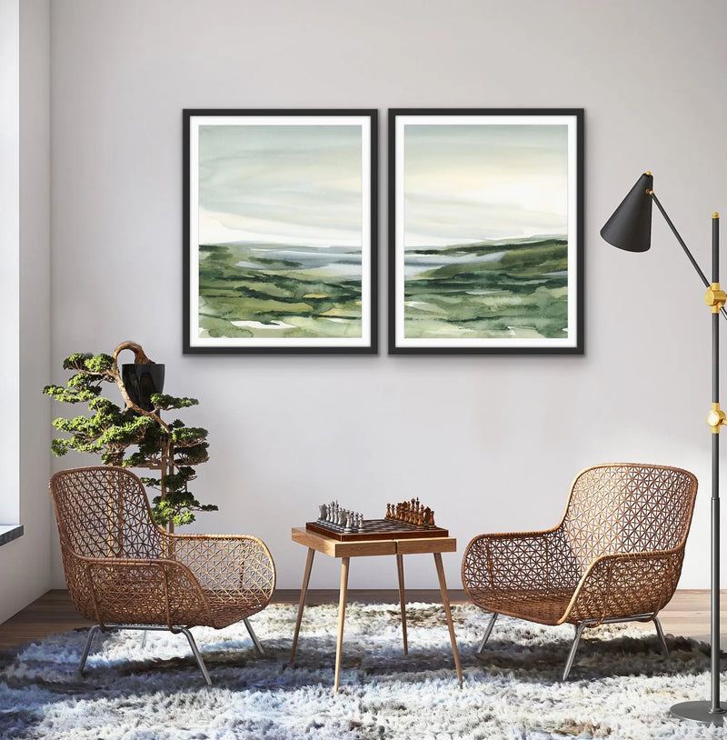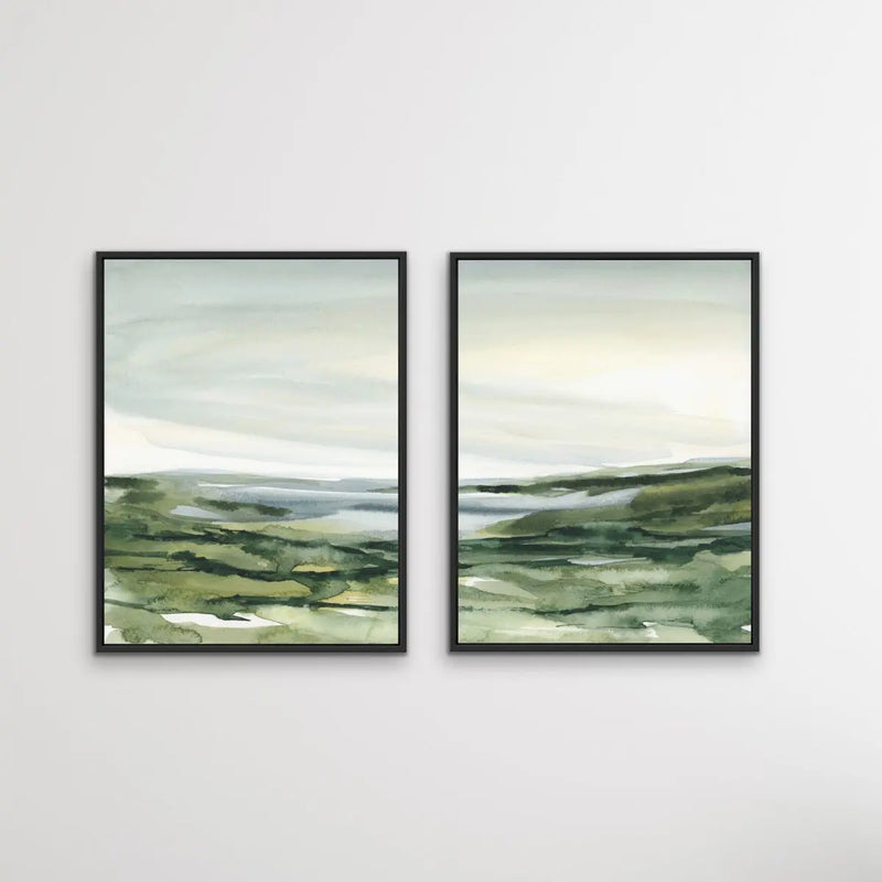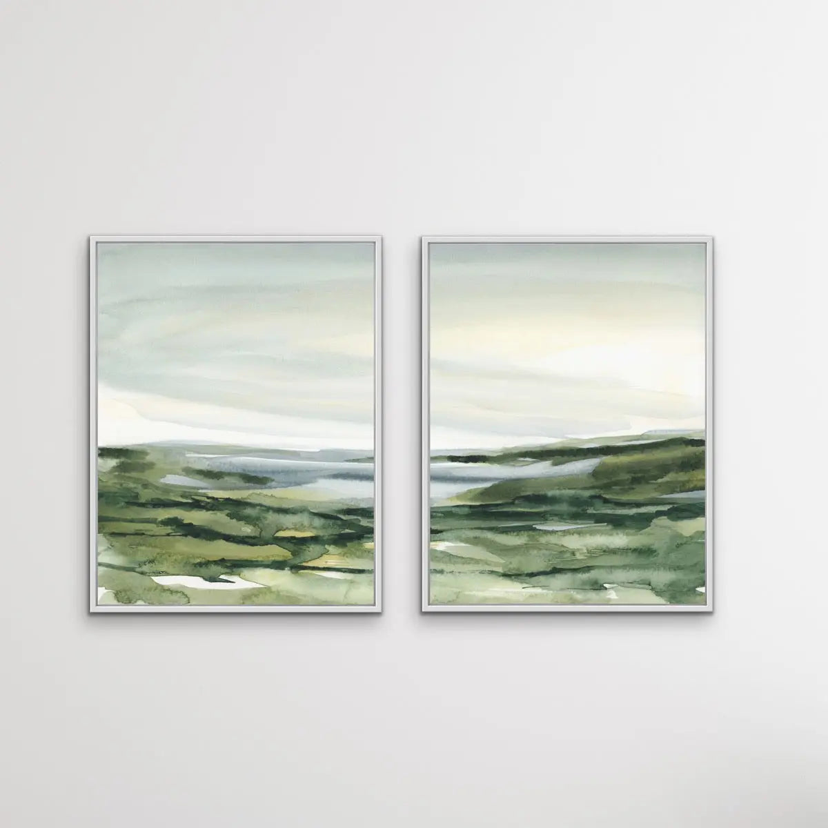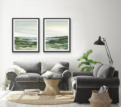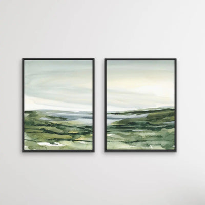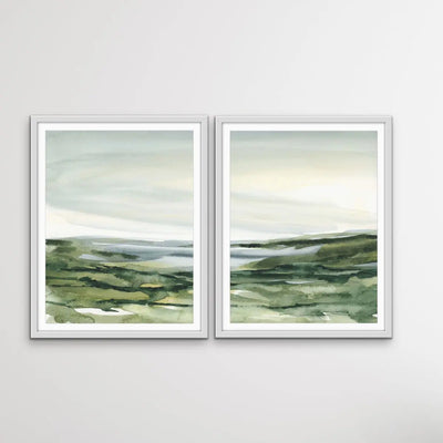 This elegant print set features two landscape watercolour prints, designed to hang side by side to fully represent this stunning green landscape.