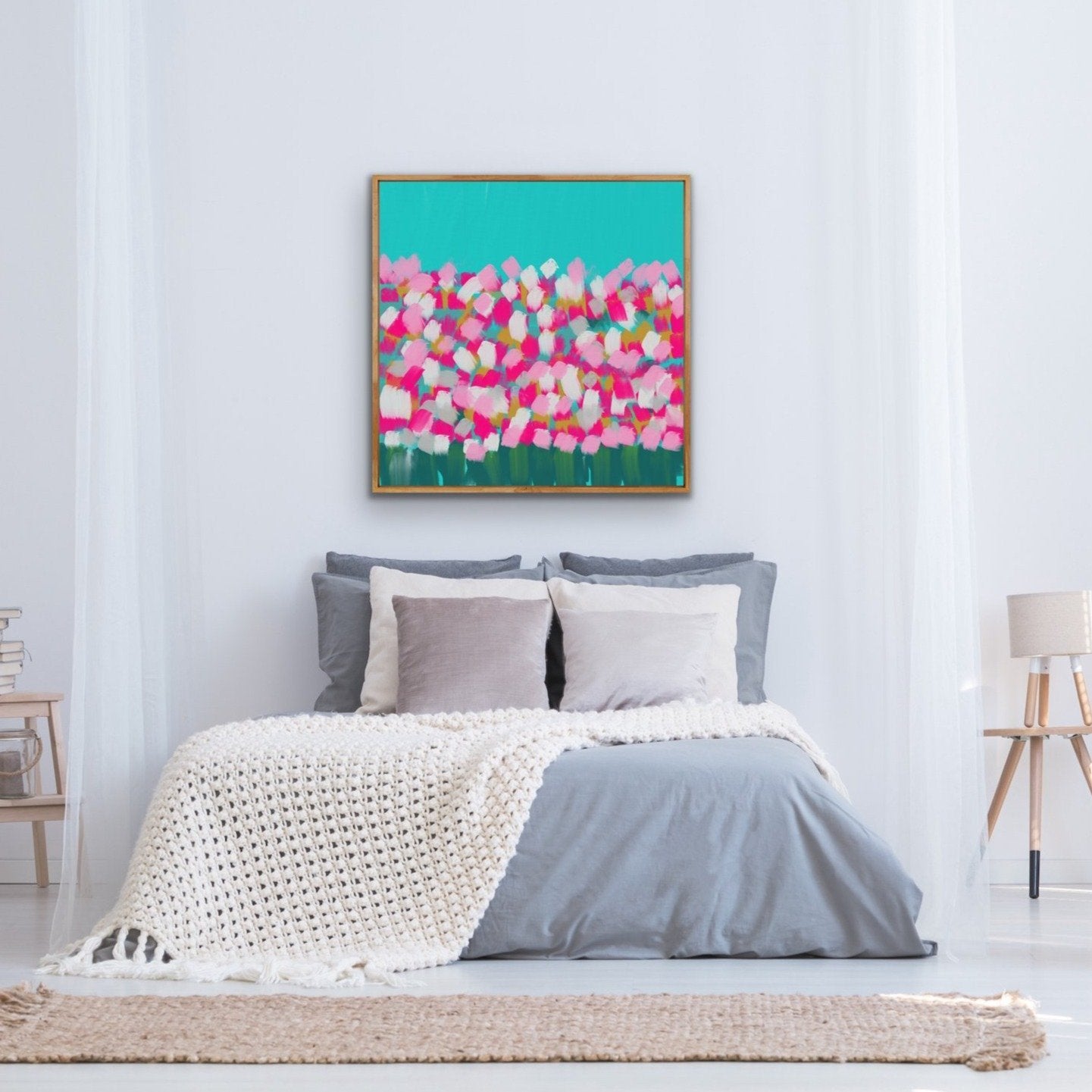 This bold bright abstract print is the perfect piece for any lover of turquoise and pink! It's fun and vibrant, and will uplift and provide a focal point for any space it's put into.
