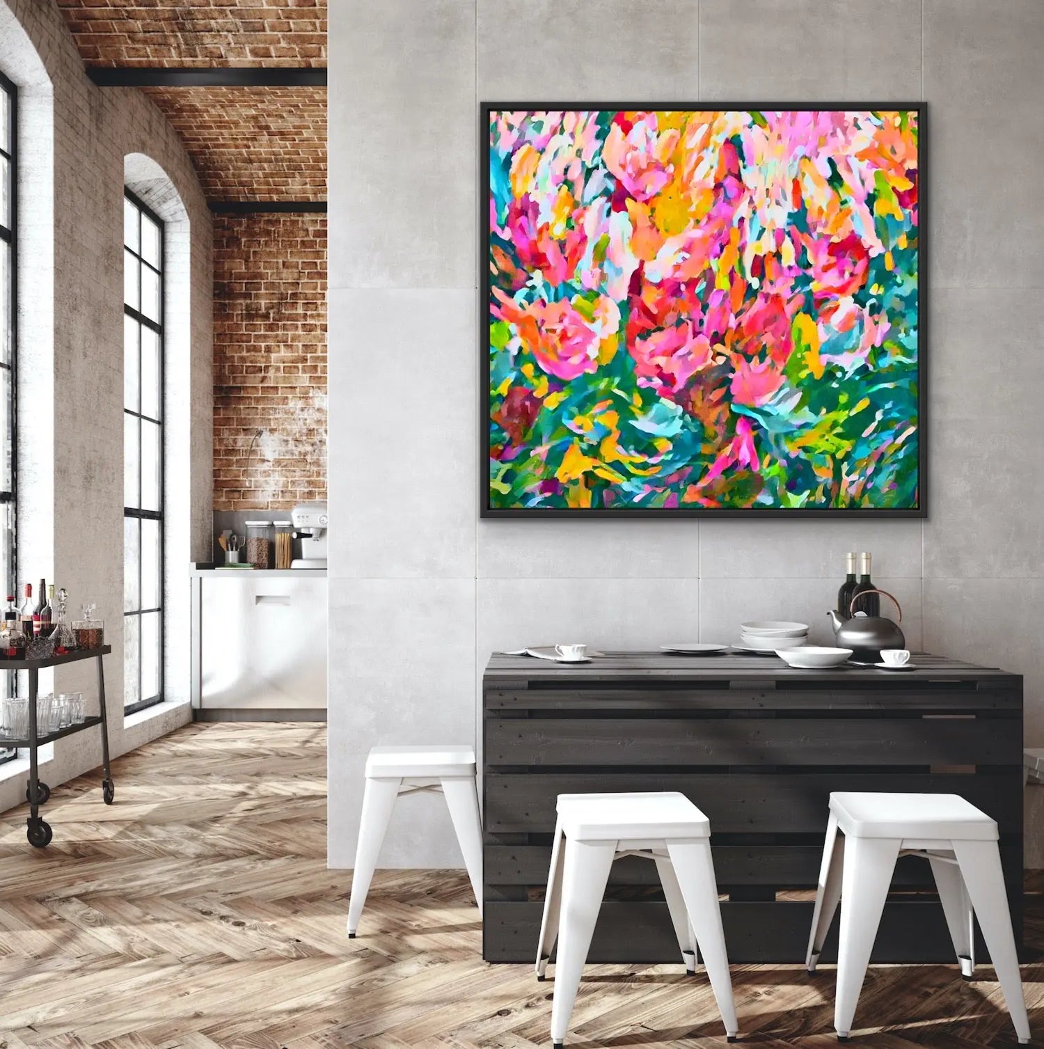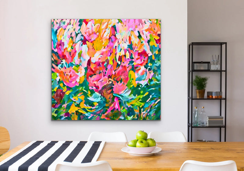 For a colourful celebration of fun florals, this gorgeous bright abstract is the perfect choice. Deep green emerald tones contract vibrant pinks and blues, making this a print that demands attention!