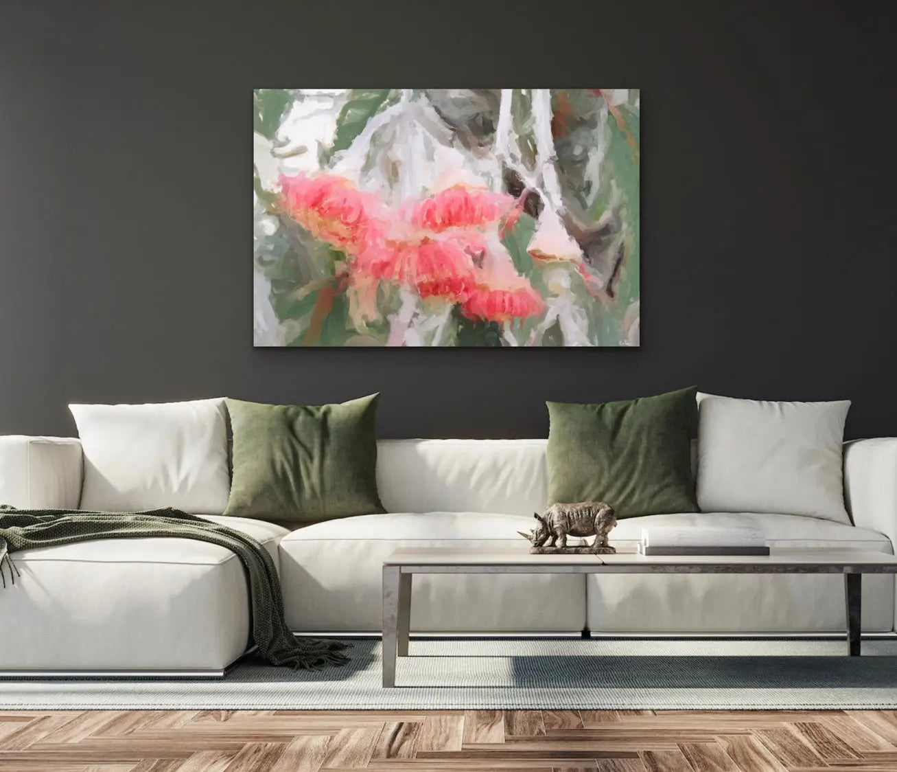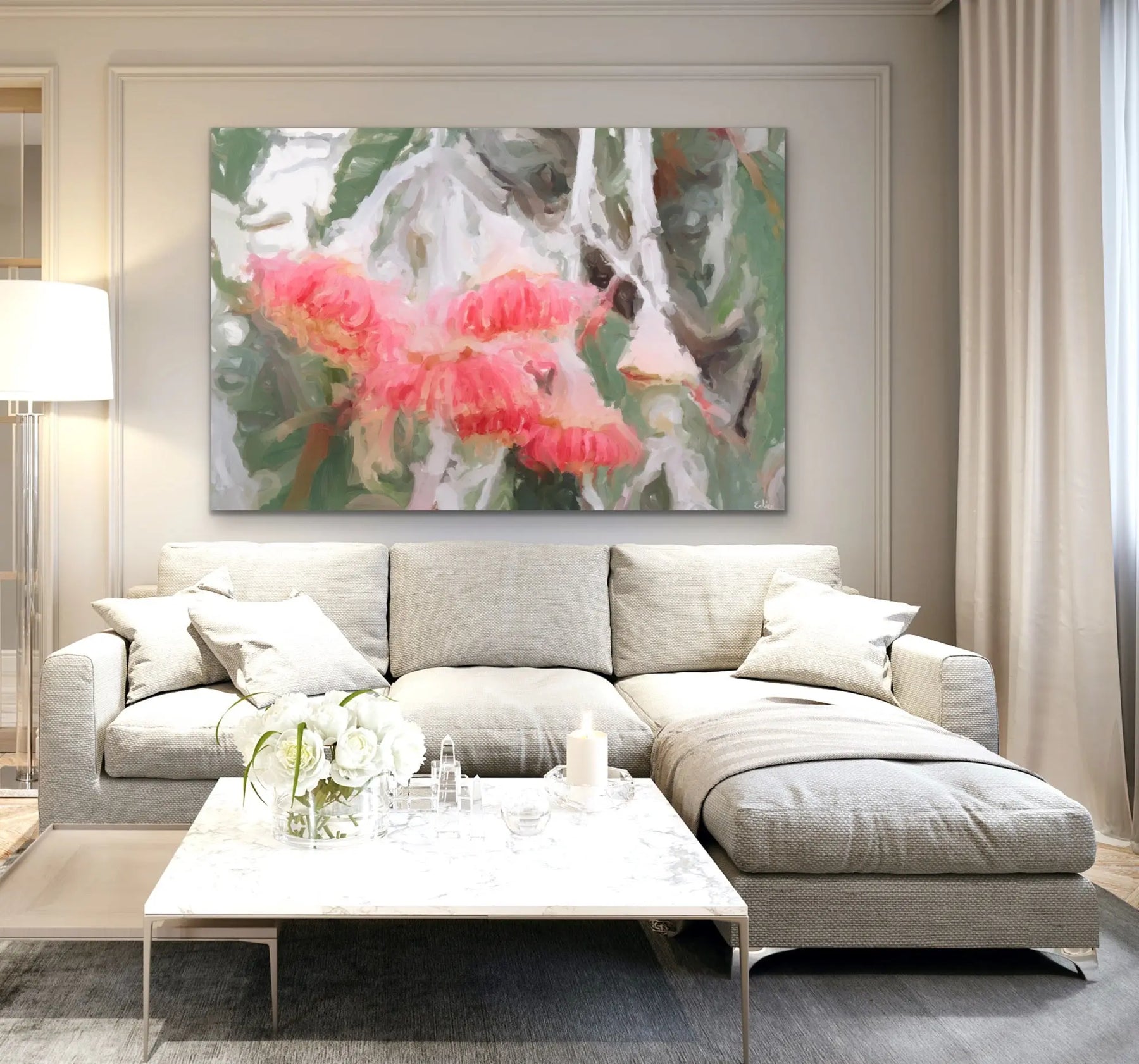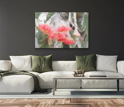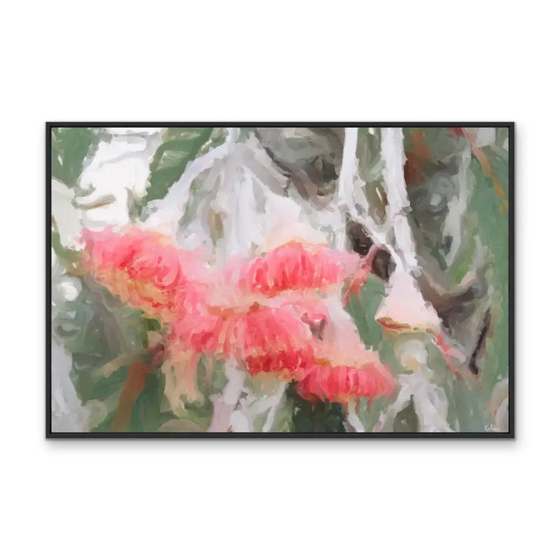 "We're so proud to introduce this new series of abstract artworks inspired by the colours and shapes of Australian Eucalyptus and protea blossoms. With a range of colours and shapes on offer, we hope you can find the perfect piece for your space. This is the ninth in the series, with tones of pink and silvery greens" -- Edie Fogarty, artist.