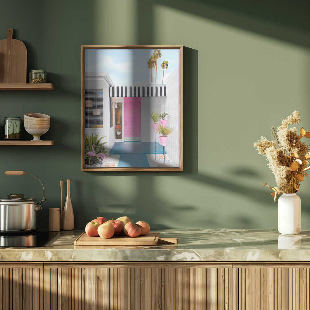 Explore our many print options for Pink Door with Yard Flamingos by artist Tom Windeknecht.