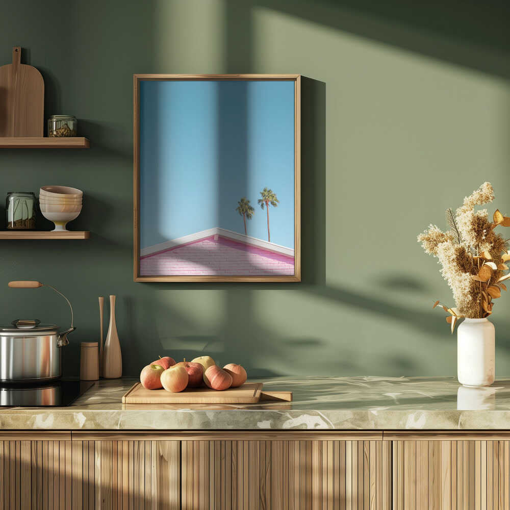 Explore our many print options for Pink Roofline with Palm Trees by artist Tom Windeknecht.