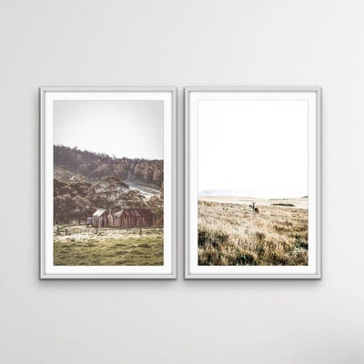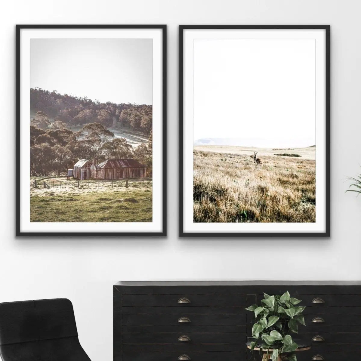 Fall in love with these beautiful photographic prints. Featuring a rundown cottage in the Blue Mountains and a kangaroo in a paddock, this two piece print set is pure Australiana.