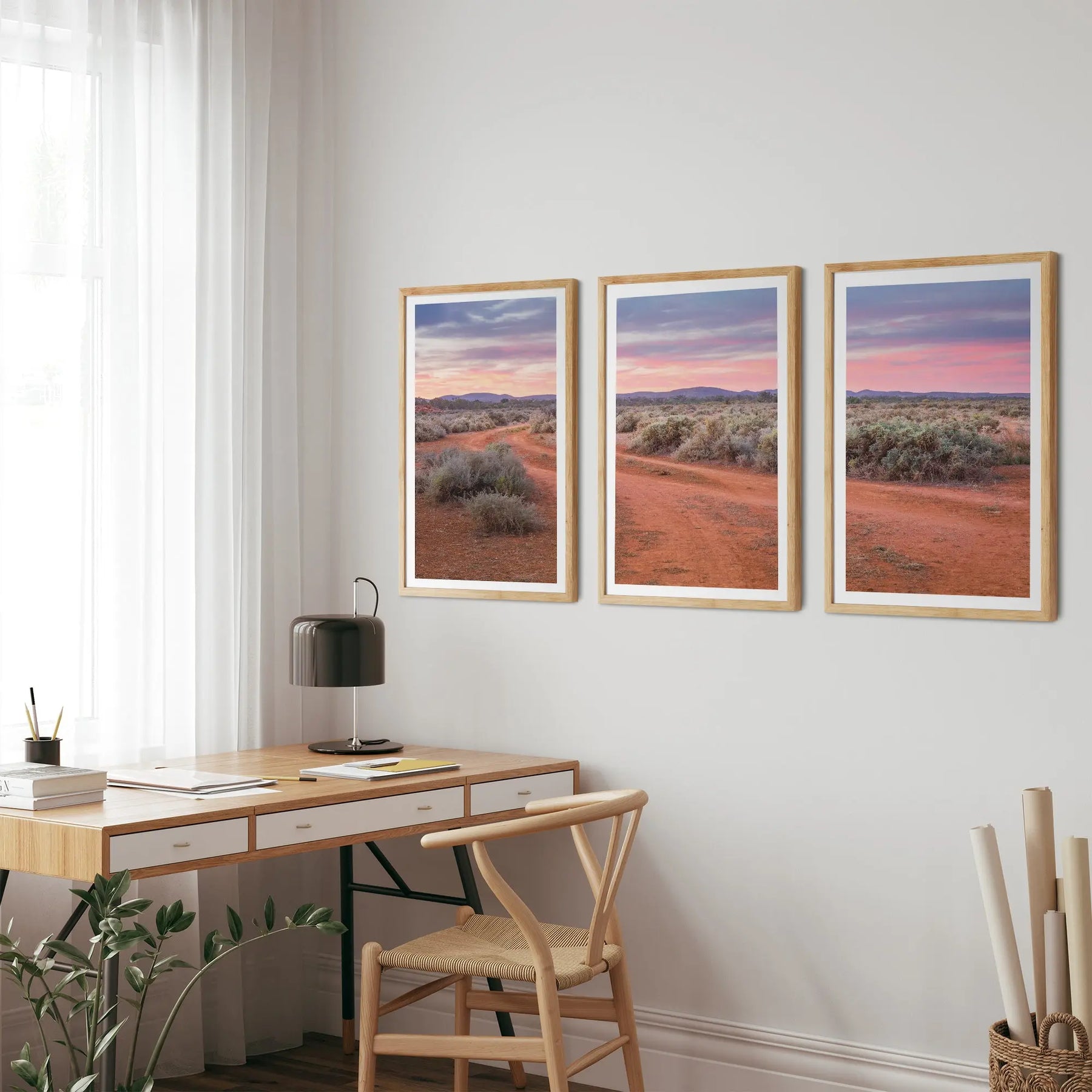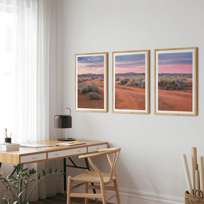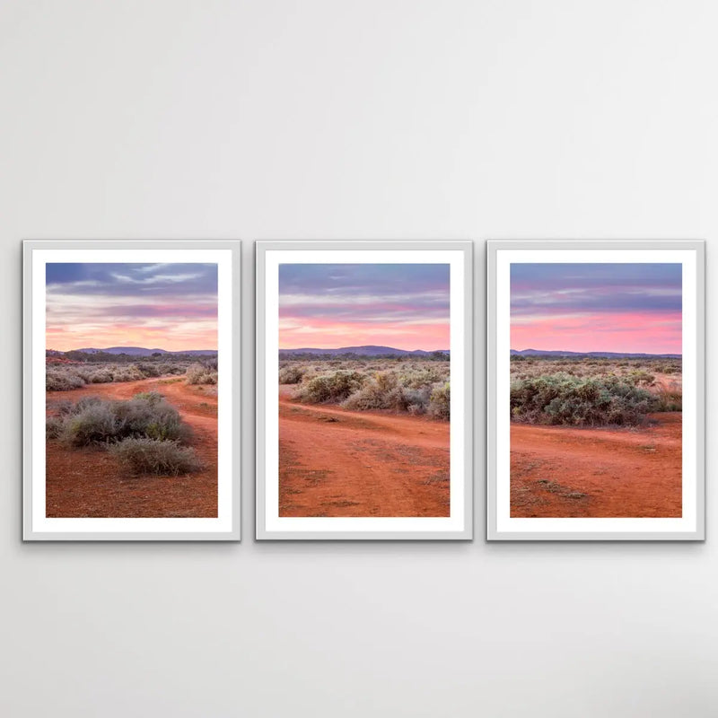 This stunning print set features a photograph of outback Australia with the sun setting over the horizon. In bold shades of pink and orange, this is an eye-catching and beautiful set.