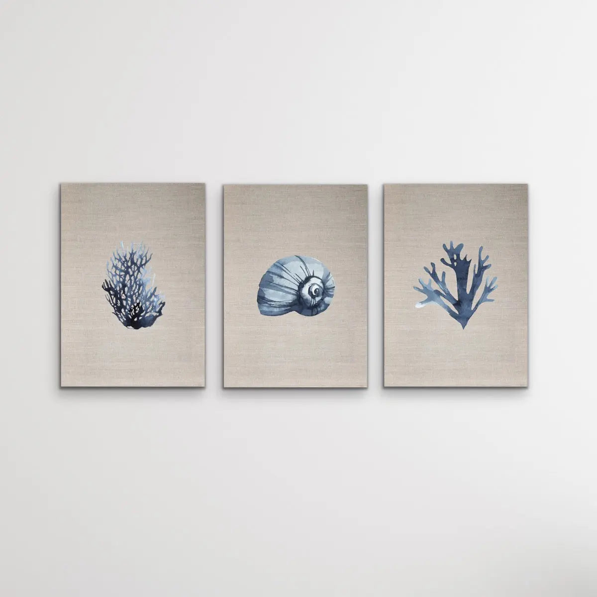 Hamptons Dark Coral On Linen Seaside Wall Art Prints - Three Piece Art Print Triptych - I Heart Wall Art