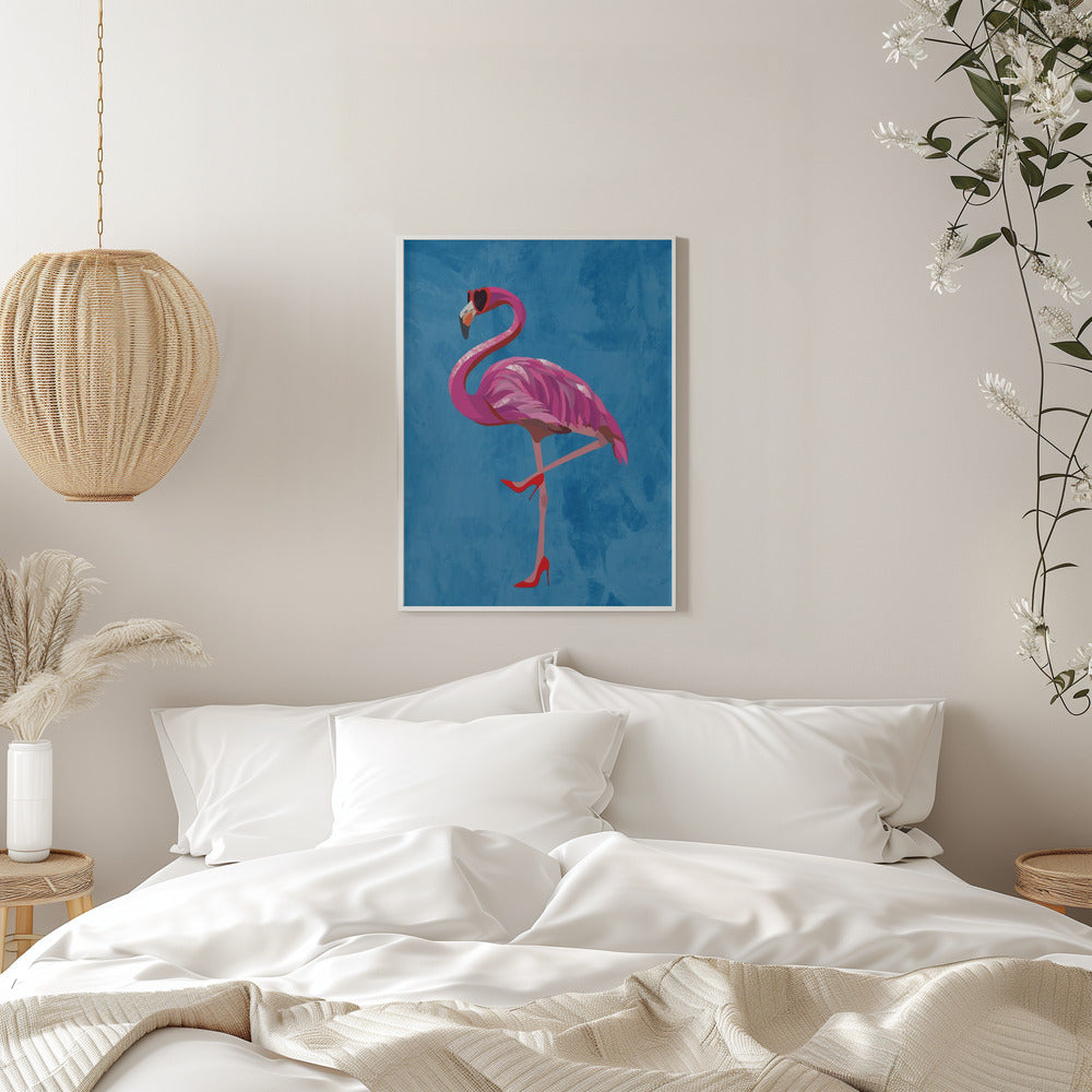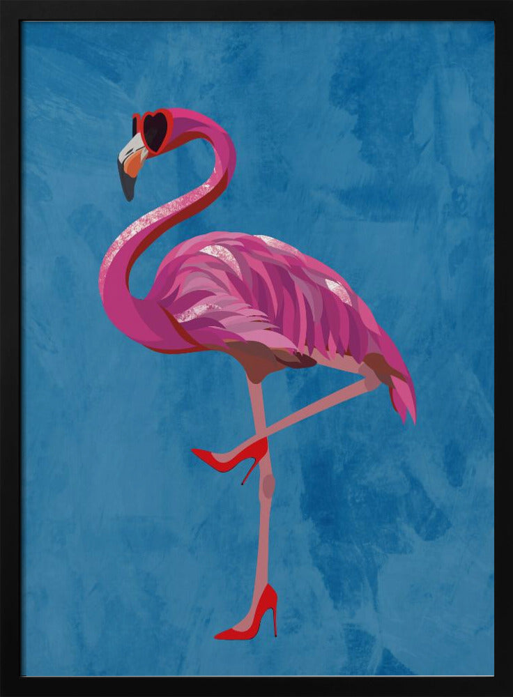 Explore our many print options for Flamingo in heels and heart glasses blue by artist Sarah Manovski.