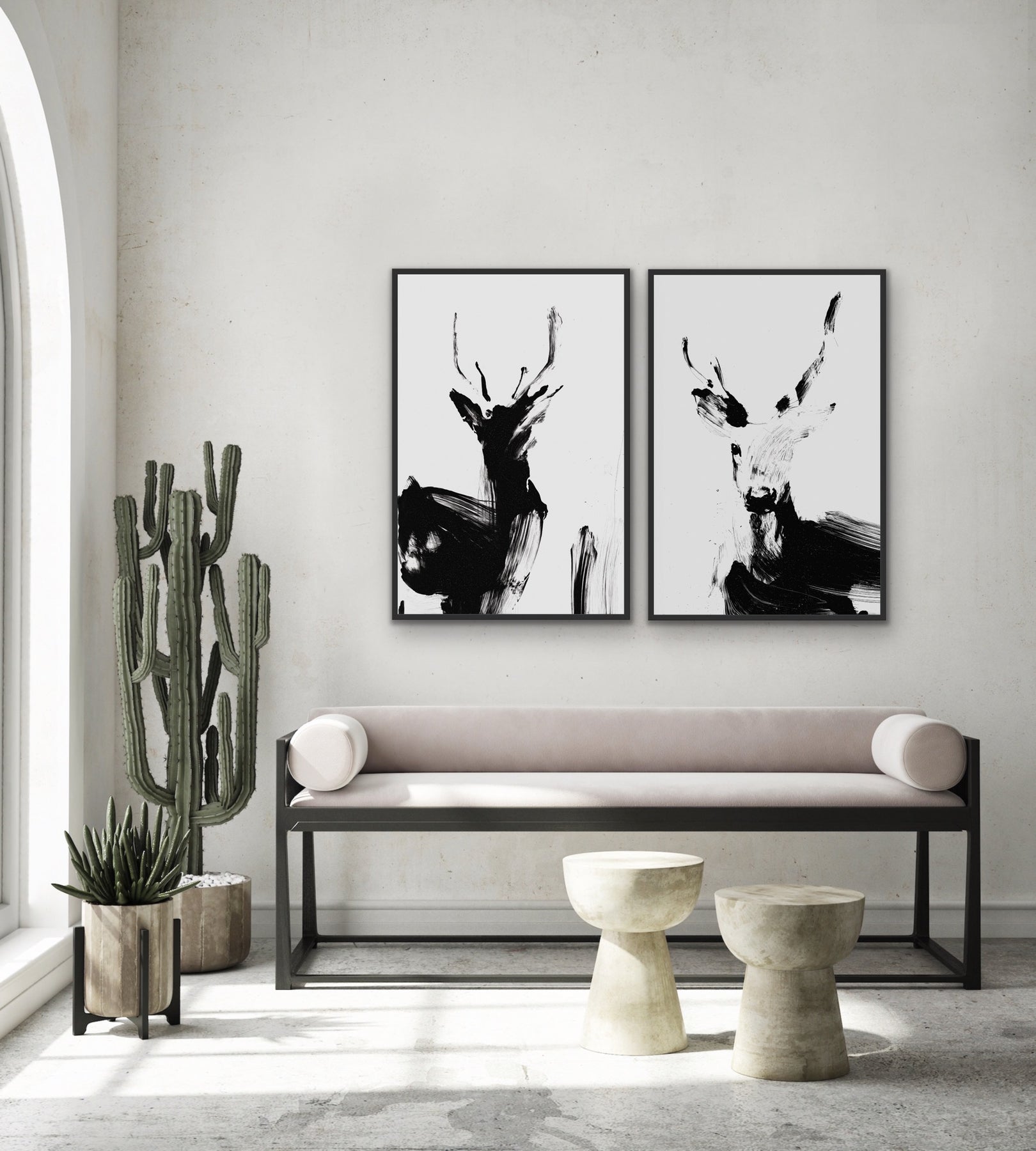 This dramatic set of two prints features fluffy white clouds against a dark blue sky, with specks of light calling from the distance.