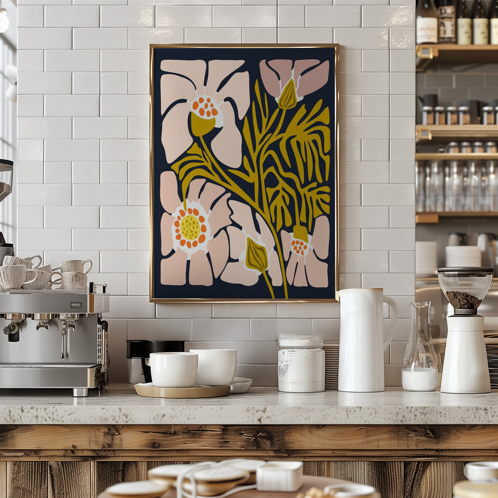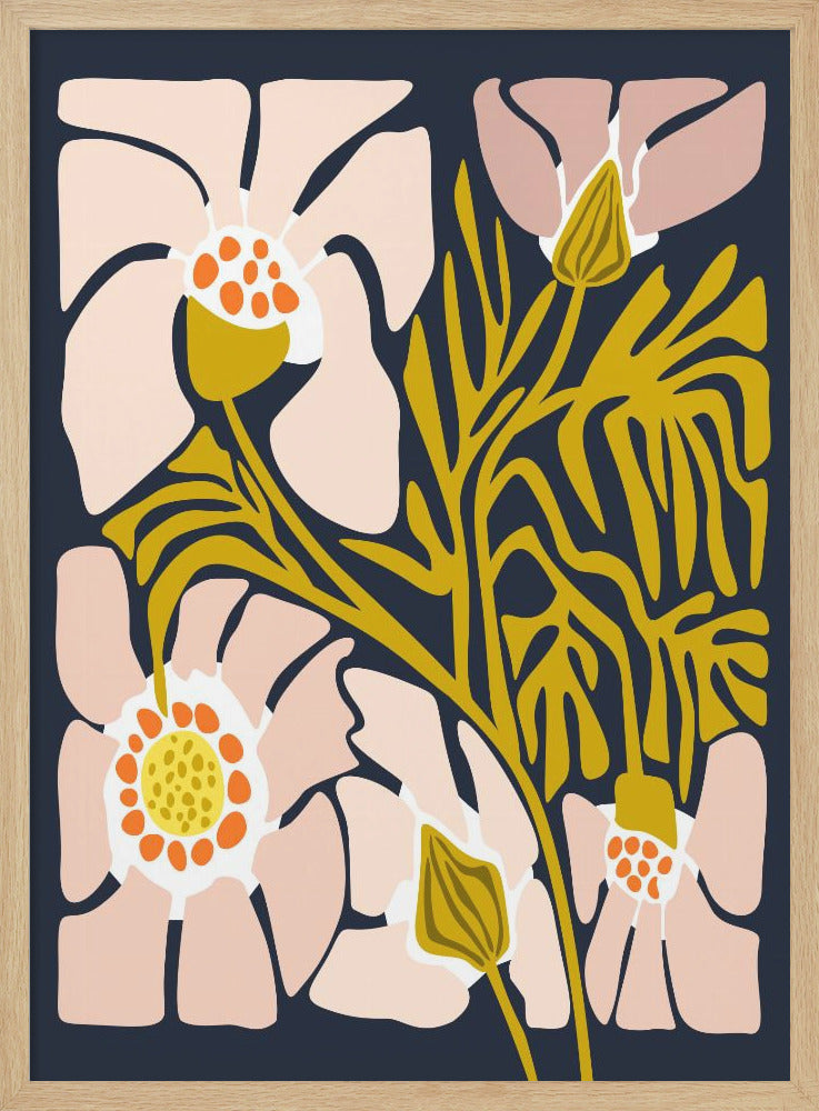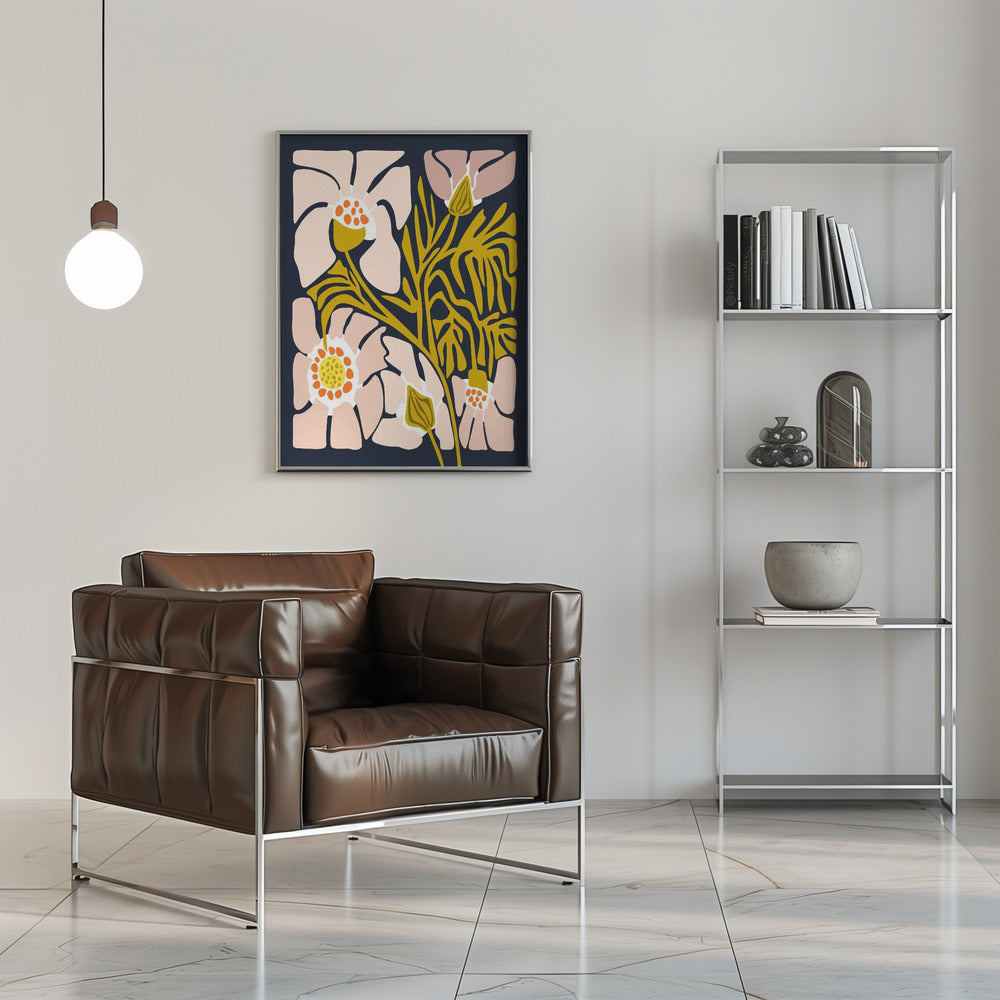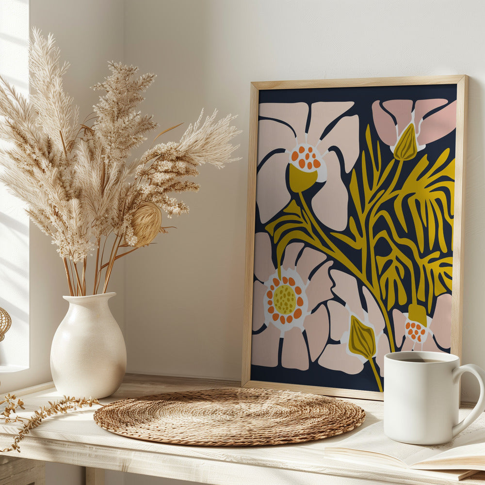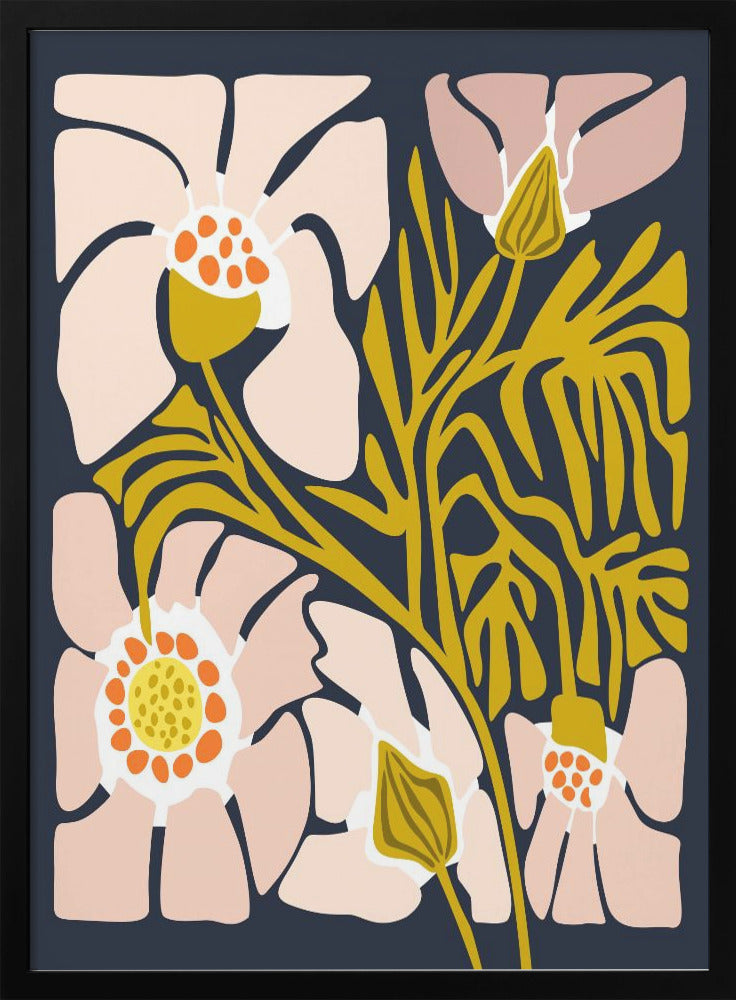 Explore our many print options for Backyard flower midnight blue by artist Annick.