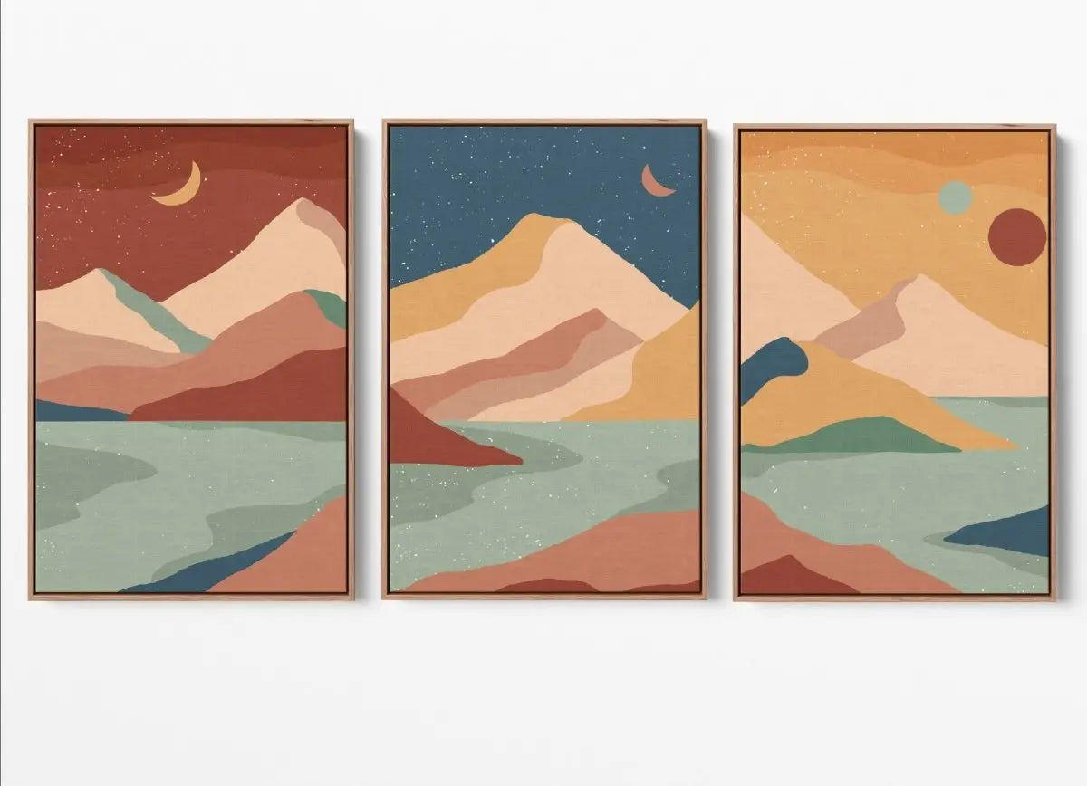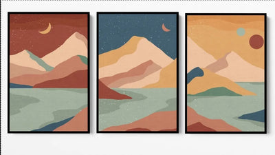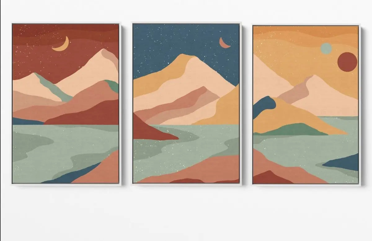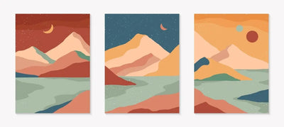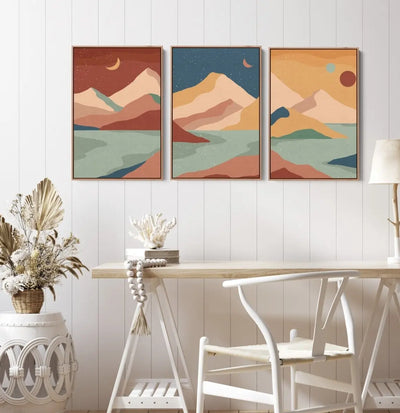 Boho Mountain Surreal Landscape Three Piece Art and Canvas Print Set Triptych