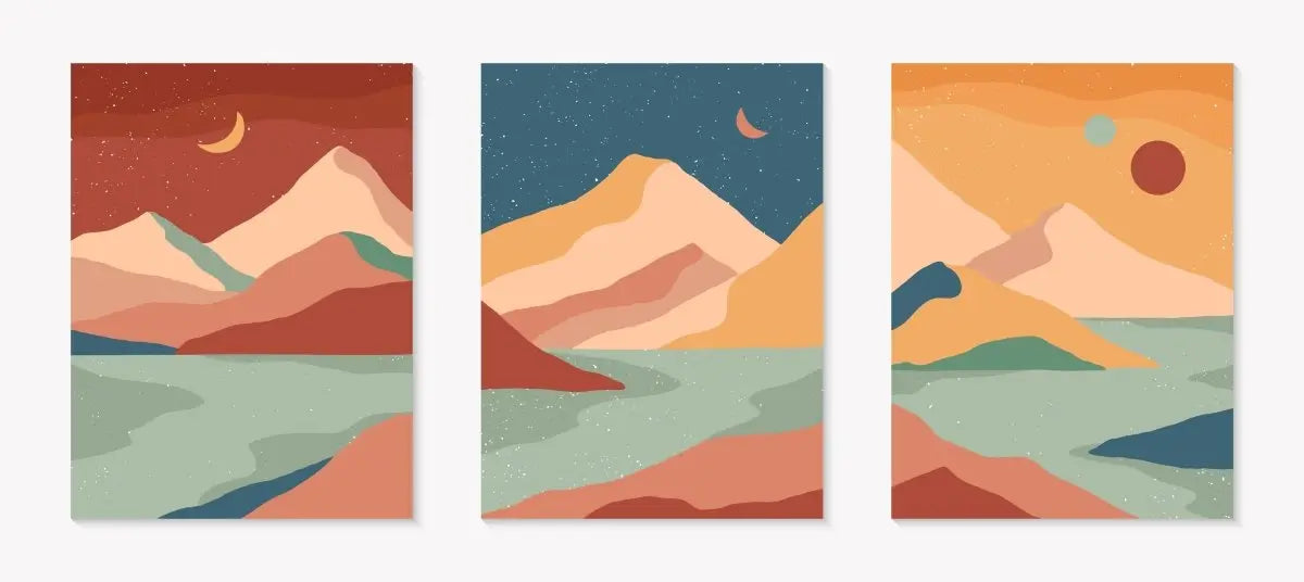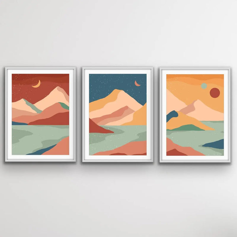 Boho Mountain Surreal Landscape Three Piece Art and Canvas Print Set Triptych - I Heart Wall Art - Poster Print, Canvas Print or Framed Art Print