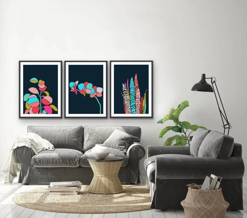 This beautiful three-piece canvas print set is bright, colourful, and on-trend. Featuring three botanical illustrations against a dark blue background, these fun colourful illustrations will bring life to any space.