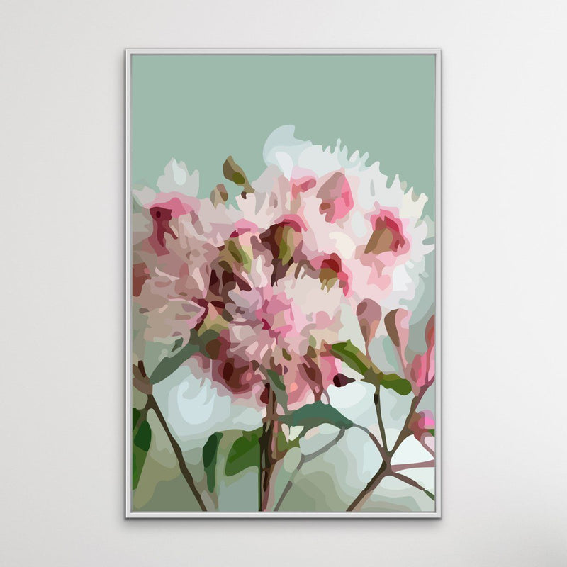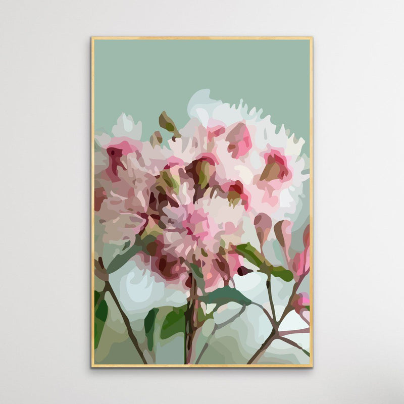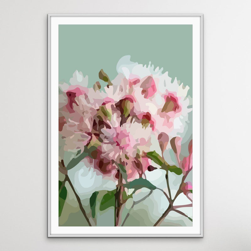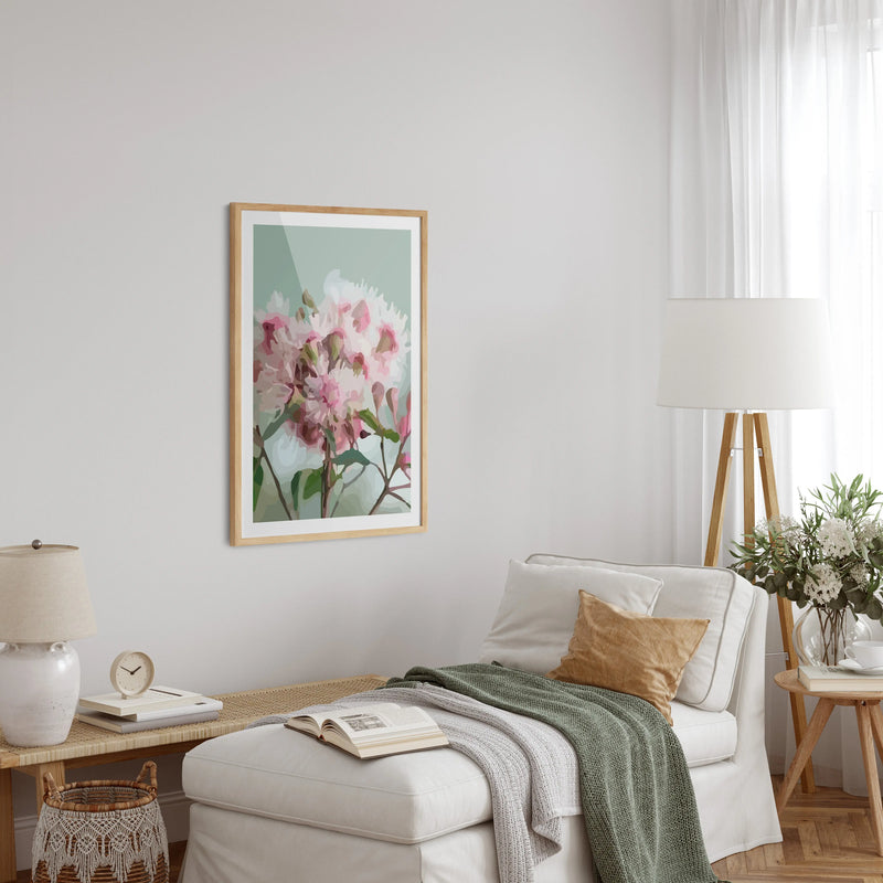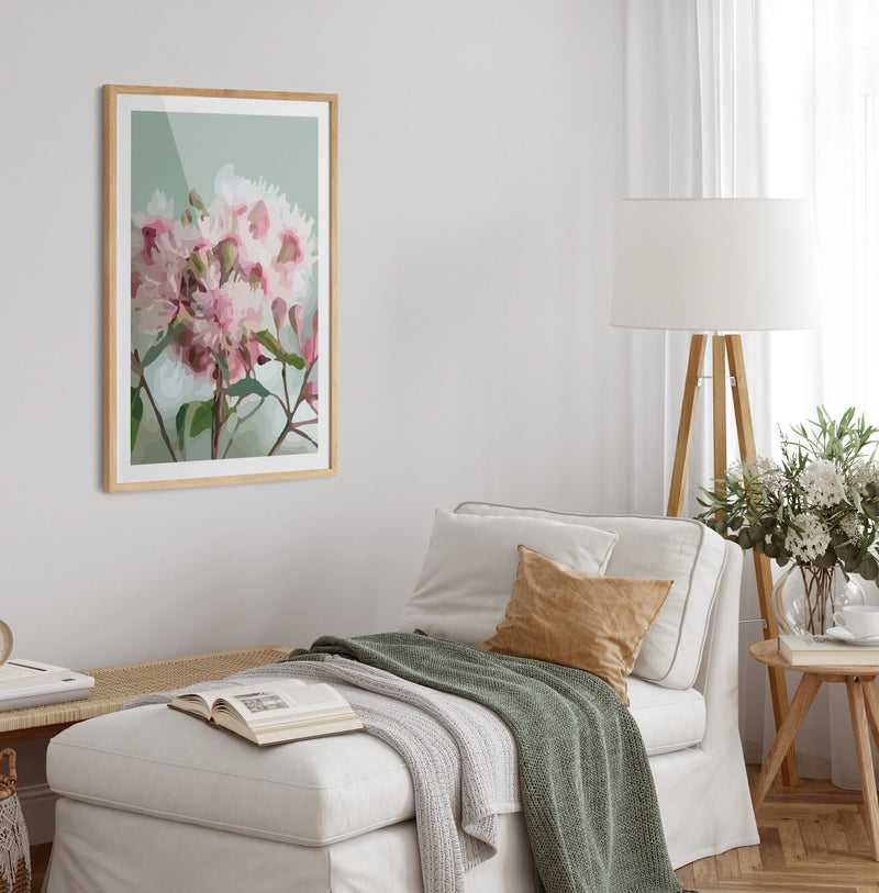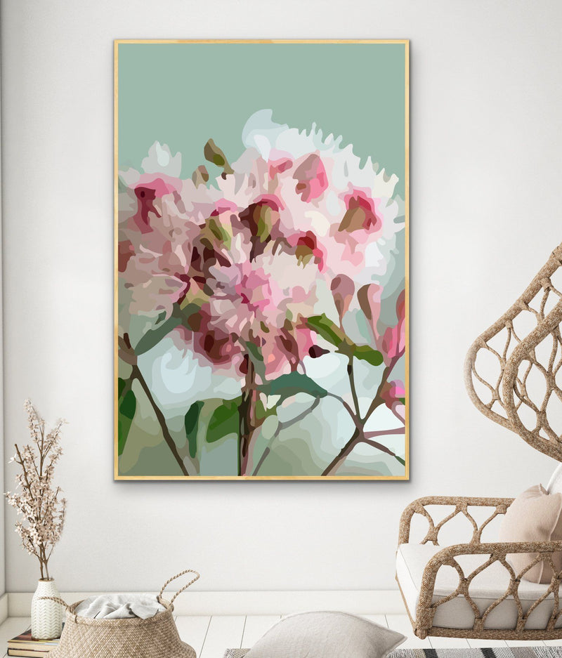 This fun contemporary print features a rendering Australian Gum Blossom against a light green background.
