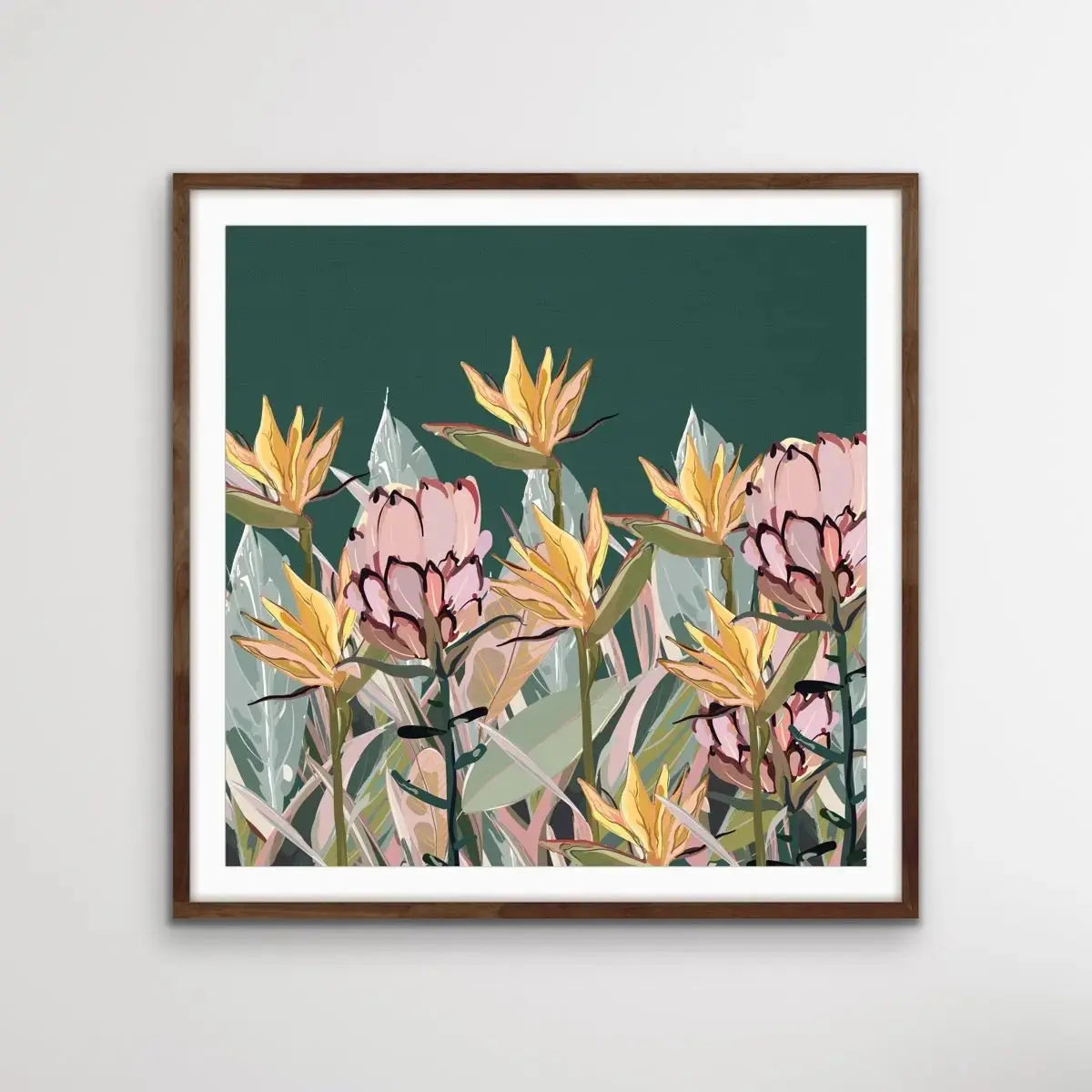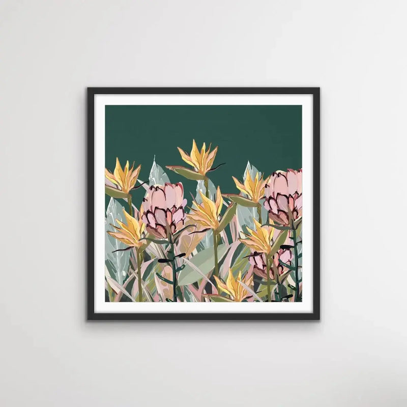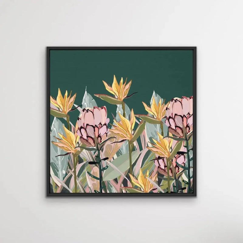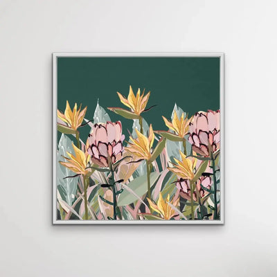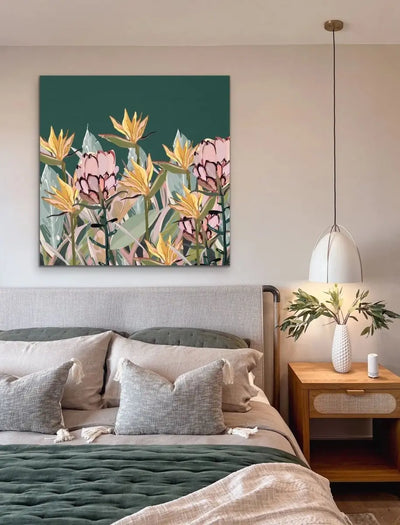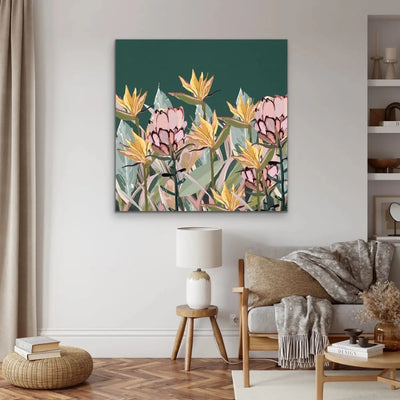 This beautiful canvas print features a gorgeous pastel selection of native and nearly-native Australian plants including Bird of Paradise and Proteas.