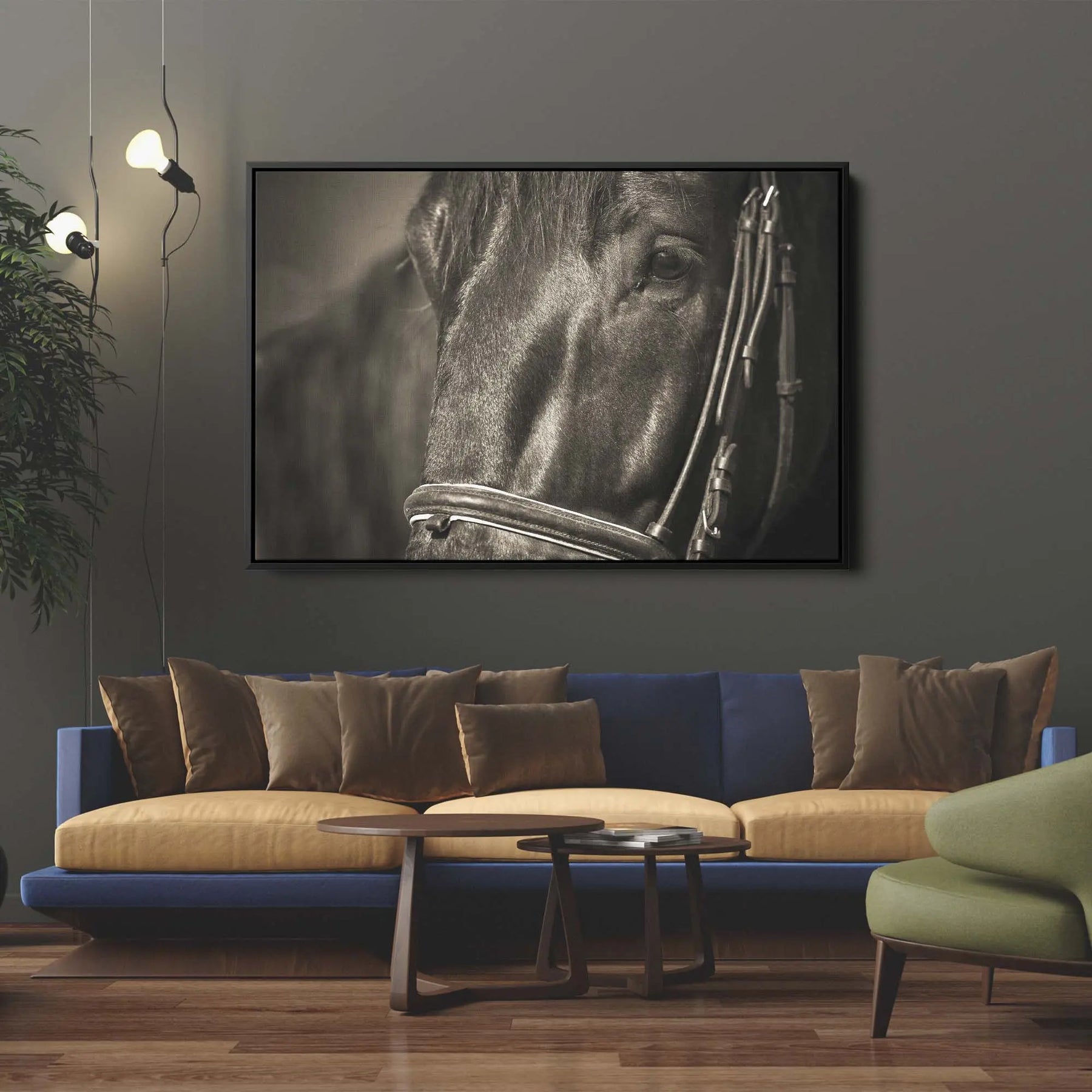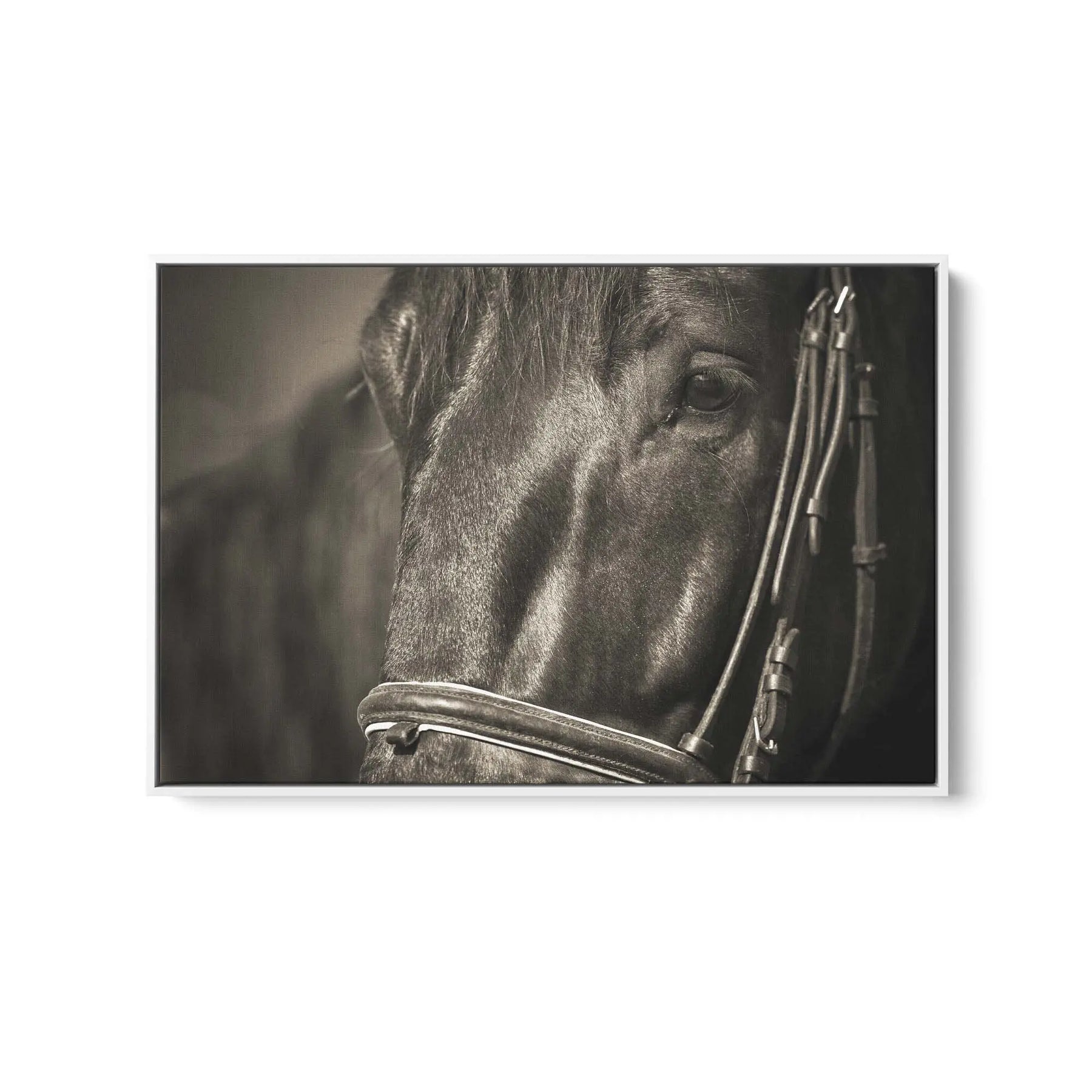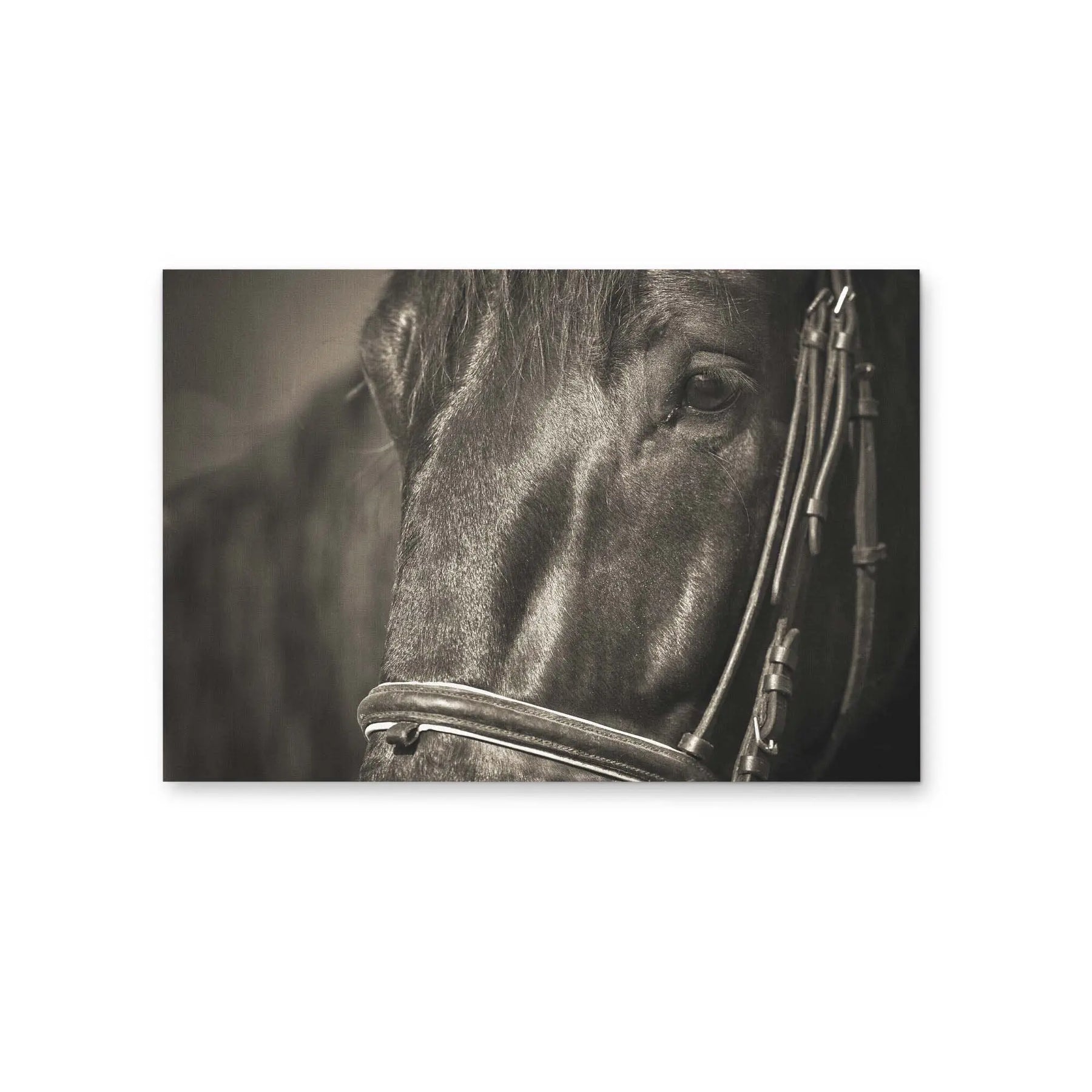 A close-up image of a dark-colored horse, focusing on the left side of its face.