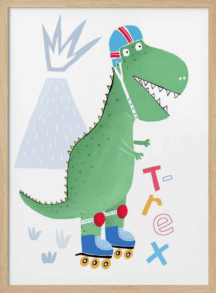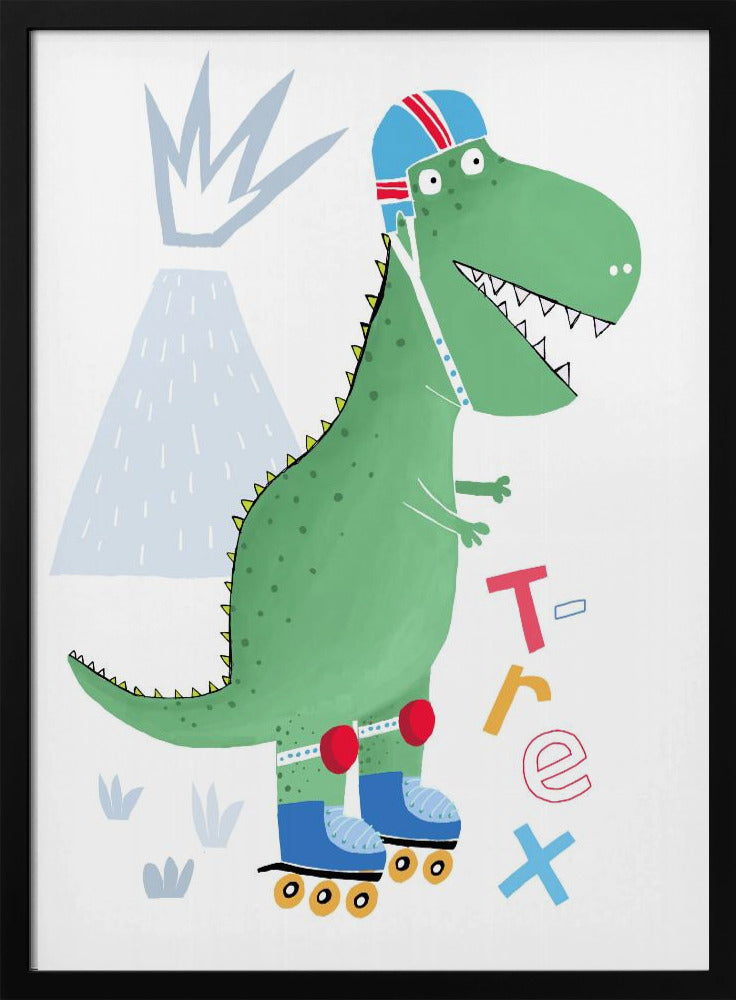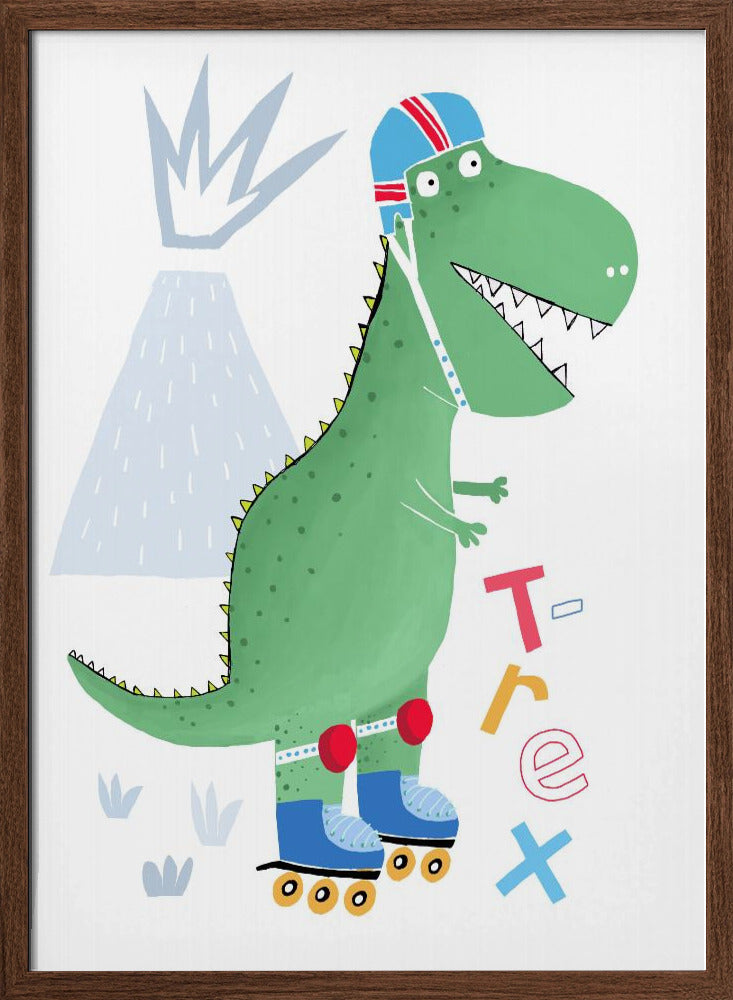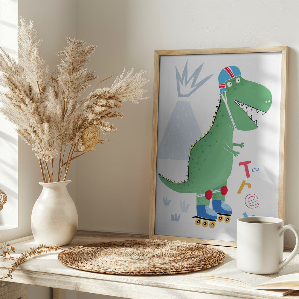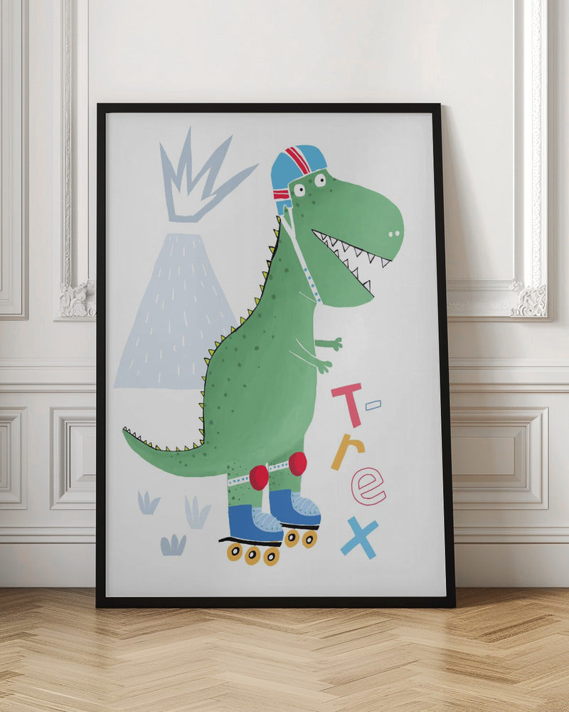 Explore our many print options for Funny T-Rex on Rollerblades with Volcano by Artist Carla Daly by artist Carla Daly.