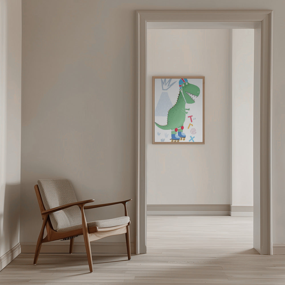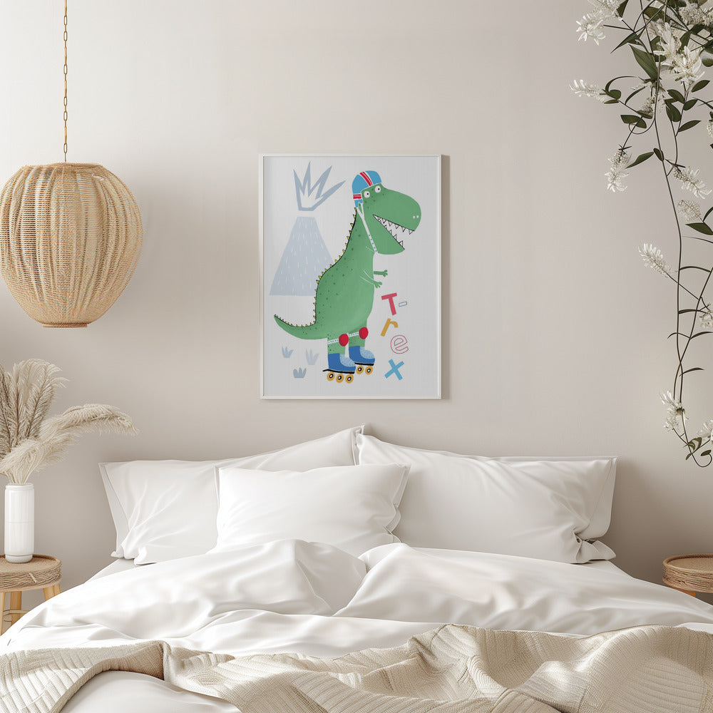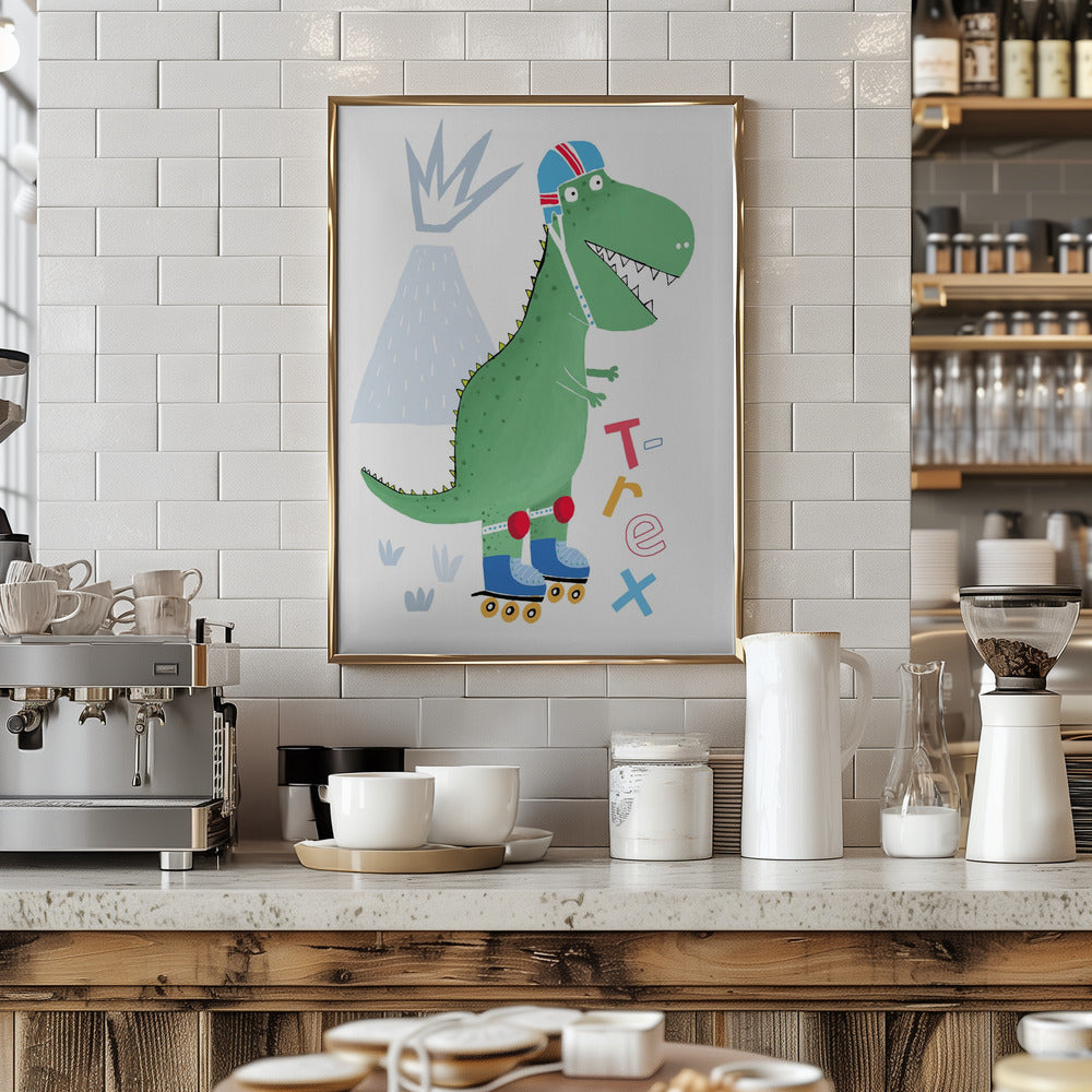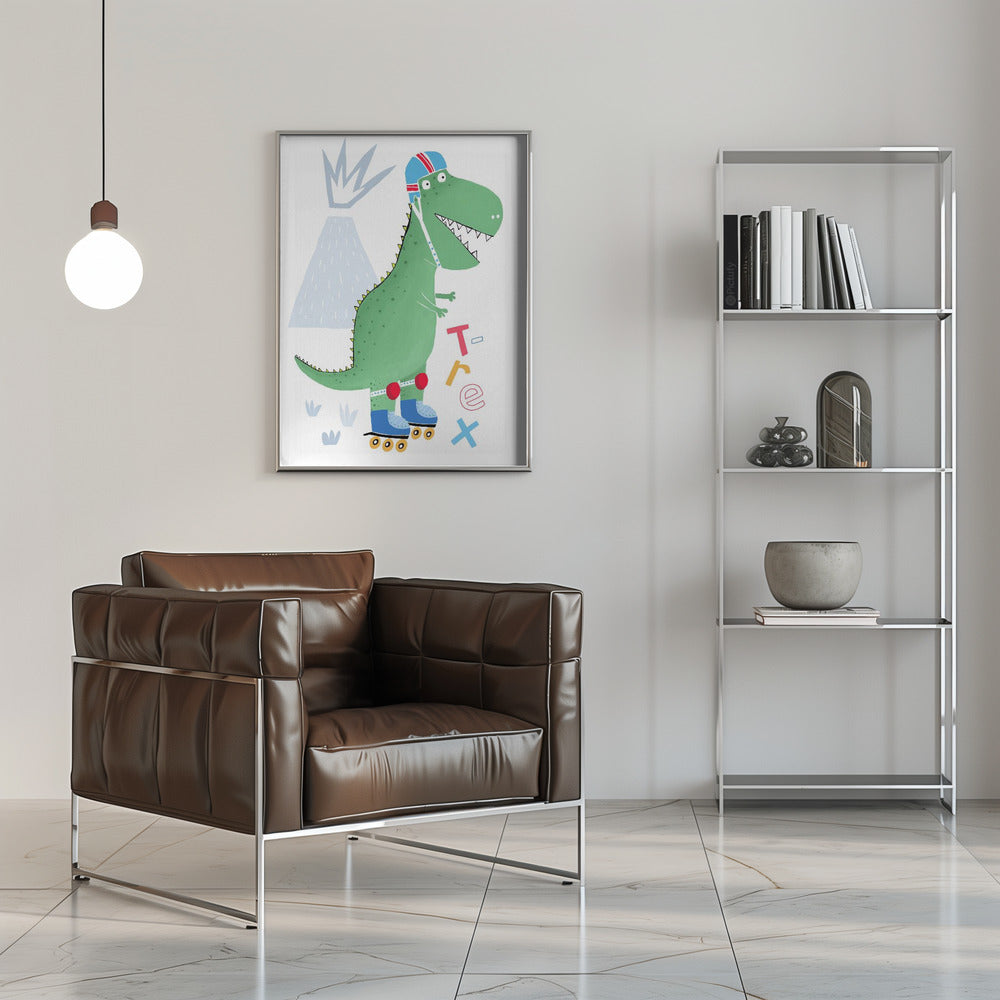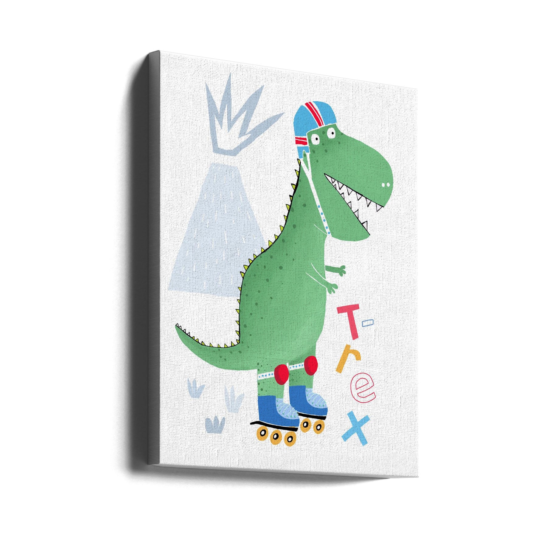 Explore our many print options for Funny T-Rex on Rollerblades with Volcano by Artist Carla Daly by artist Carla Daly.