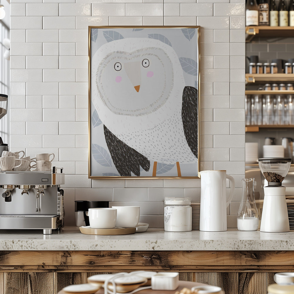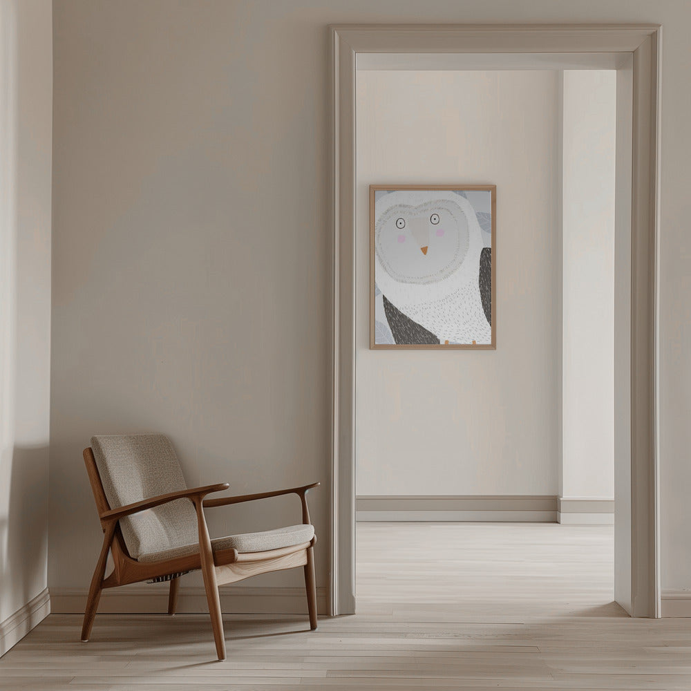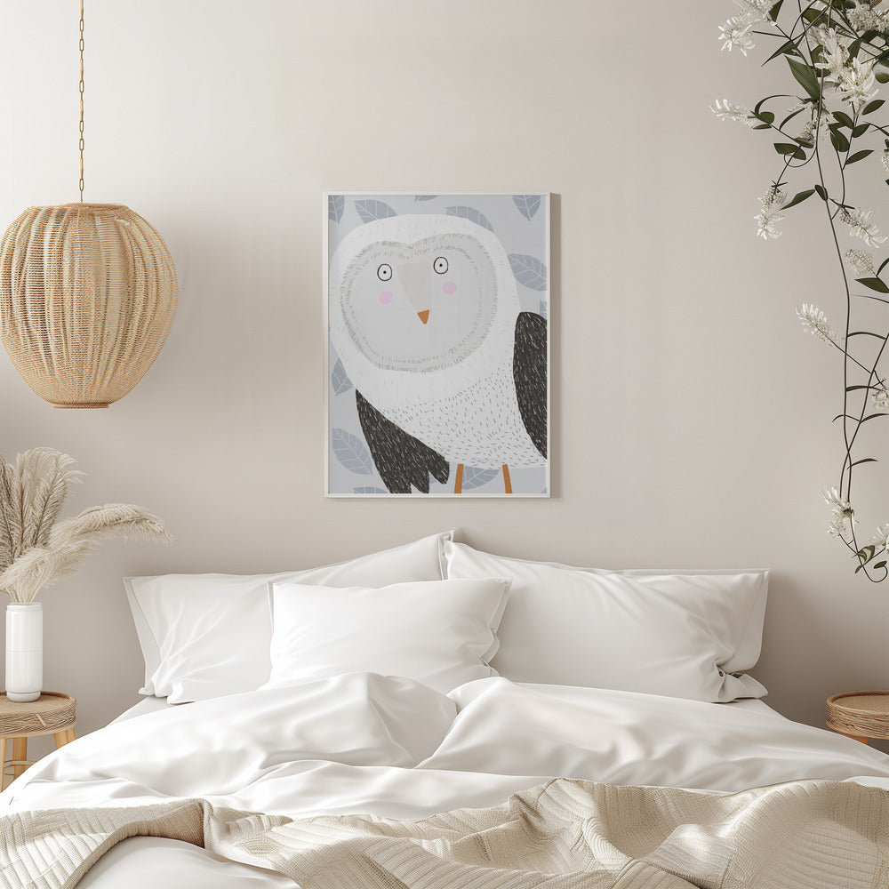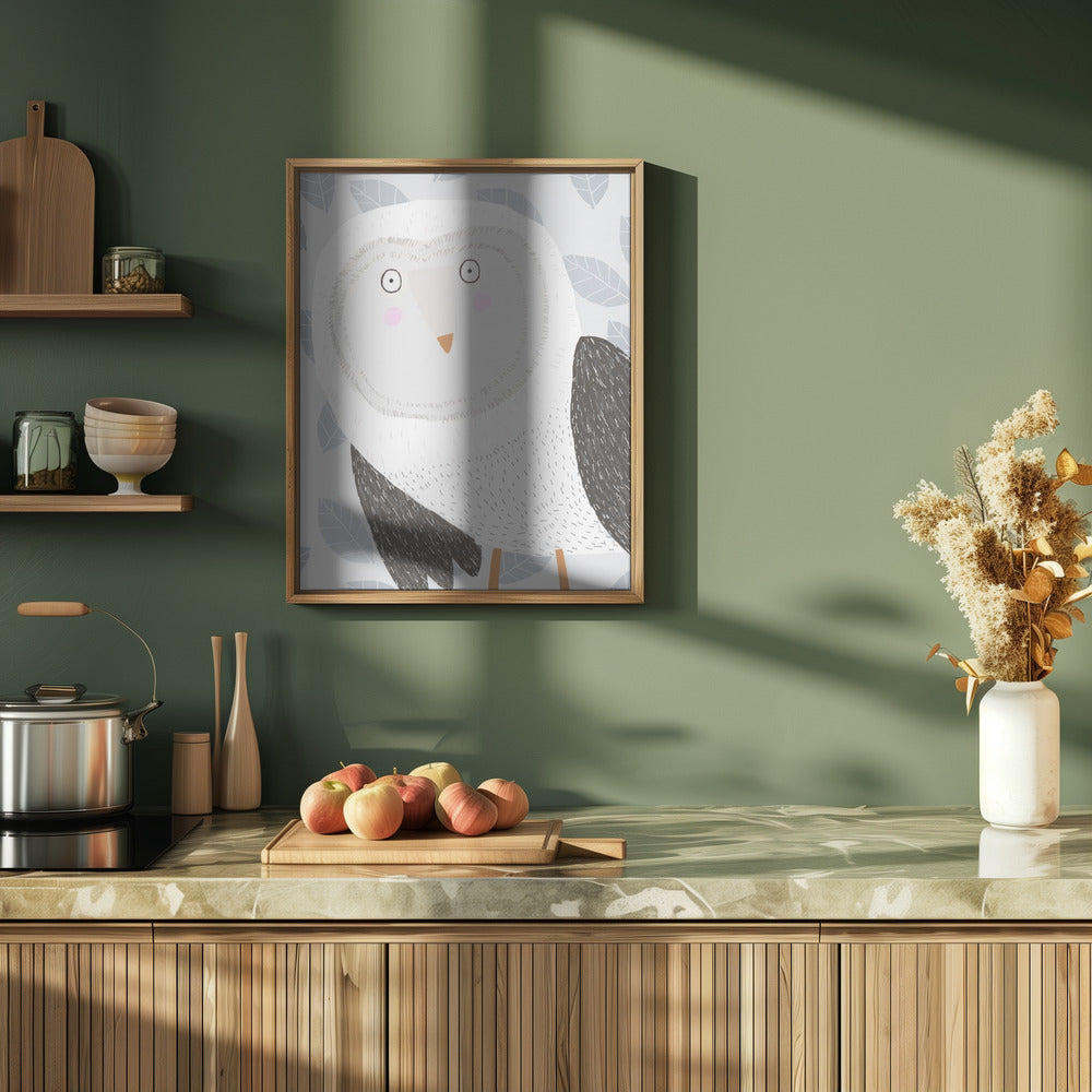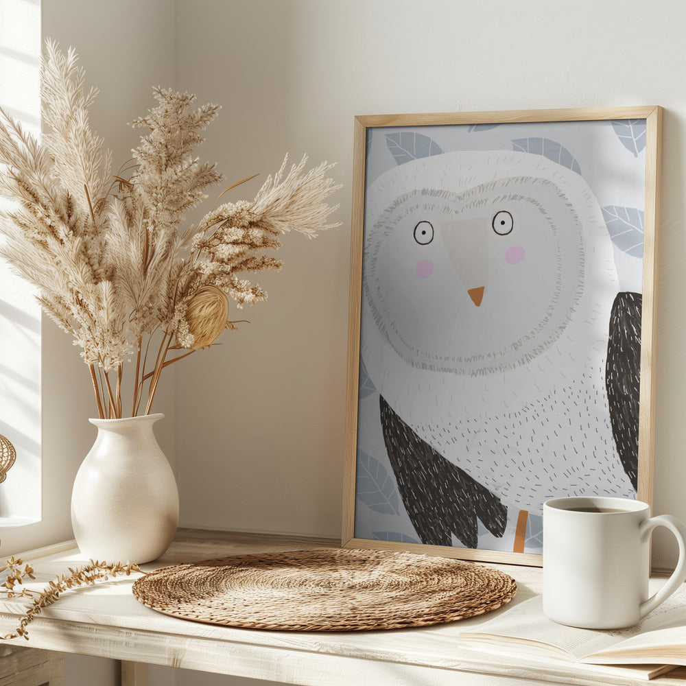 Explore our many print options for Funny Winter Owl with Grey Leaf Pattern by Artist Carla Daly by artist Carla Daly.
