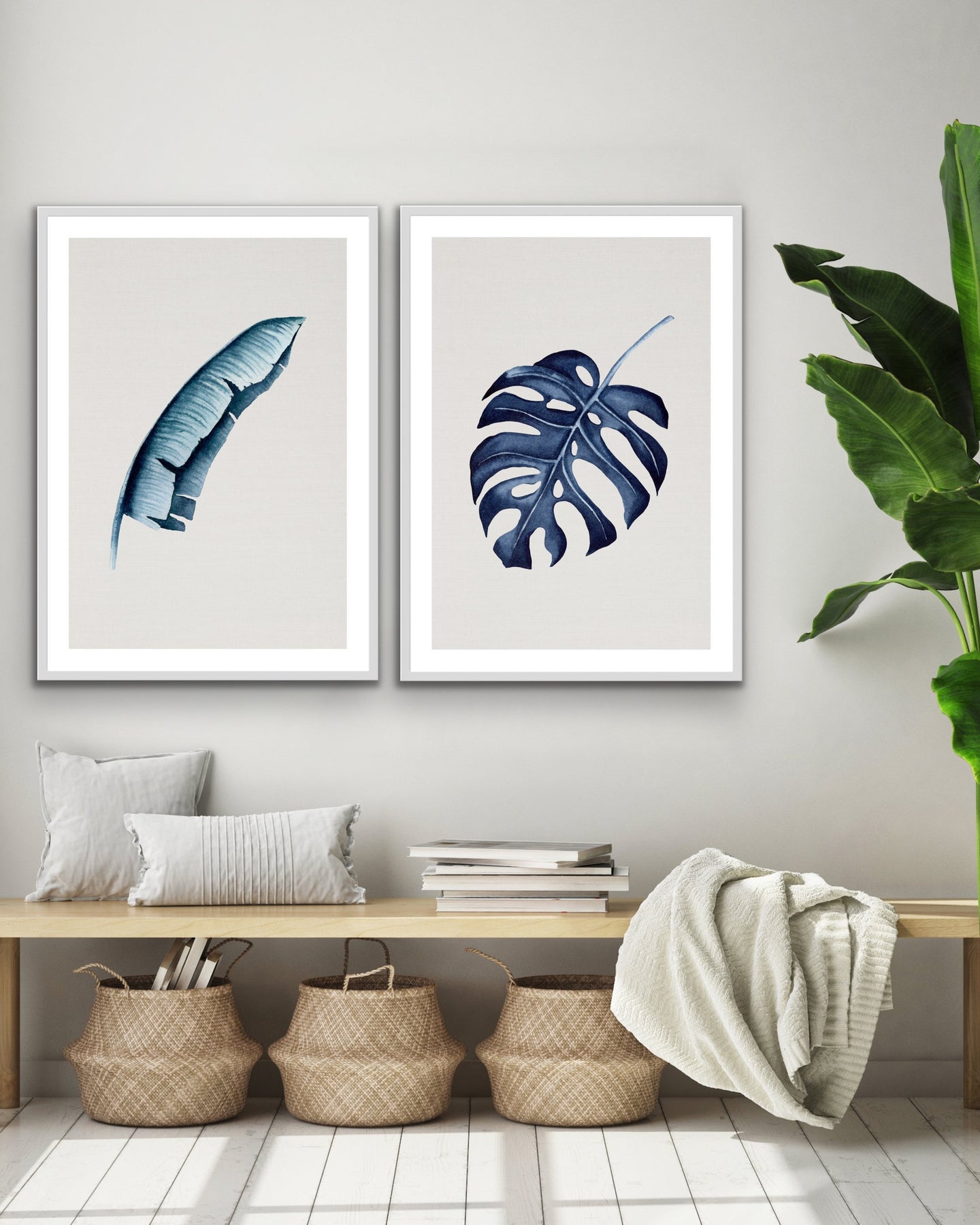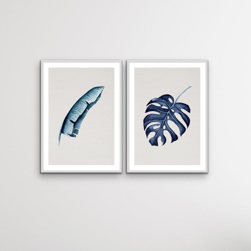 This gorgeous print set features two beautiful watercolour illustrations - one of a banana leaf and one of a monstera leaf - rendered against a light grey linen background.