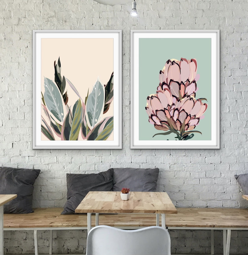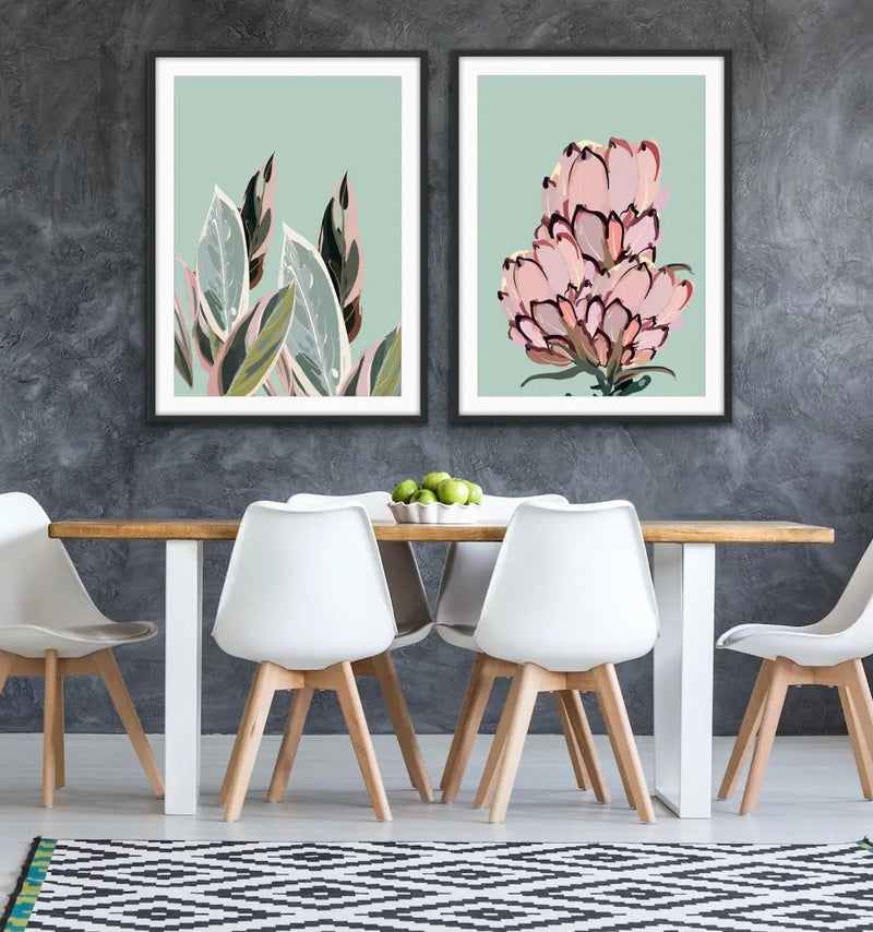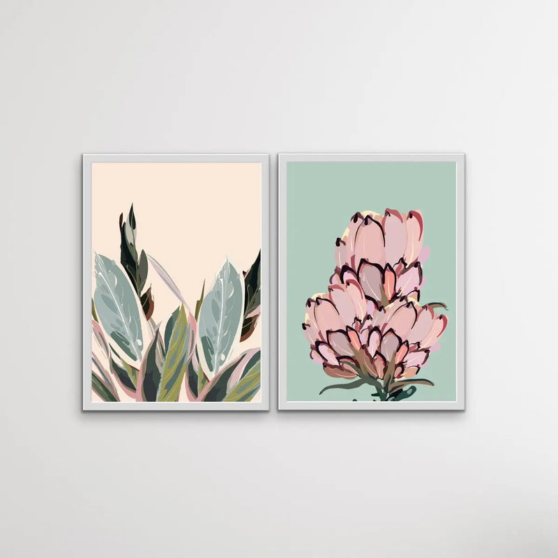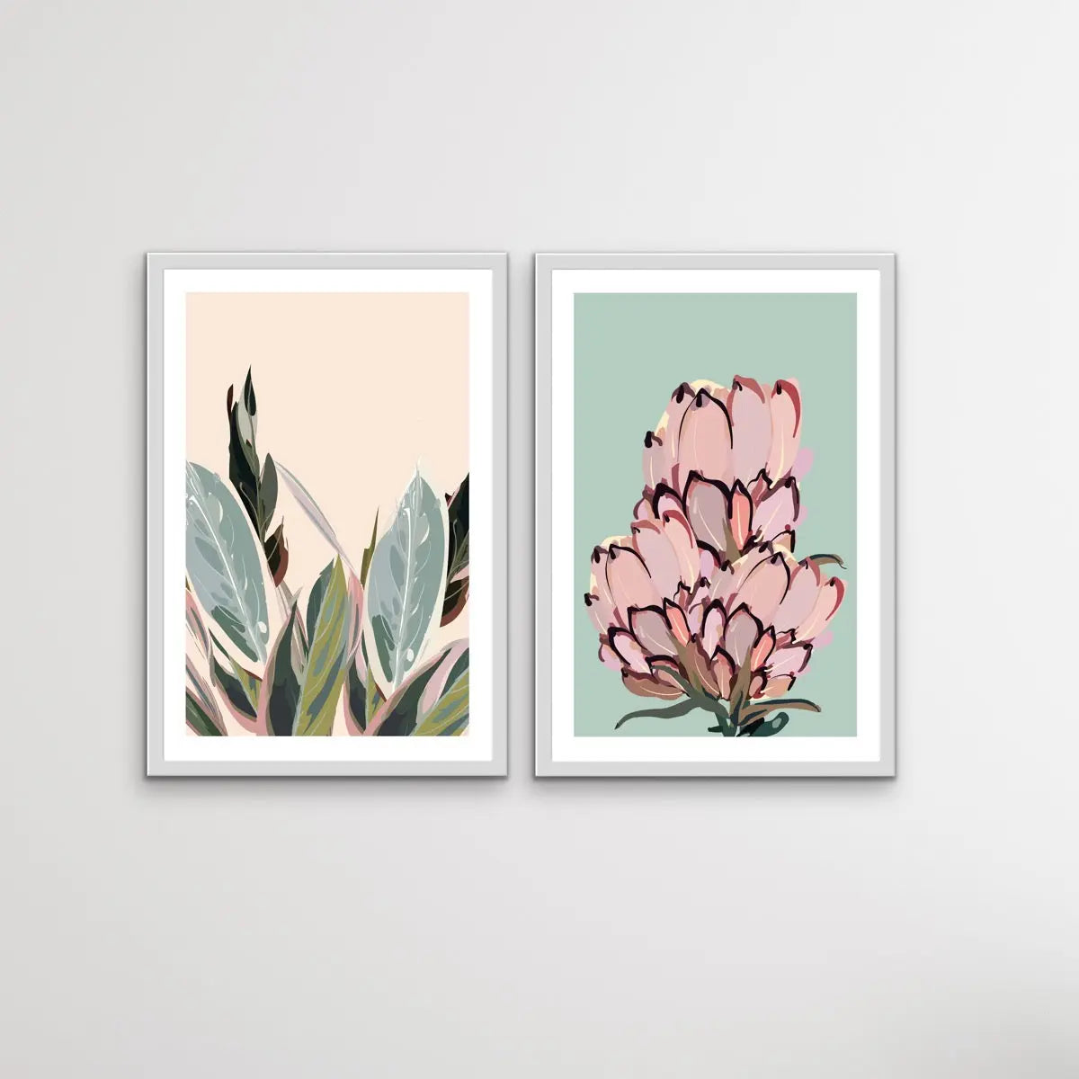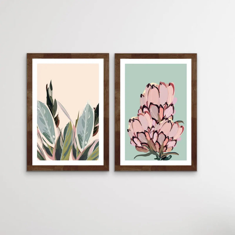 This gorgeous print set features two original floral illustrations. The perfect set for contemporary home styling, these protea and jungle plant leaf prints are perfect together or apart.
