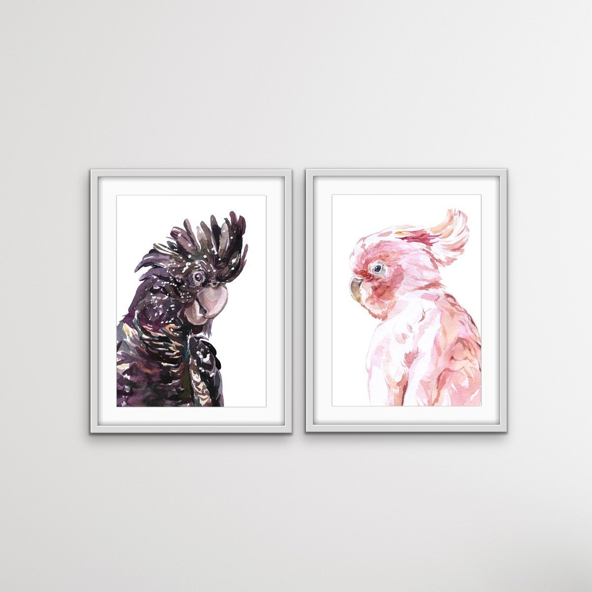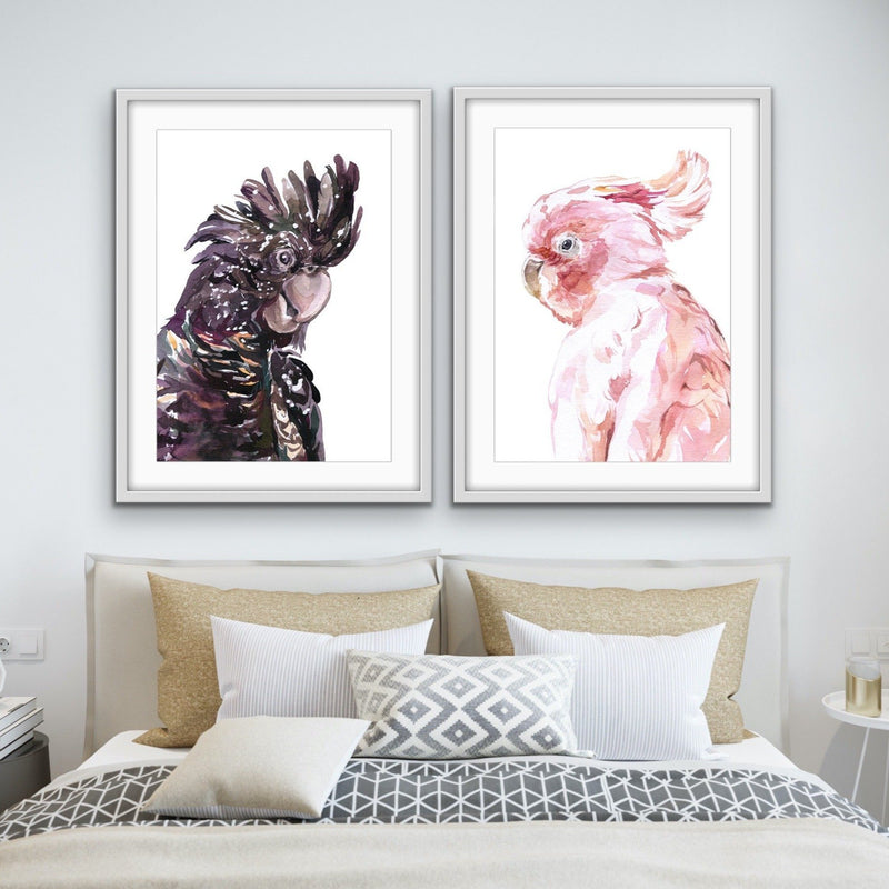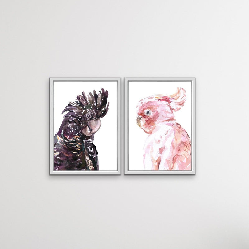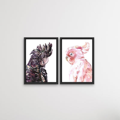 This sweet pair of watercolour paintings feature a pink cockatoo and black cockatoo. This set comes with awhite background but the design is also available with a linen background.