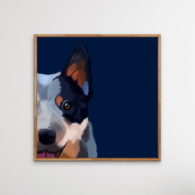 This beautiful cattle dog print is designed for every lover of the iconic Australian Cattle Dog or Blue Heeler. The background colour can be customised for your decor.