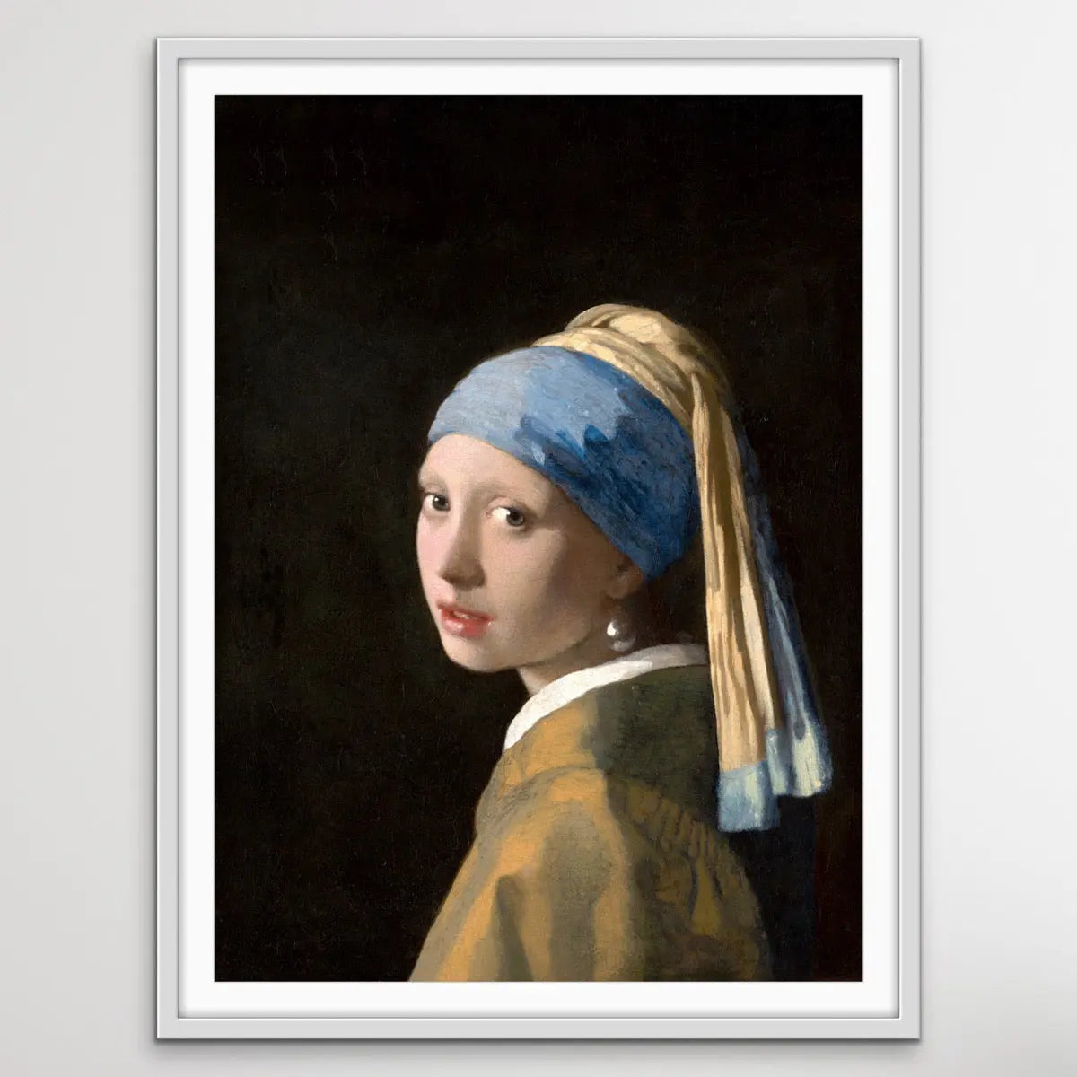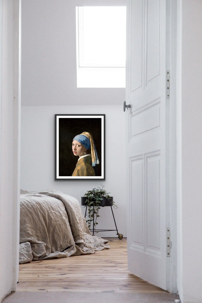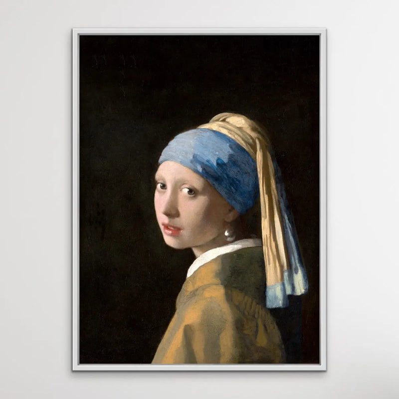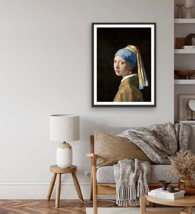 This is a striking print, adapted from classic painting Girl with a Pearl Earring by Dutch Golden Age painter Johannes Vermeer, dated c. 1665.