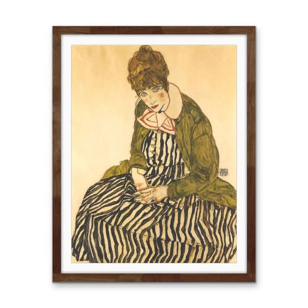 Portrait of Edith Schiele with Striped Dress, Sitting was created by Austrian painter Egon Schiele. in 1918. The portrait features the artist's wife.