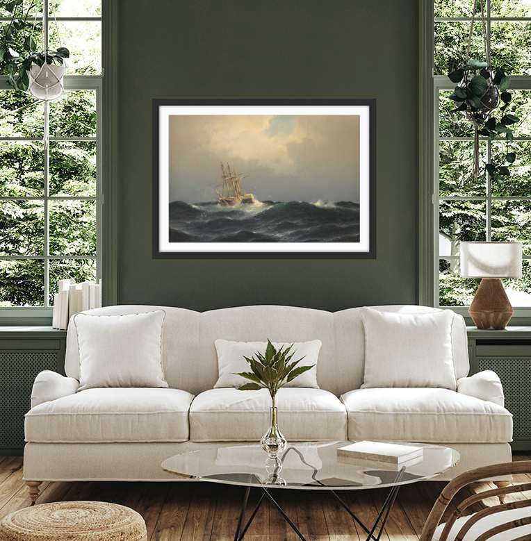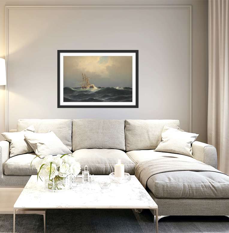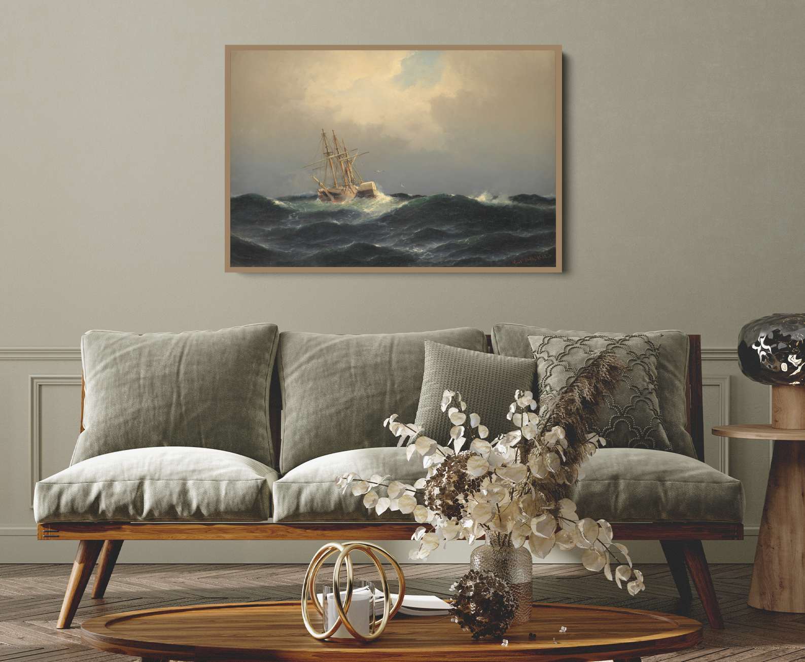 A stunning quality reproduction of this dramatic ocean painting featuring a ship at sea, by Danish marine artist Carle Bille.