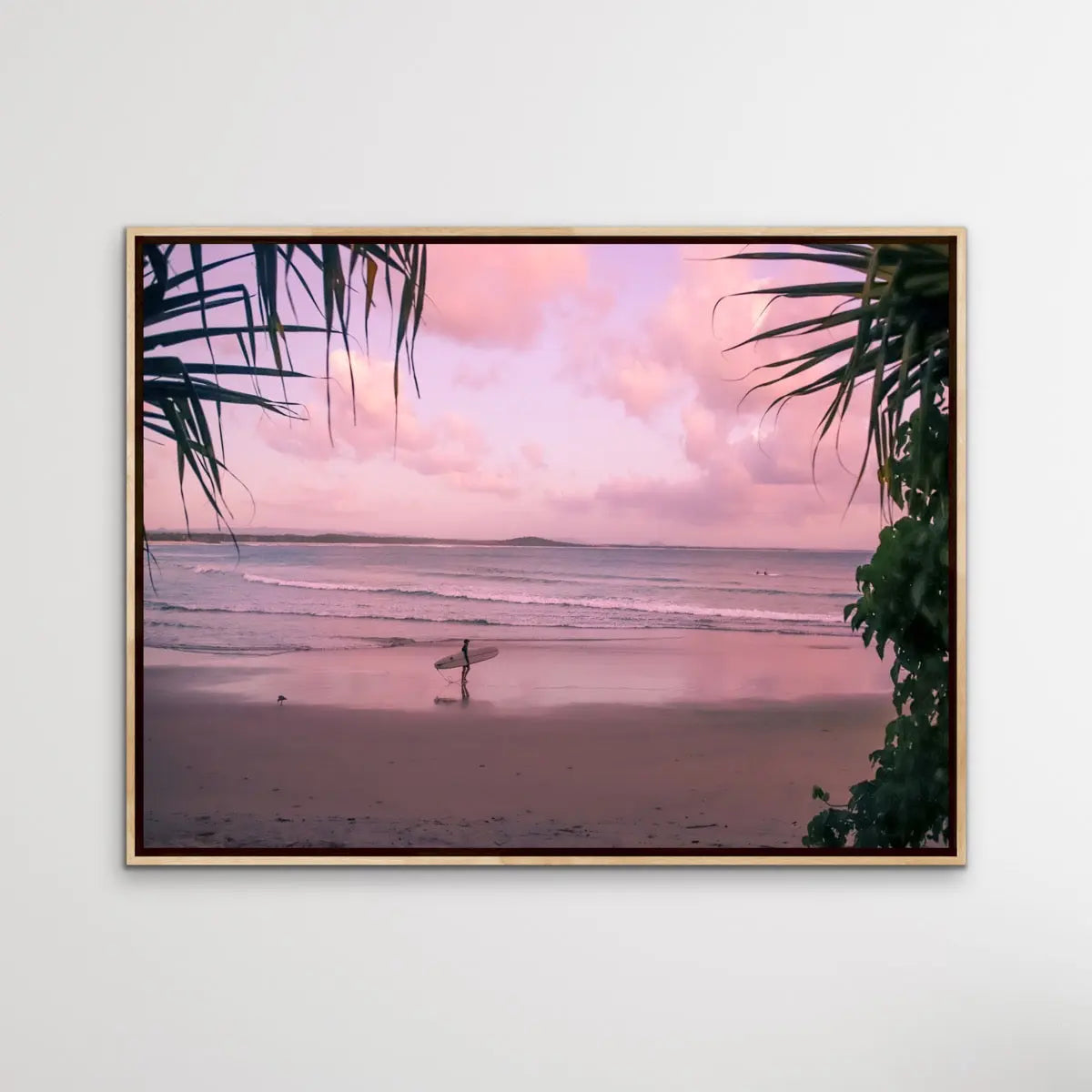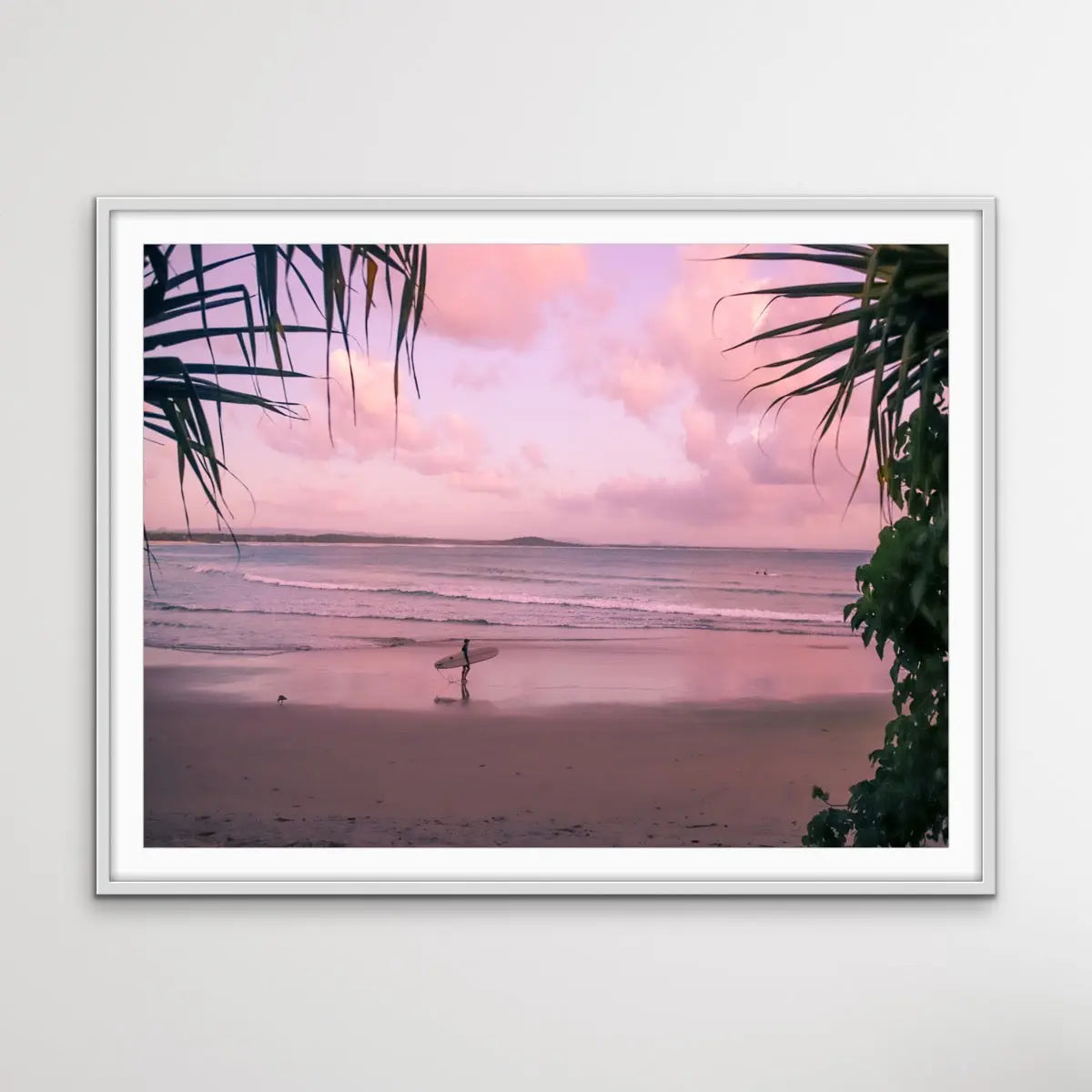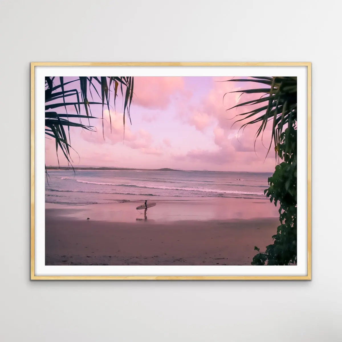 This print shows a sole surfer on Noosa's Main Beach at dawn. Slightly soft and dreamy in feel, this is a great choice for anyone looking to capture a bit of Noosa's magic in their home.