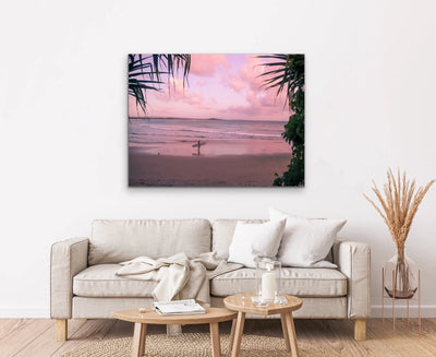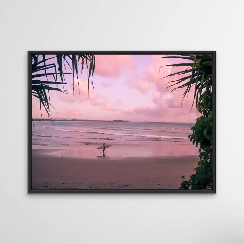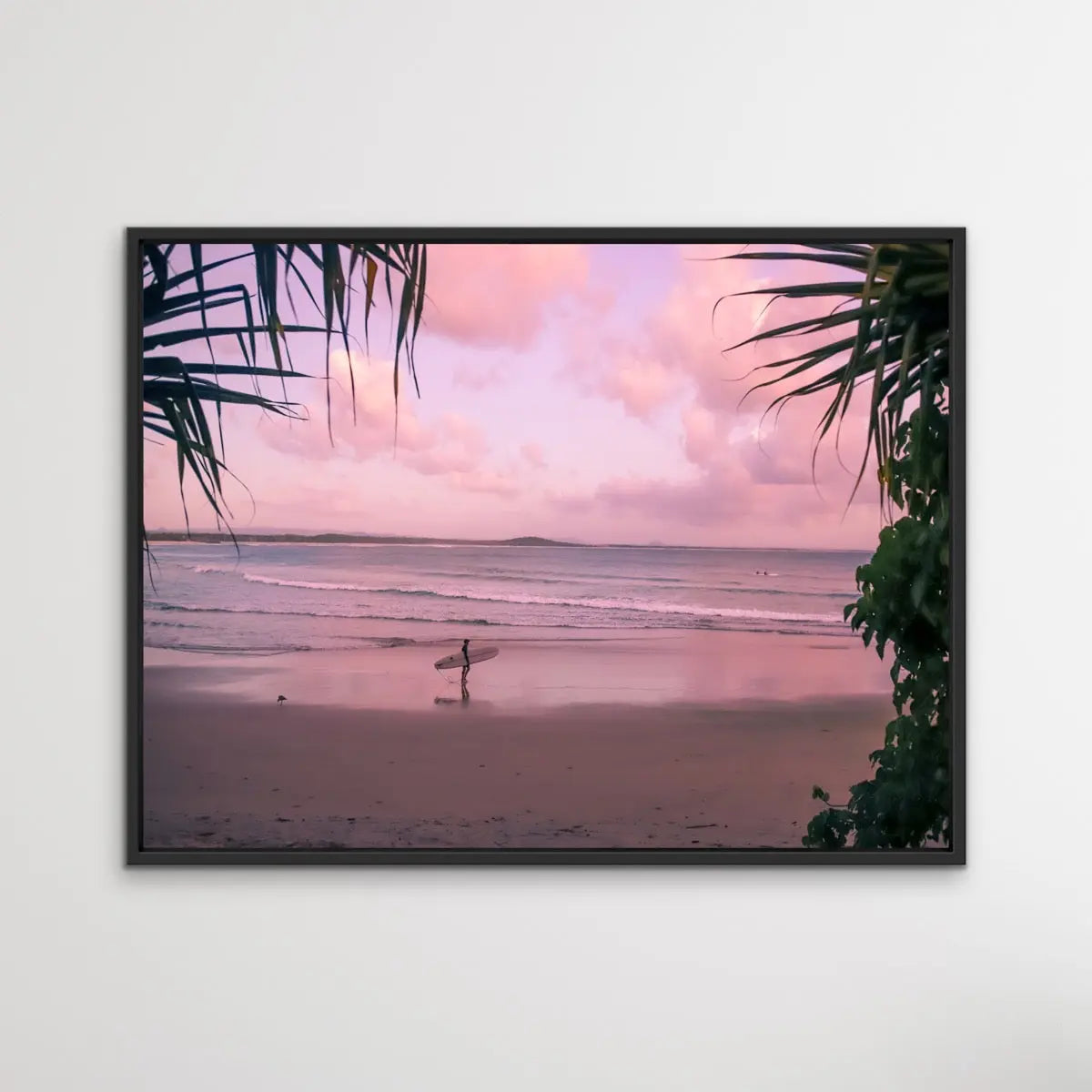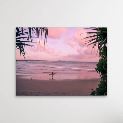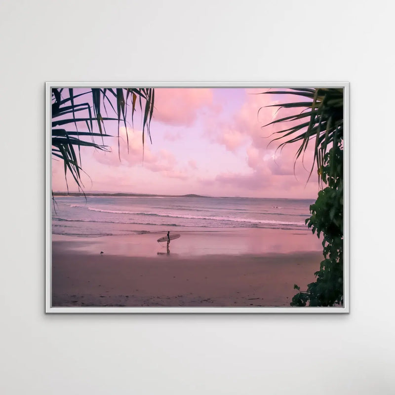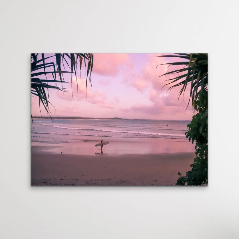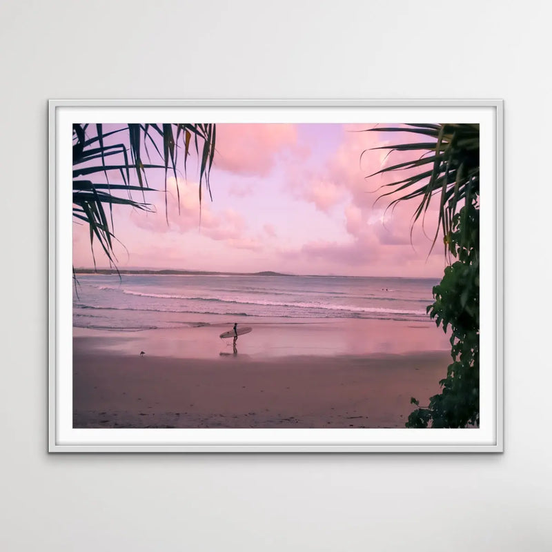 This print shows a sole surfer on Noosa's Main Beach at dawn. Slightly soft and dreamy in feel, this is a great choice for anyone looking to capture a bit of Noosa's magic in their home.