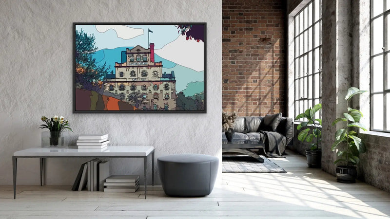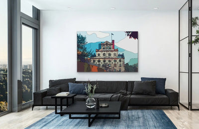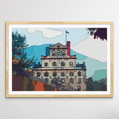 This fun contemporary print features Hobart's iconic and beautiful Cascade Brewery building, rendered in colourful shades of blue and orange.