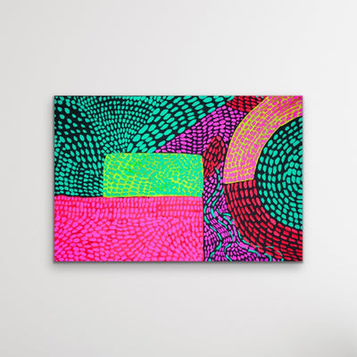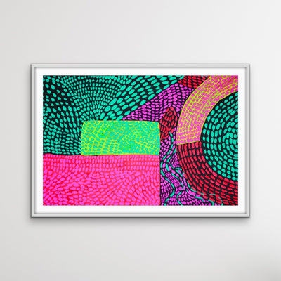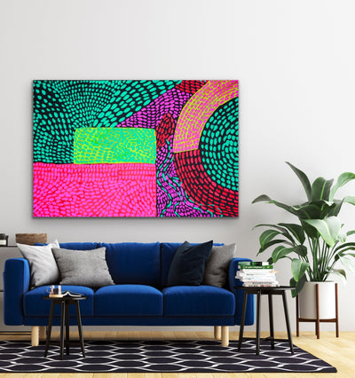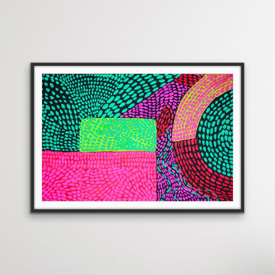 Looking for a punch of neon colour in your space? Journey is a bold, fun abstract print featuring bright pops of colour against a dark background.
