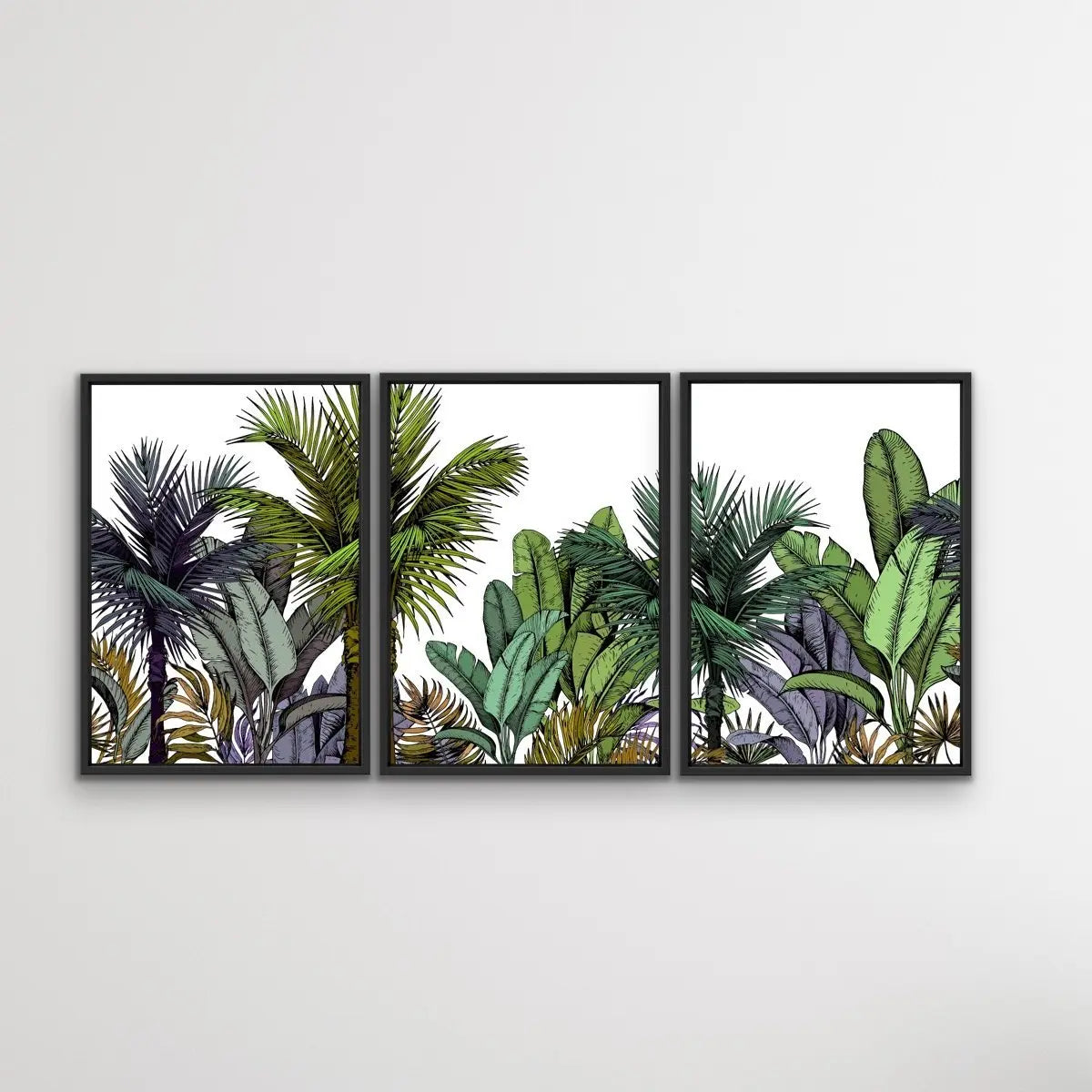 This beautiful three-piece canvas print set features the plants of a sub-tropical garden in on-trend green and purple tones. Tropical Skyline is the perfect print set for mid century modern home or boho home styling.