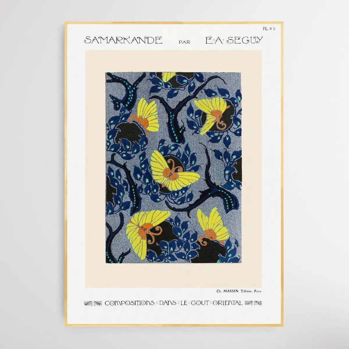 Butterfly pochoir pattern in Art Nouveau oriental style. Original from the 1914 edition of Samarkande: 20 Compositions en couleurs dans le Style oriental" (Samarkand: 20 Color Compositions in the Oriental Style) by E. A. Séguy.