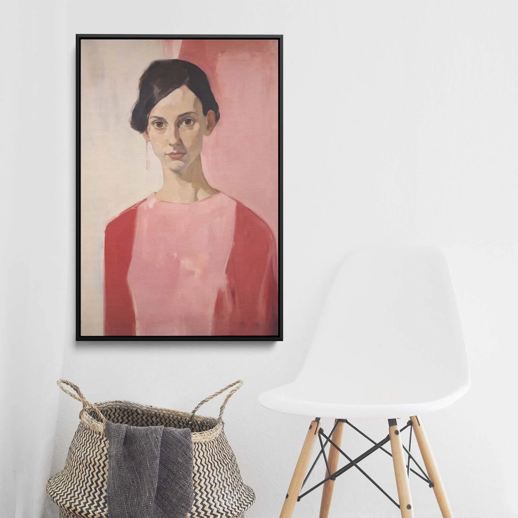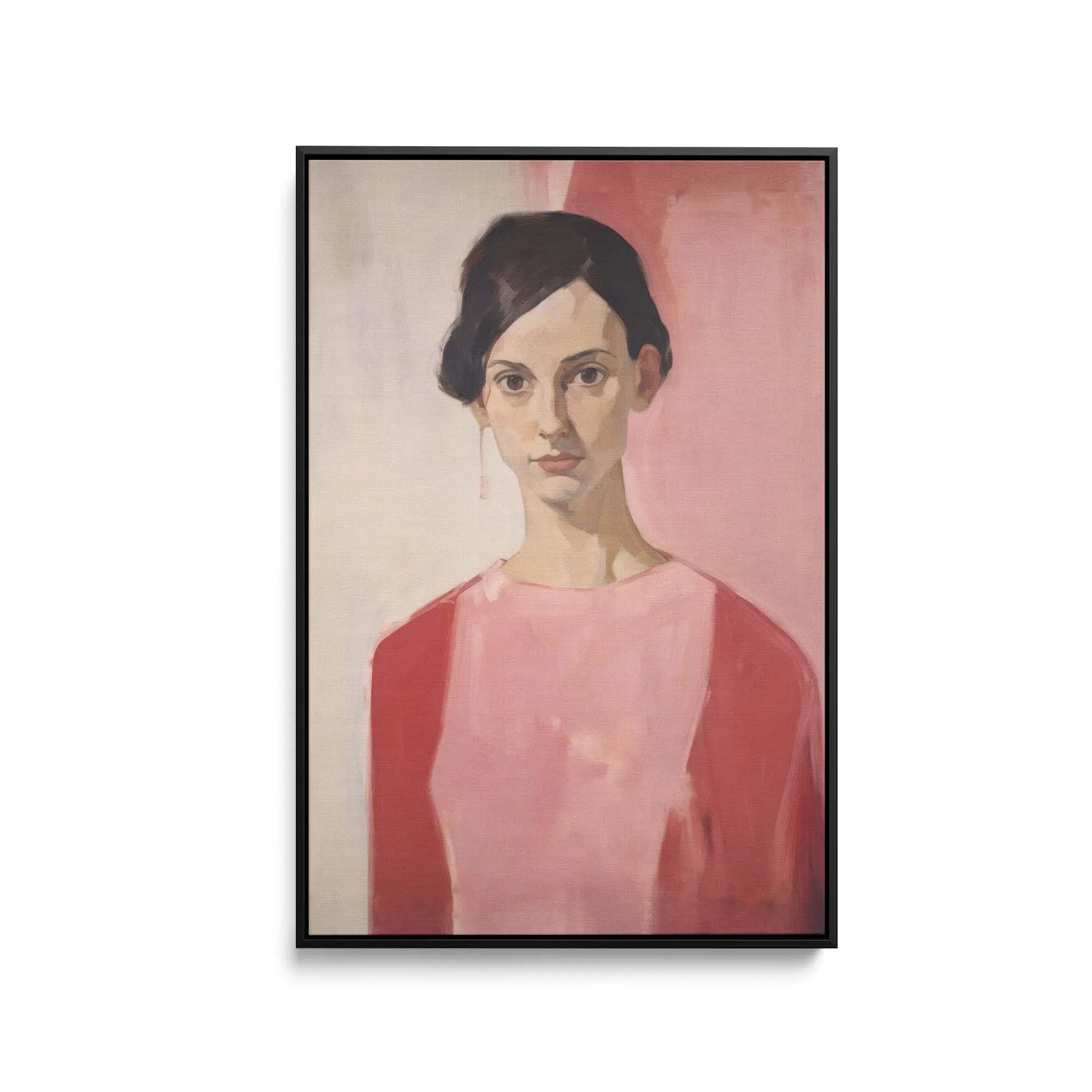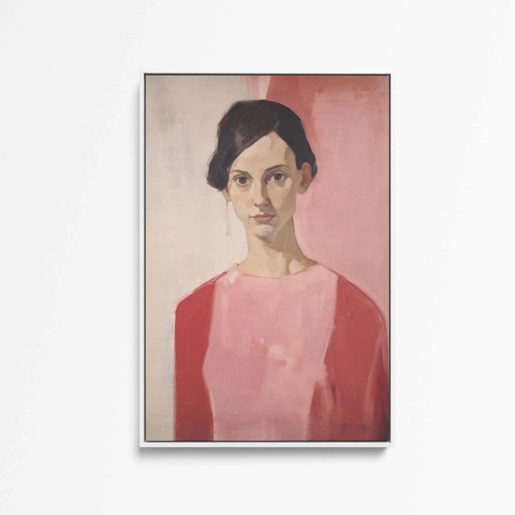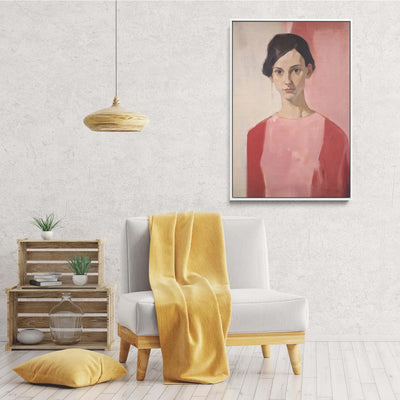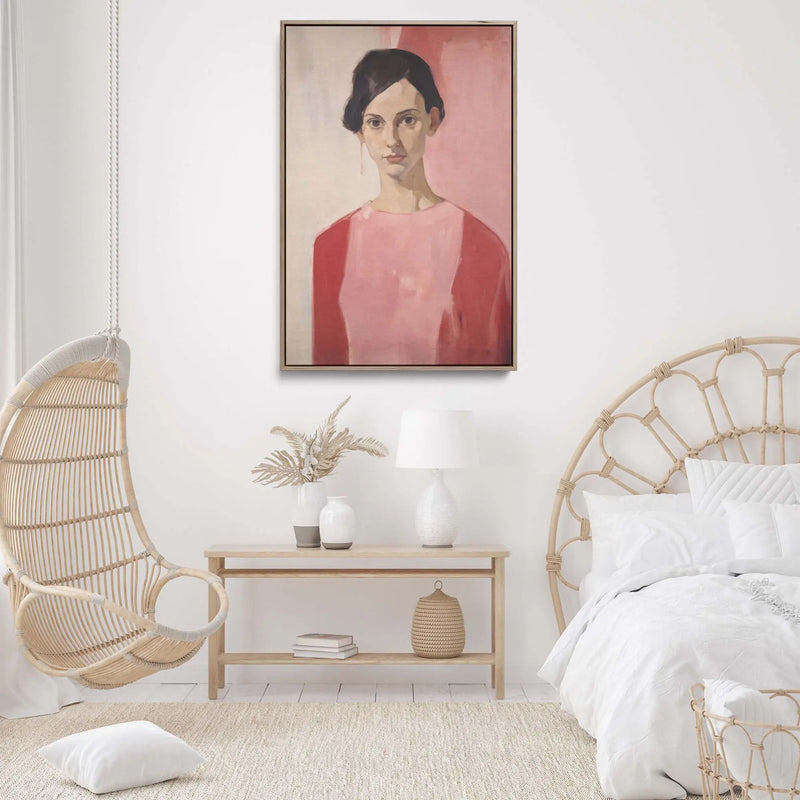 This stunning evocative art print features a woman in red and pink against a pink and cream background.