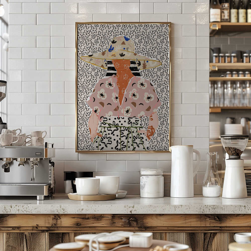 Time Out - African American Woman Sitting With Her Cat Contemporary Pink and Floral Wall Art Print