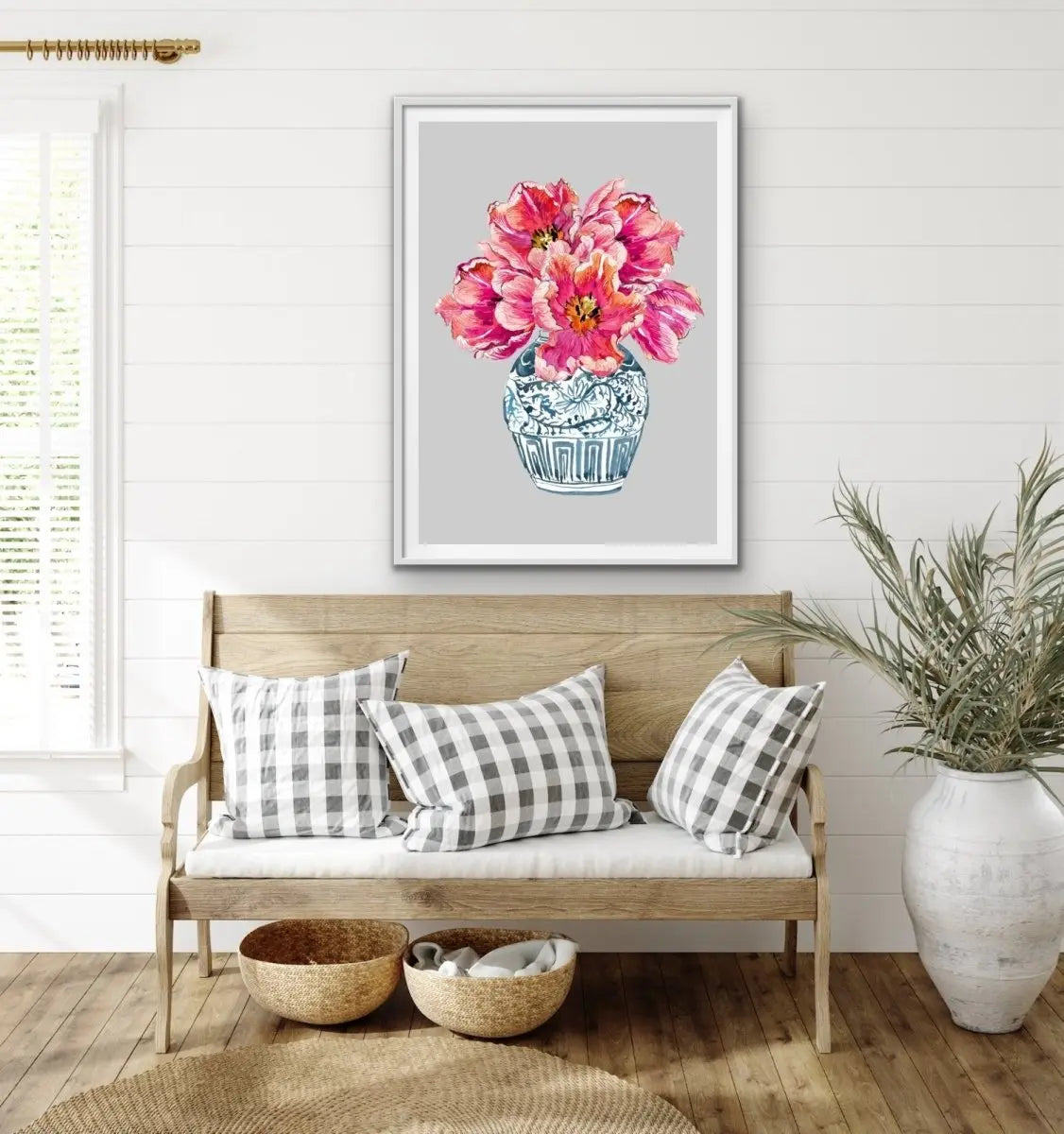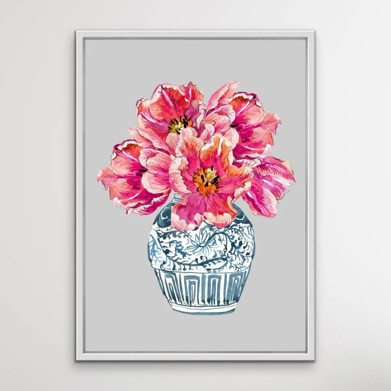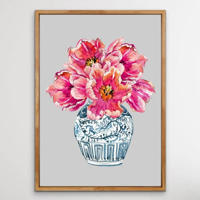 This beautiful, bold artwork of ablue vase with a pink flower is the perfectclassic piece to brighten up living areas and bedrooms.