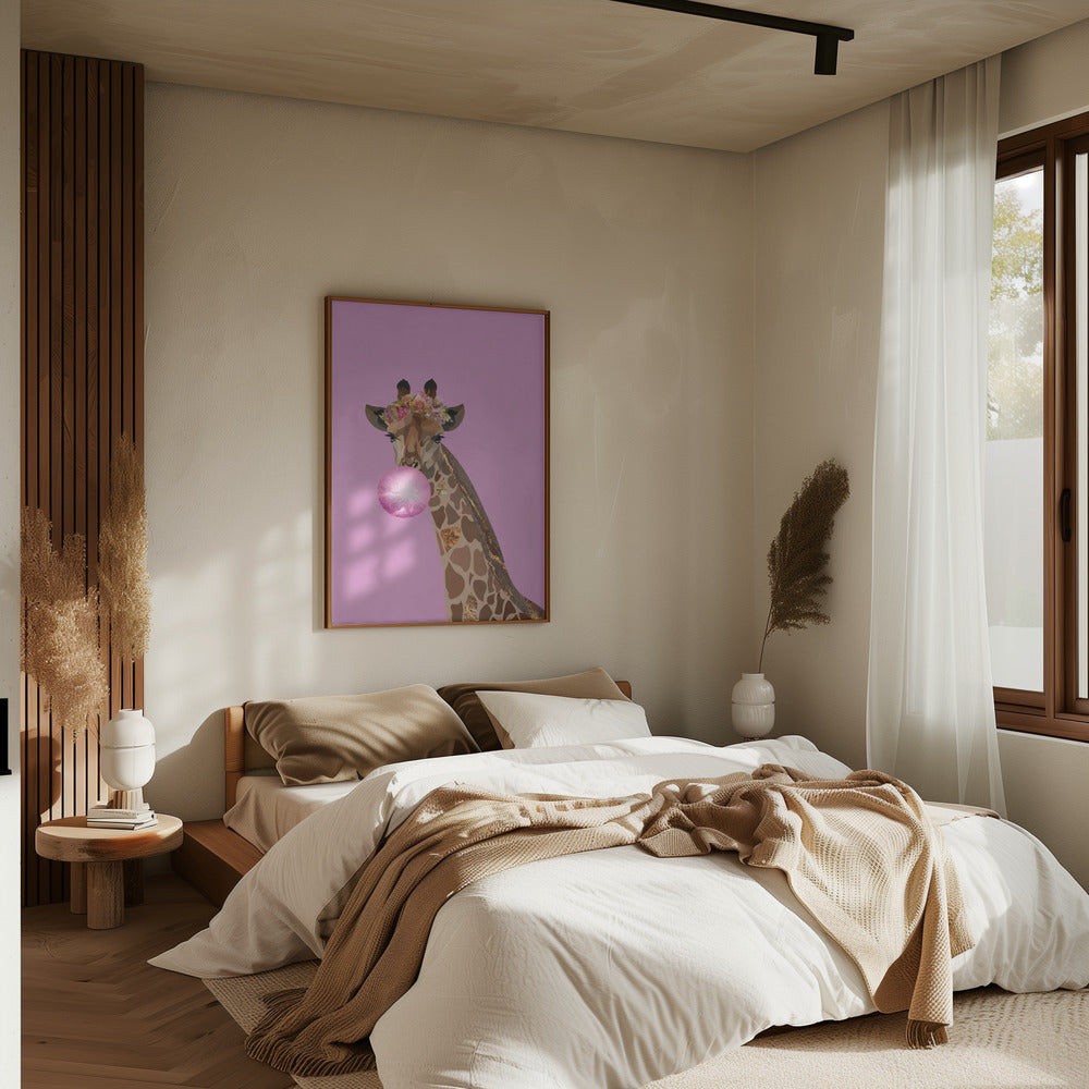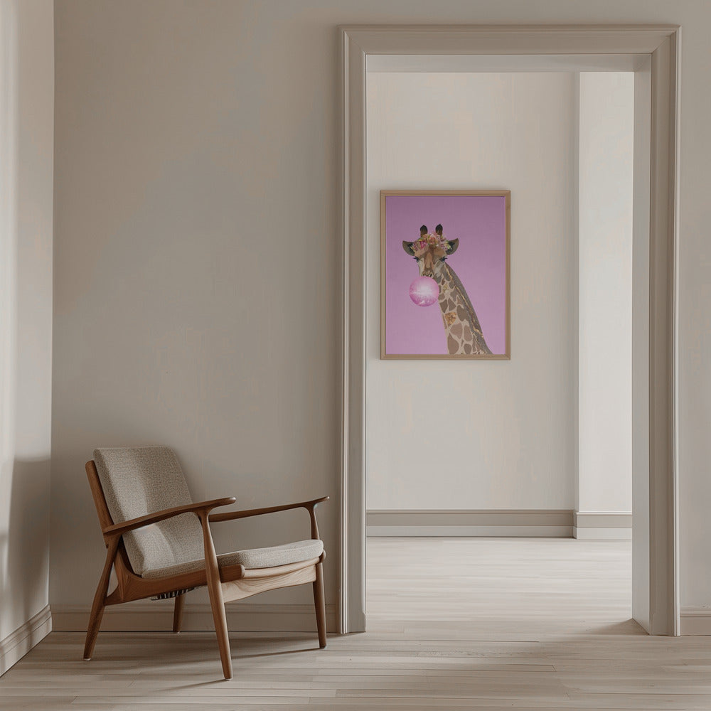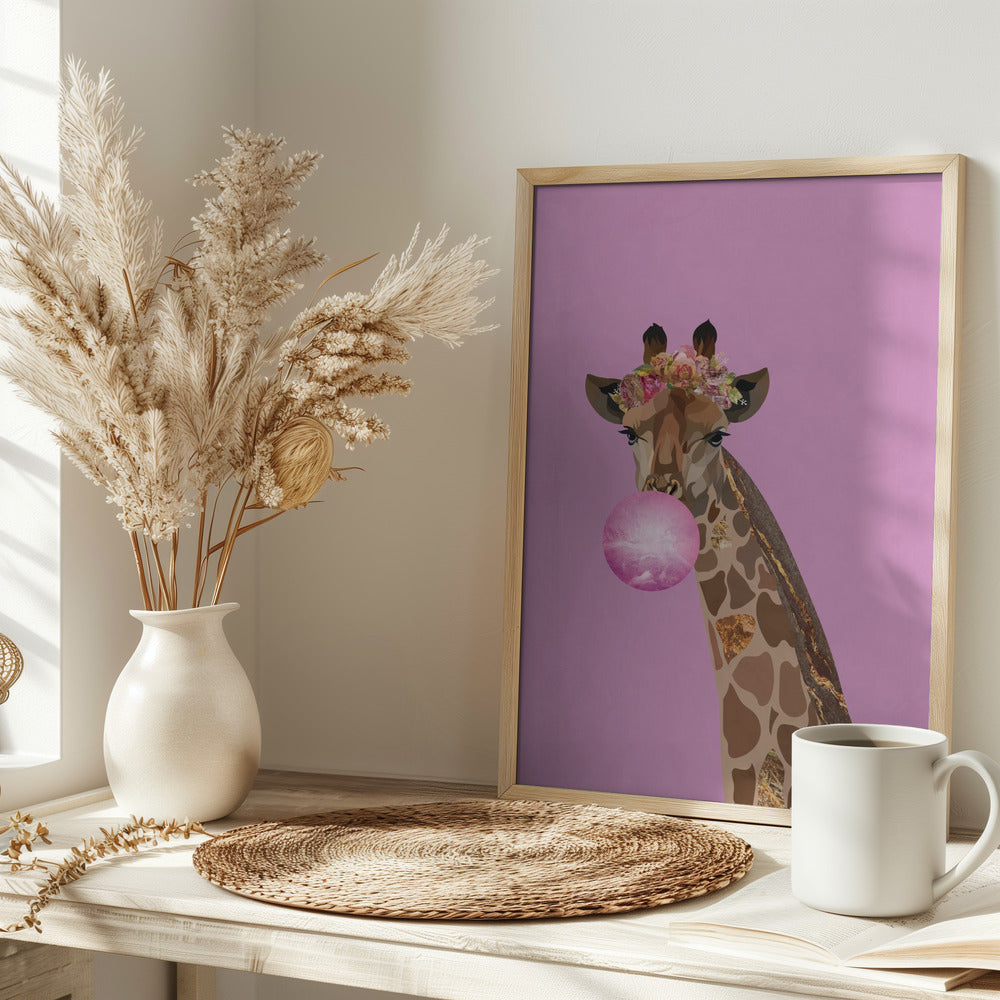 Explore our many print options for Giraffe pink bubblegum by artist Sarah Manovski.