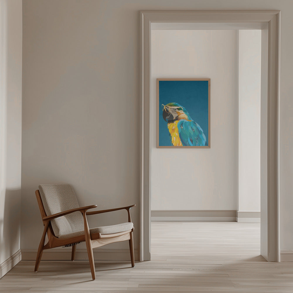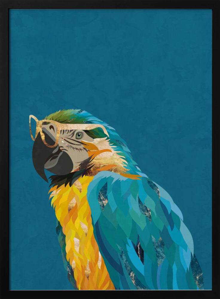 Explore our many print options for Vibrant macaw wearing glasses by artist Sarah Manovski.