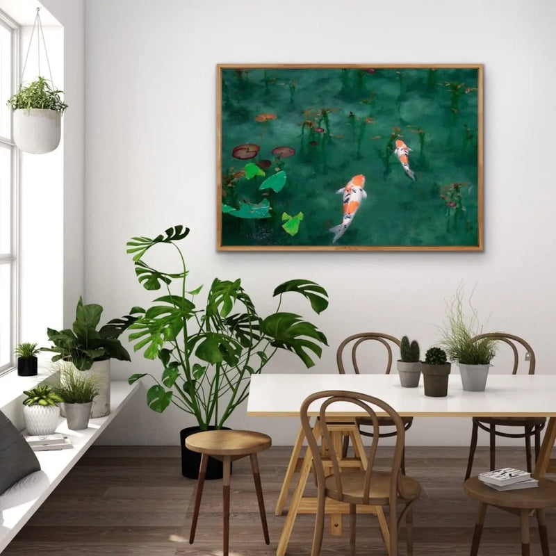 This beautiful, calming print is elegant and perfect for running in a large size, in a communal space. Featuring two koi swimming, it's designed to bring peace and tranquility to your space.