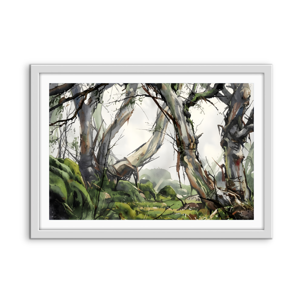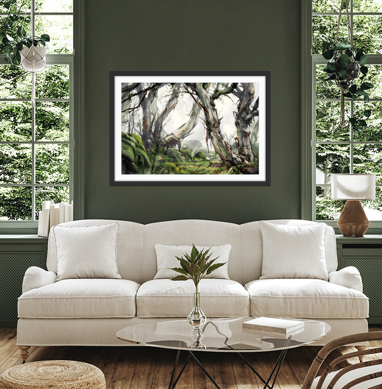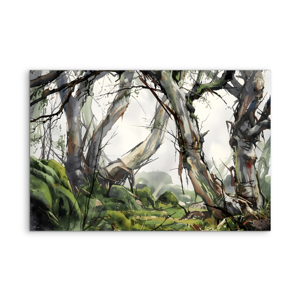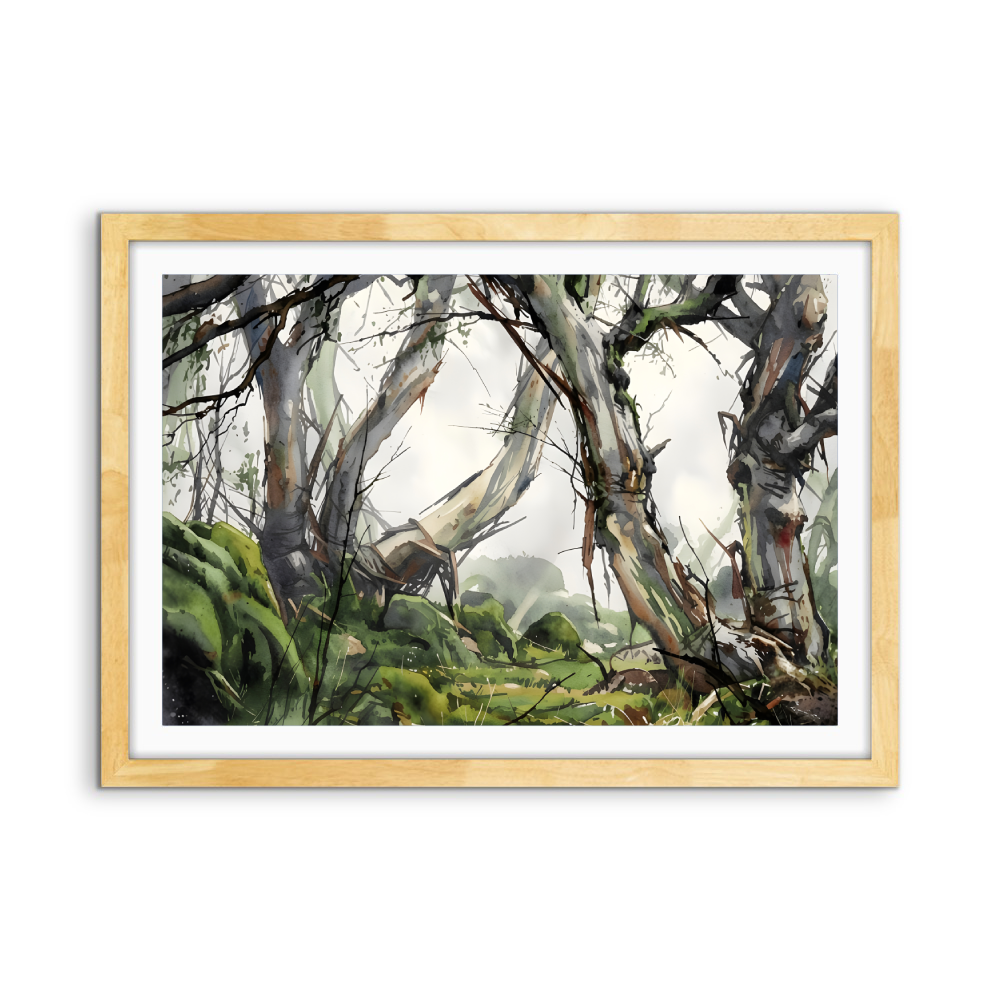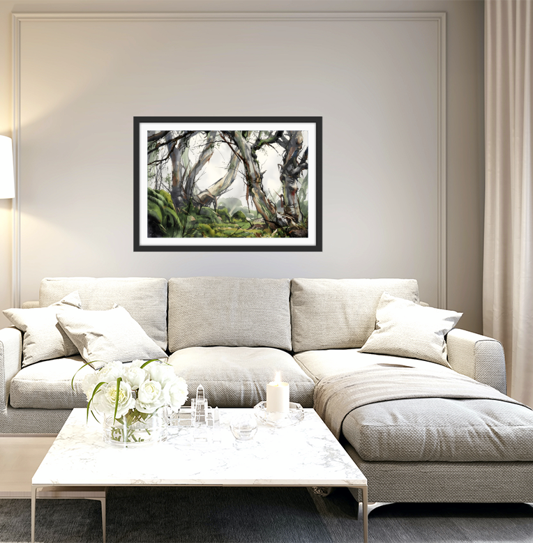This beautiful wall art piece features the gentle green and grey tones of an Australian bush setting after rain.