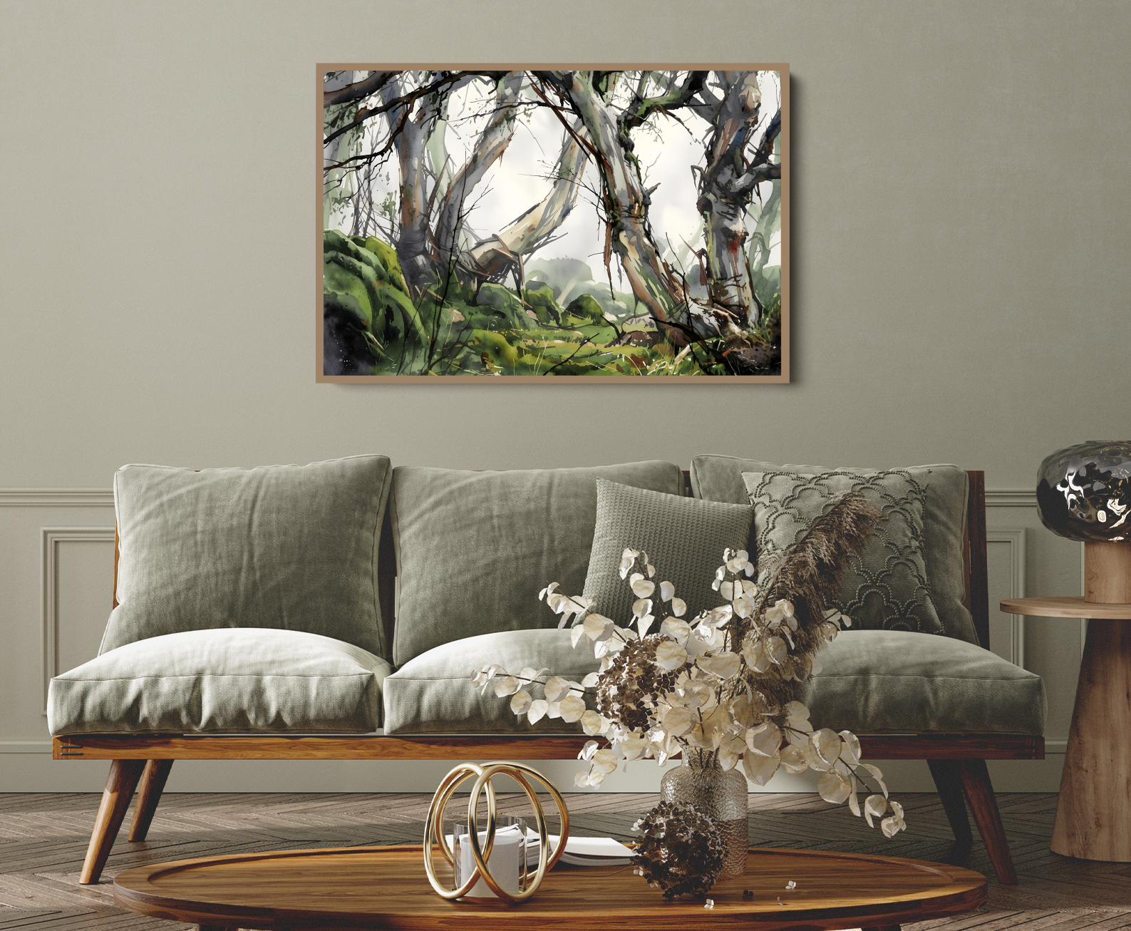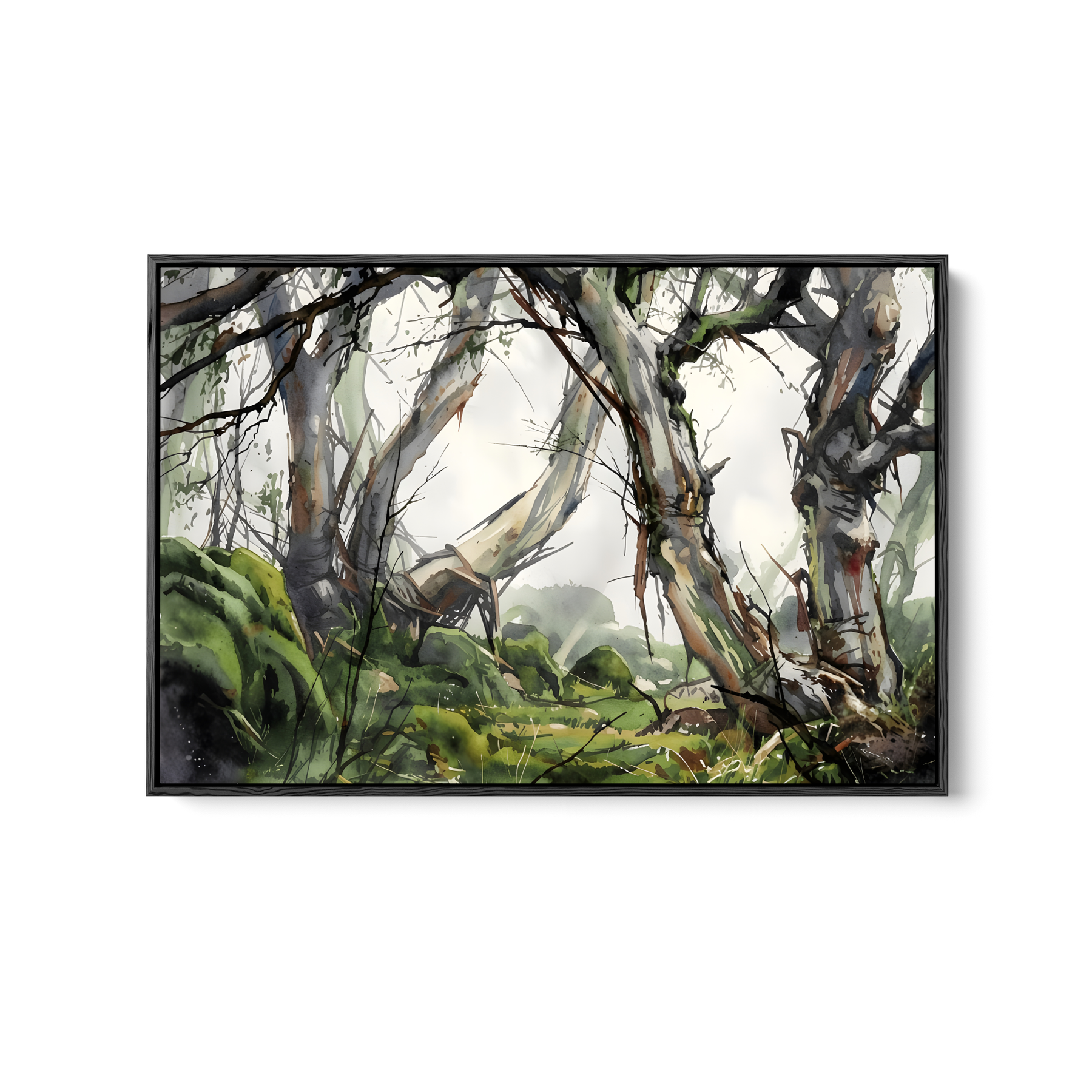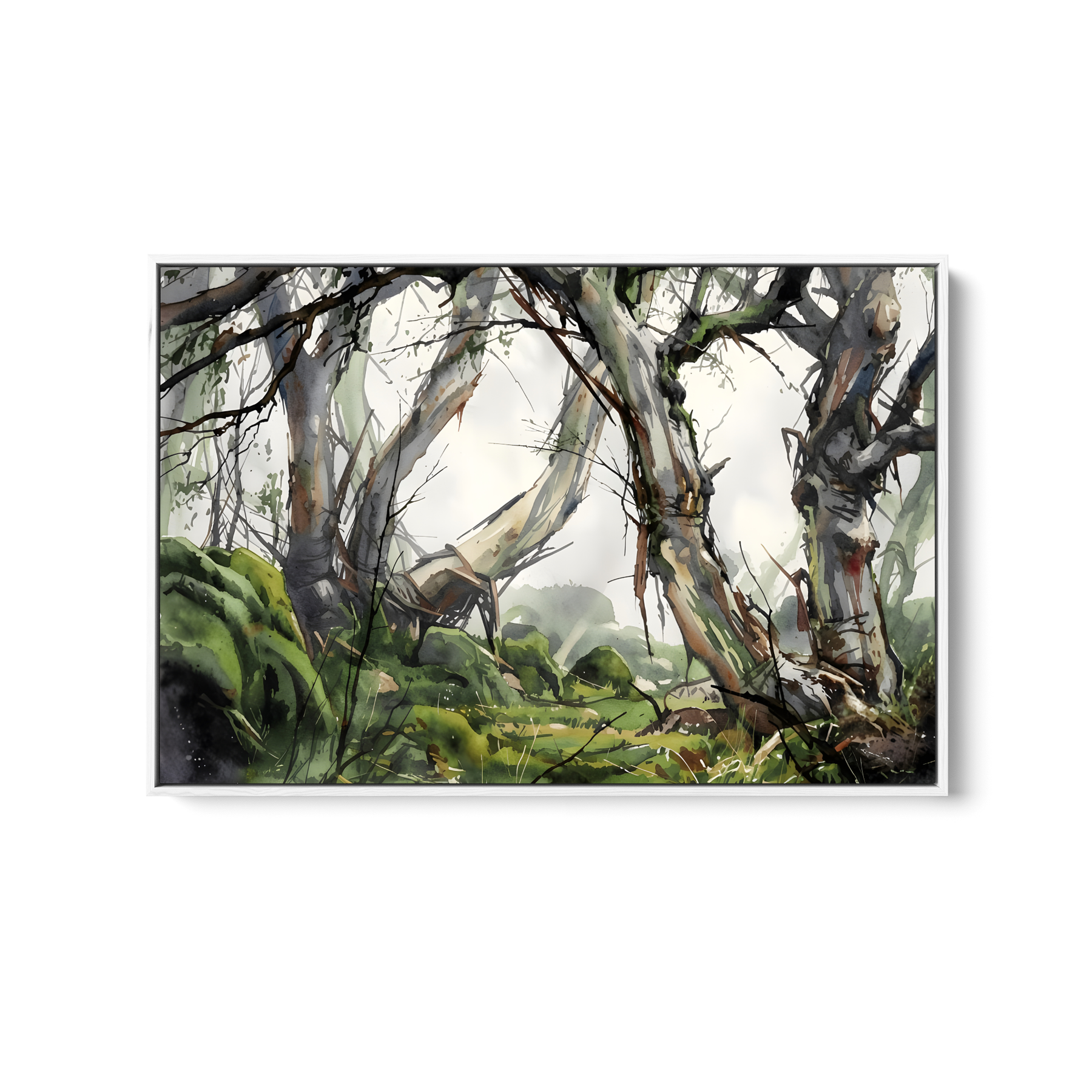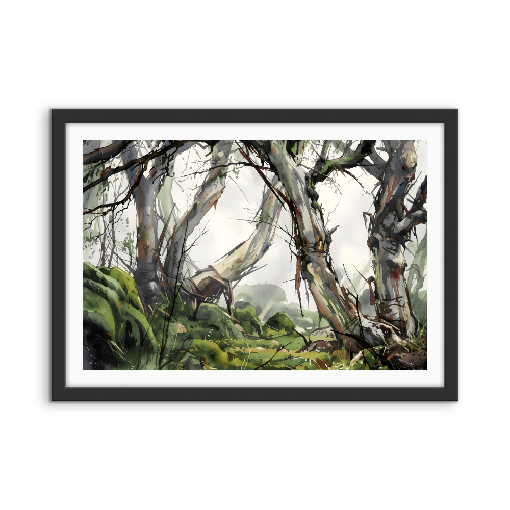 This beautiful wall art piece features the gentle green and grey tones of an Australian bush setting after rain.
