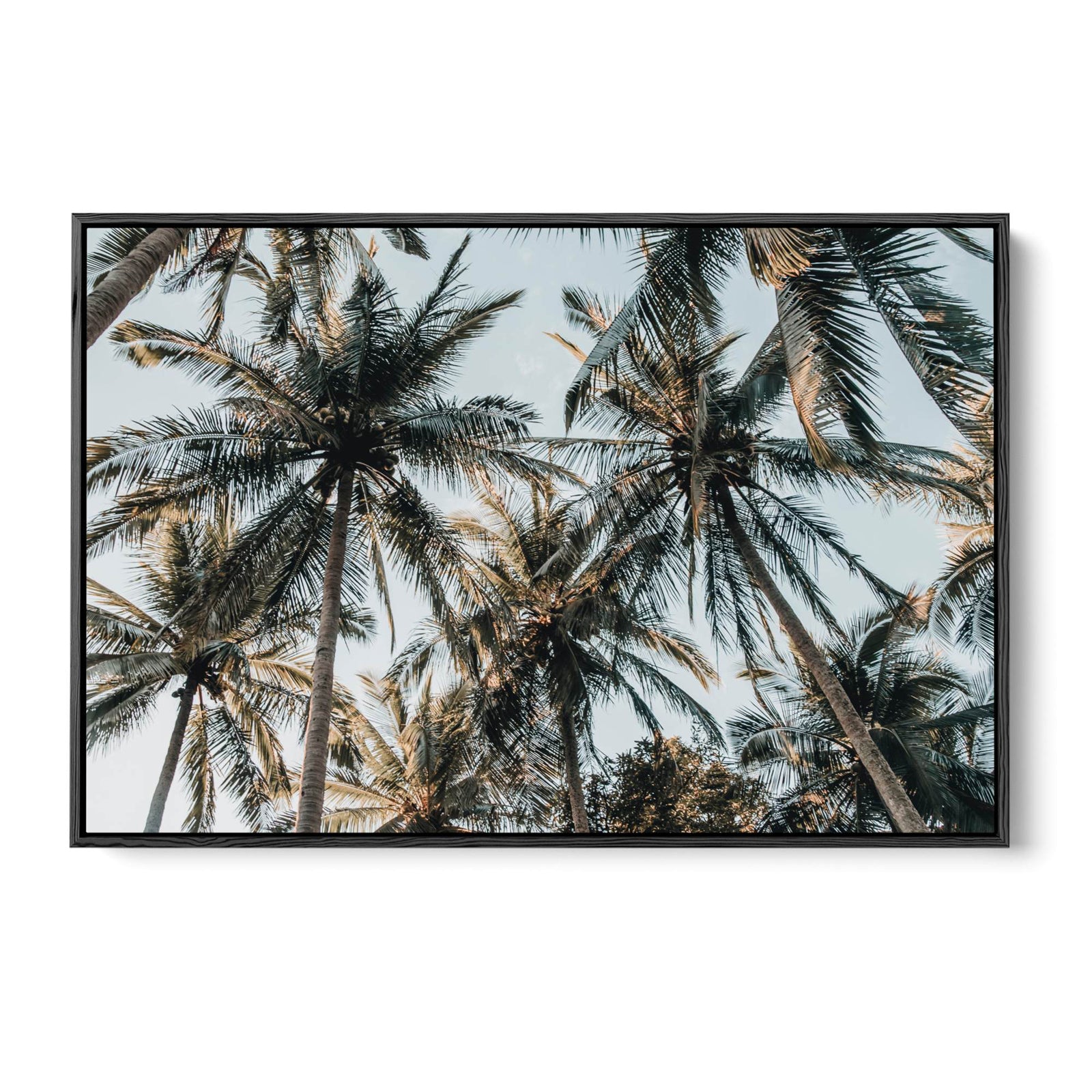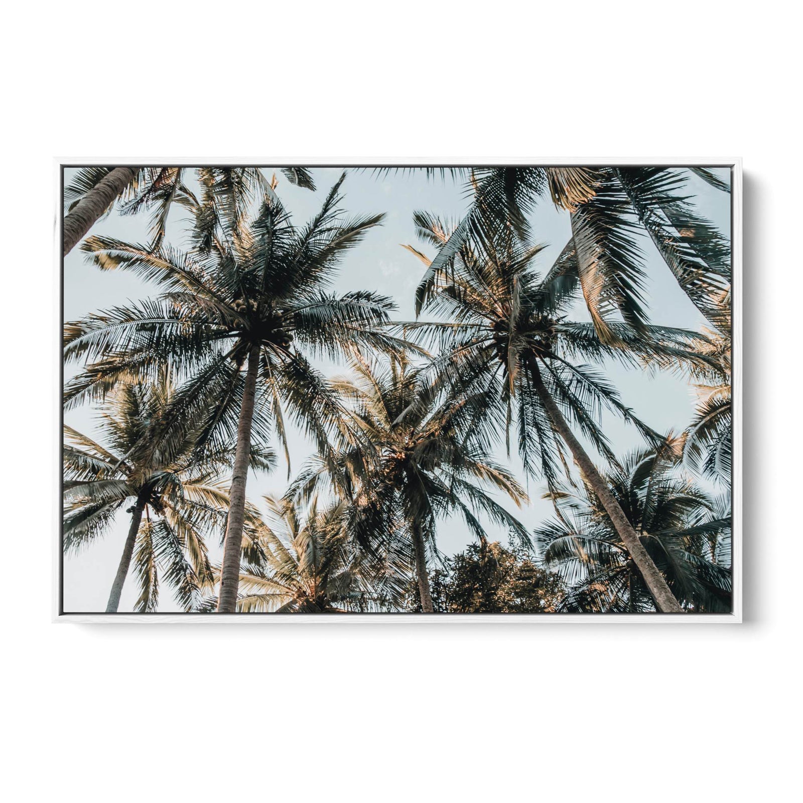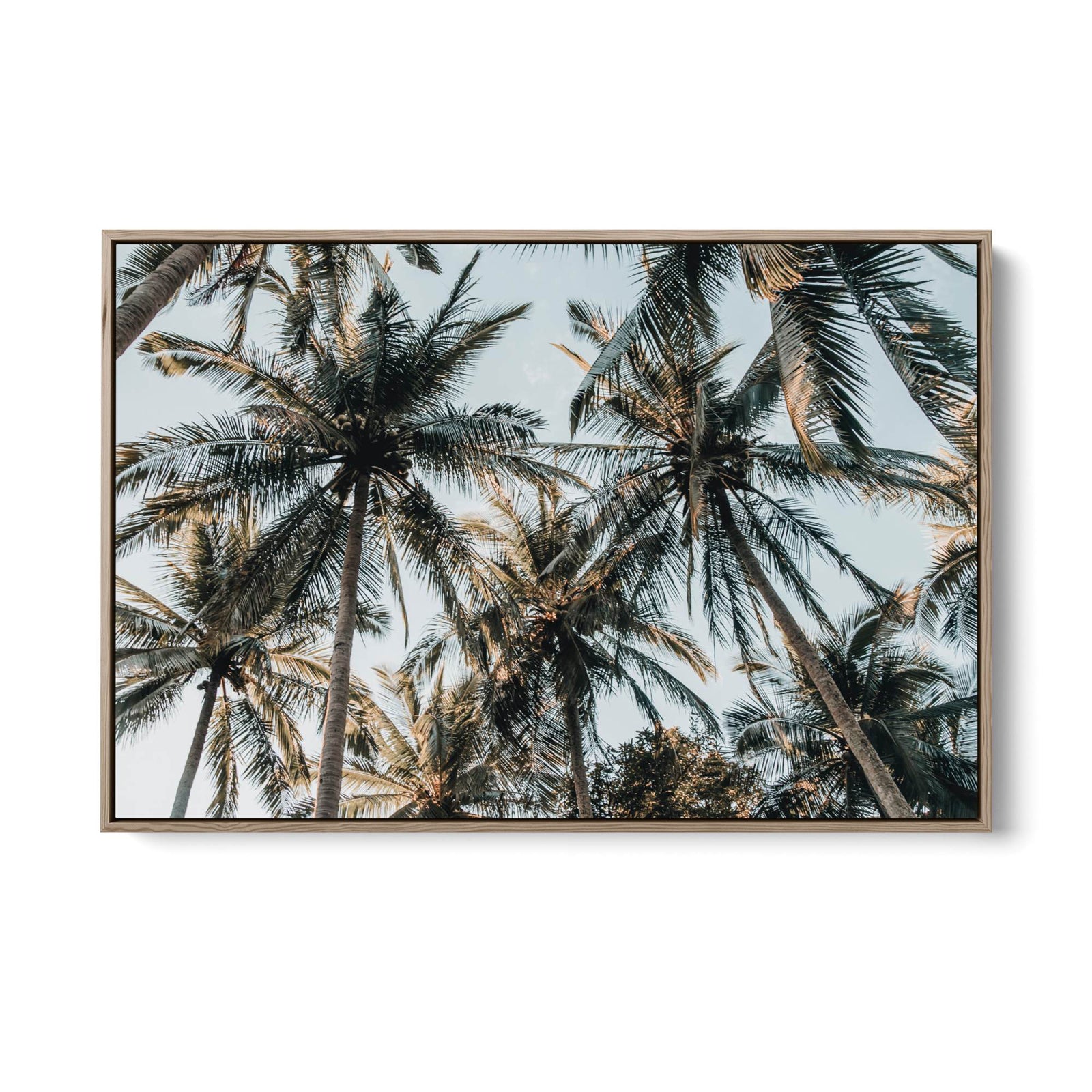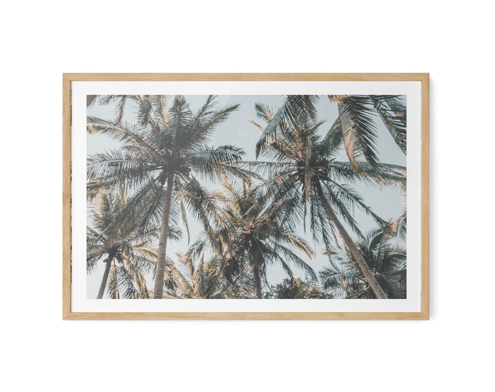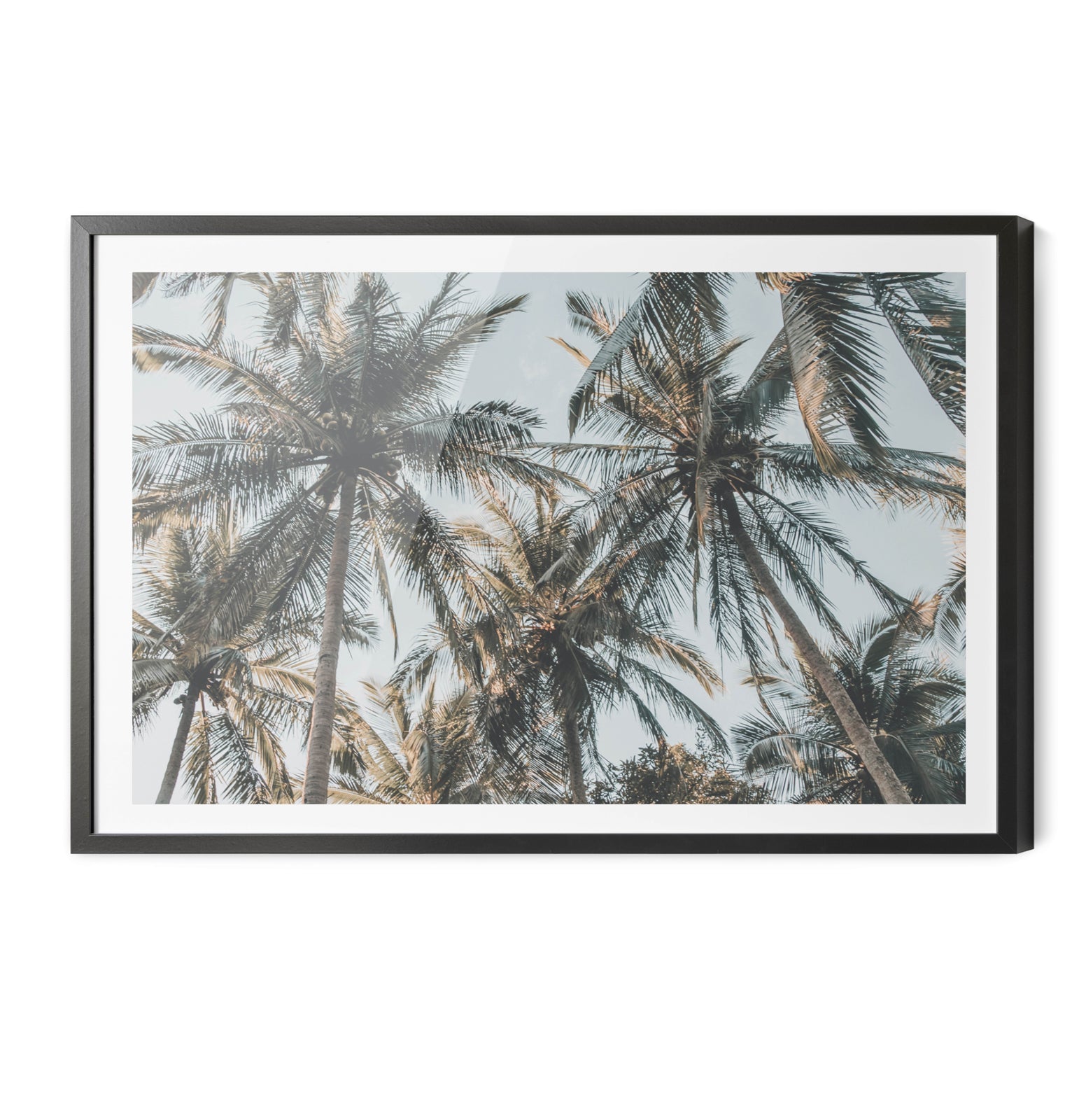 A photographic print of palm leaves, captured in sunlight.