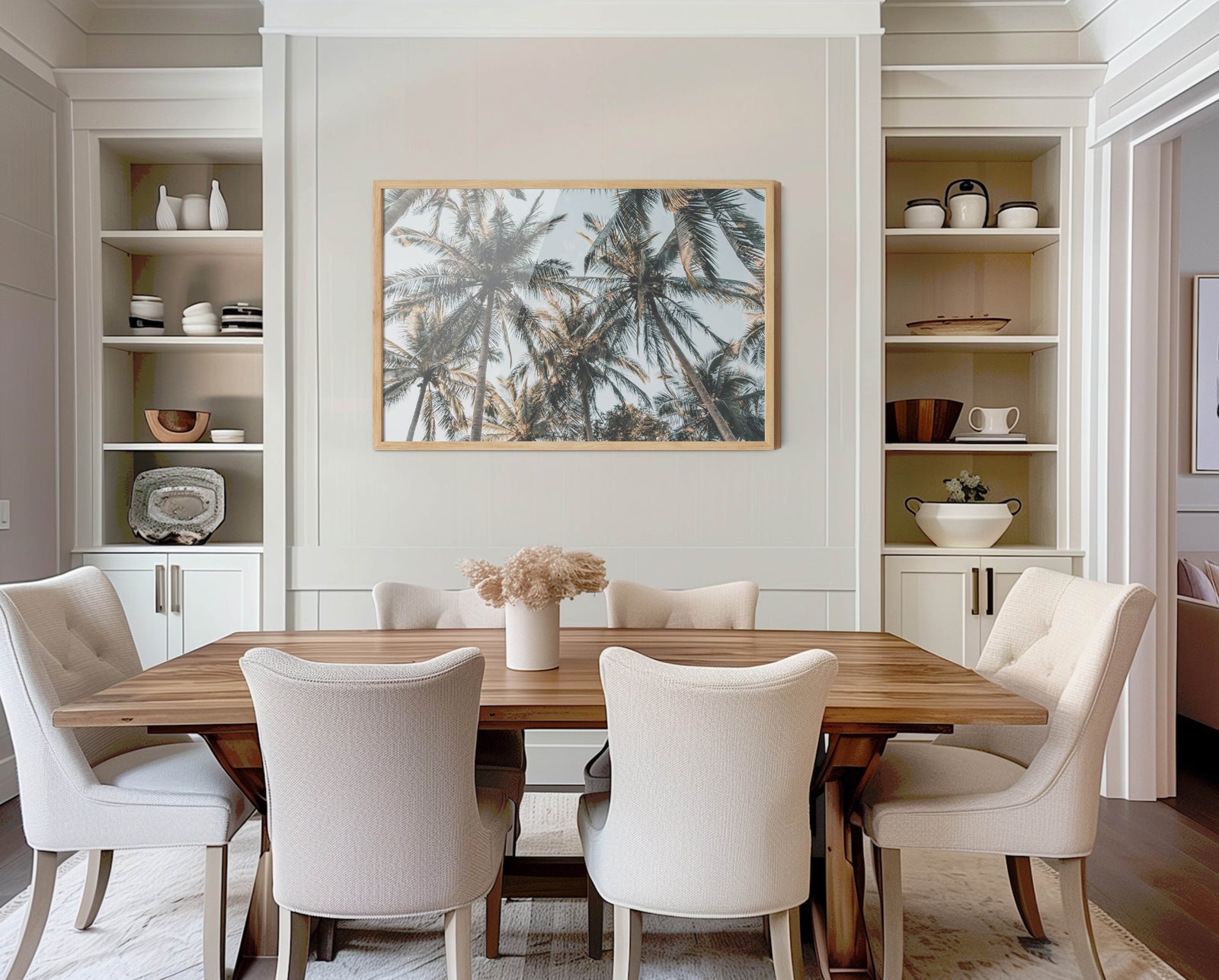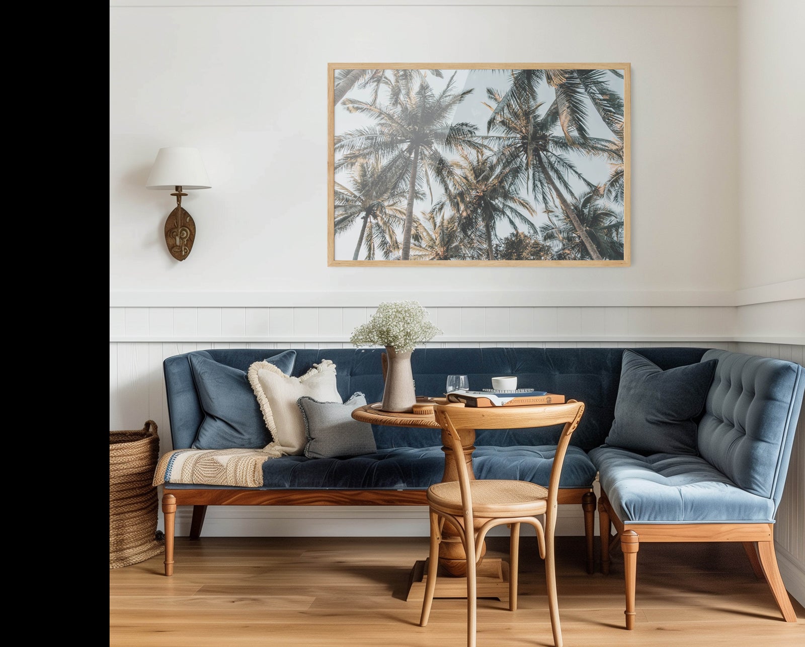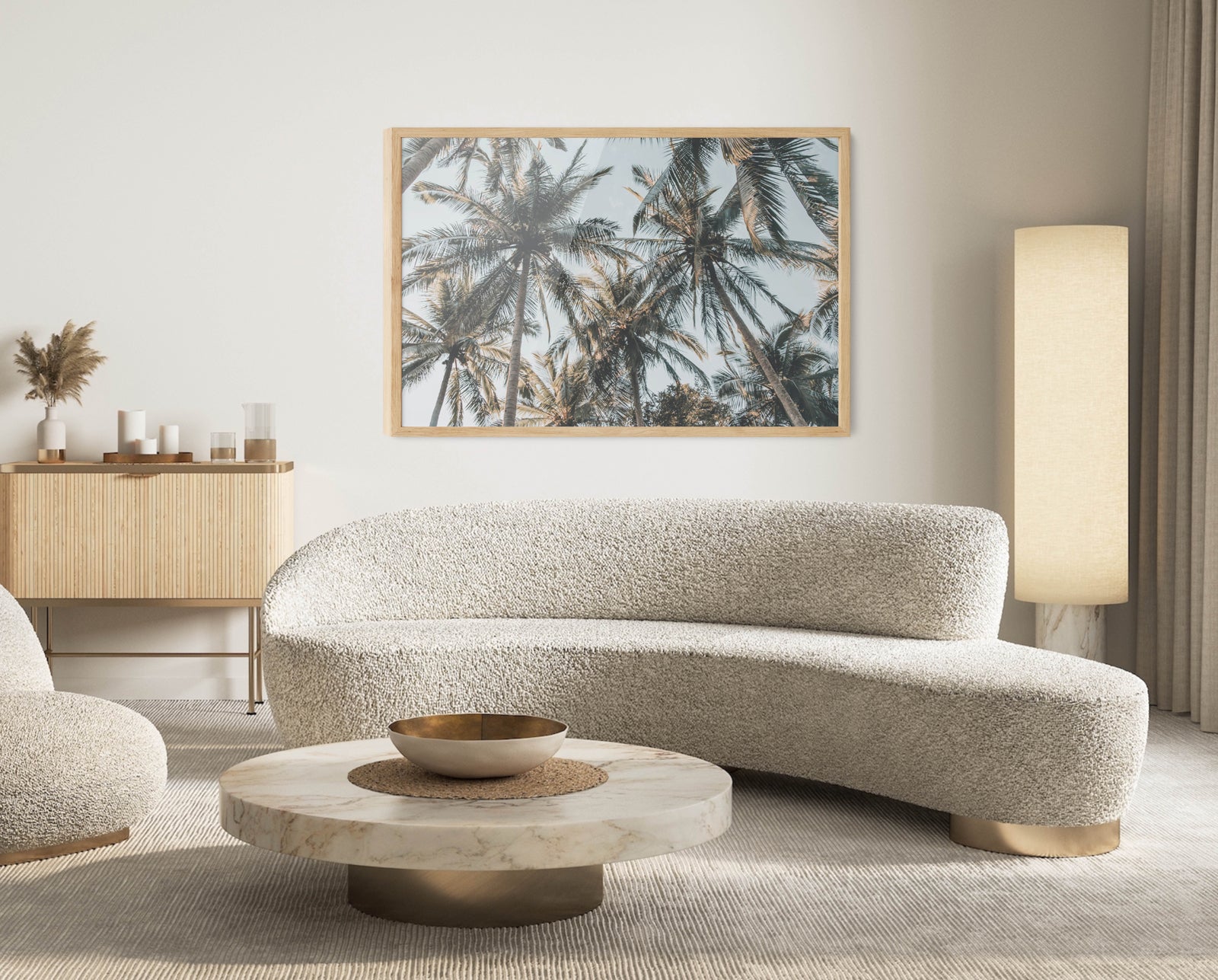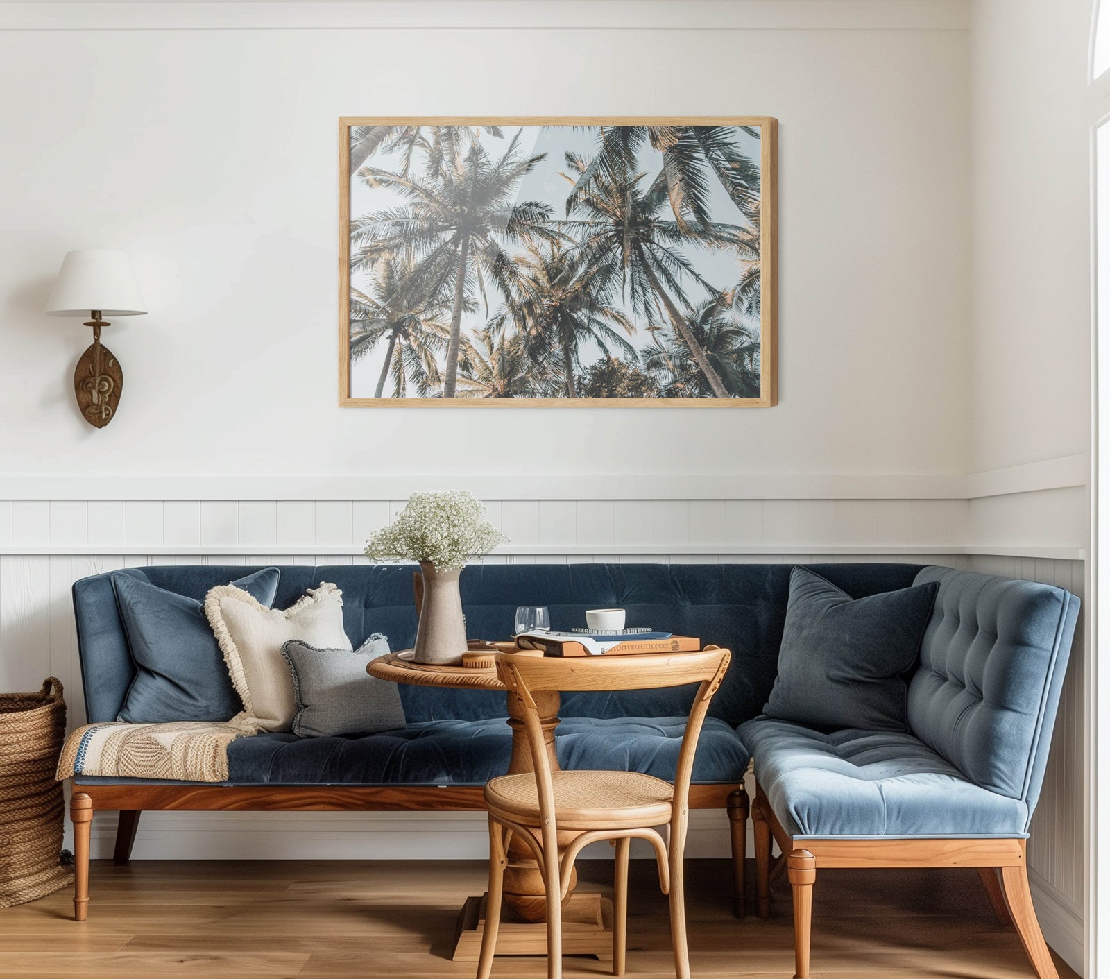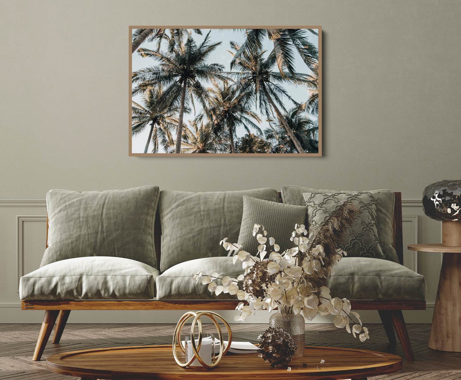 A photographic print of palm leaves, captured in sunlight.