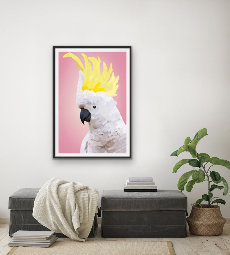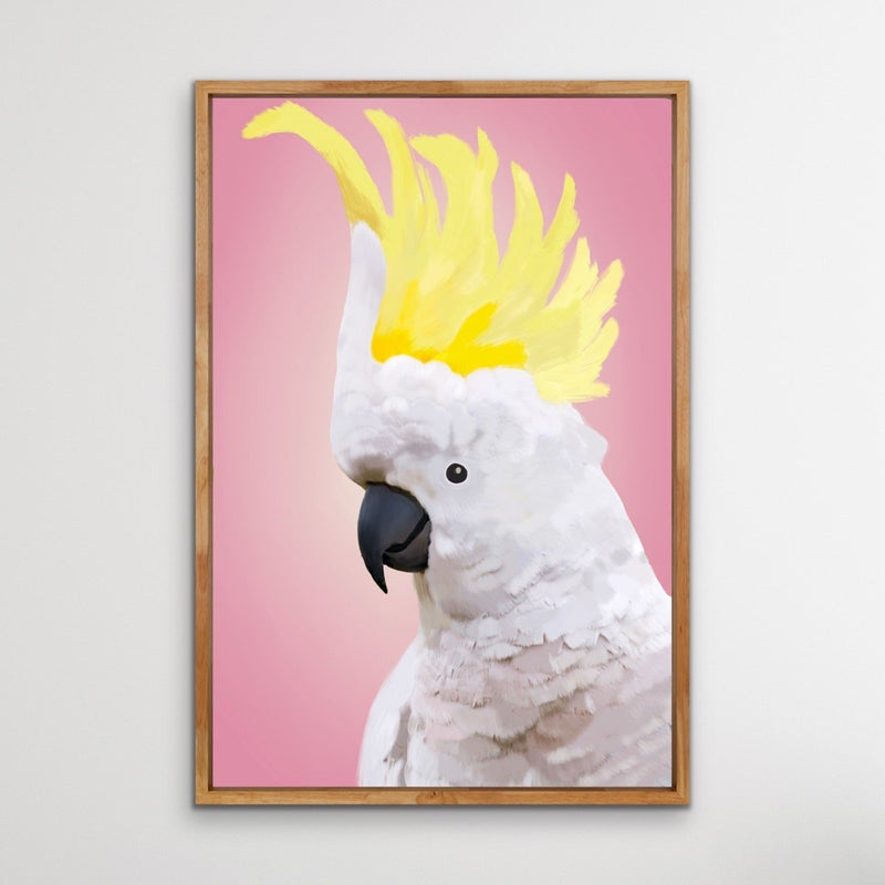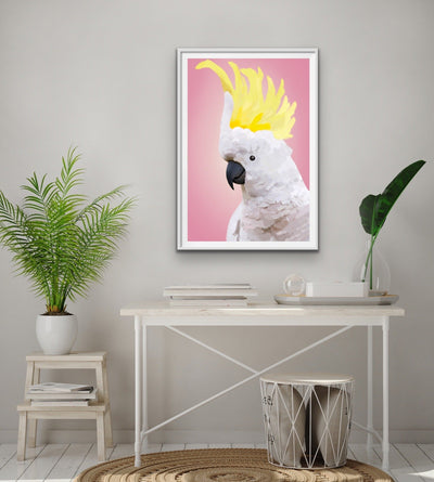 Cheeky Cockatoo is a beautiful, original cockatoo print on a pink background. This sulphur crested cockatoo will win your heart as soon as you lay eyes on her.