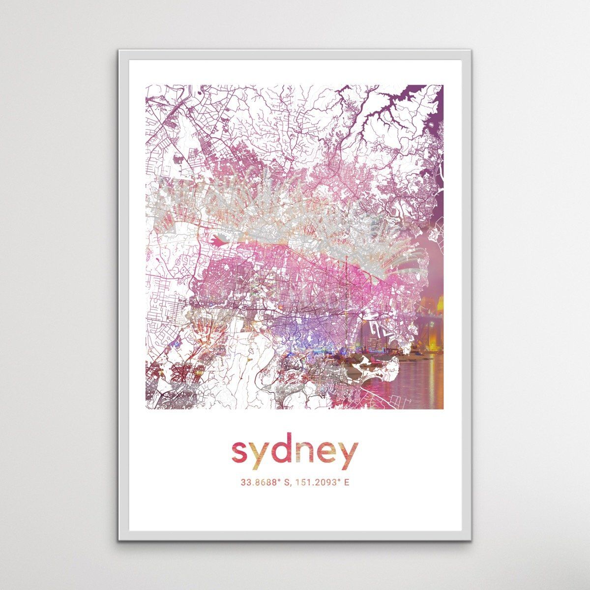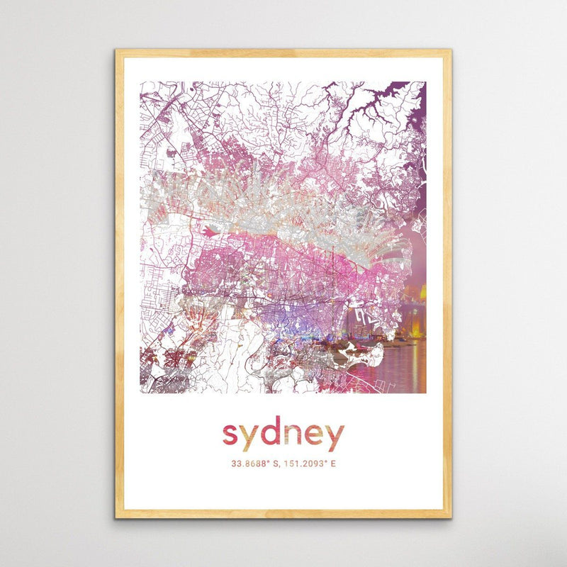 The Sydney Harbour Bridge is beautifully illuminated behind this map of the streets of Sydney.