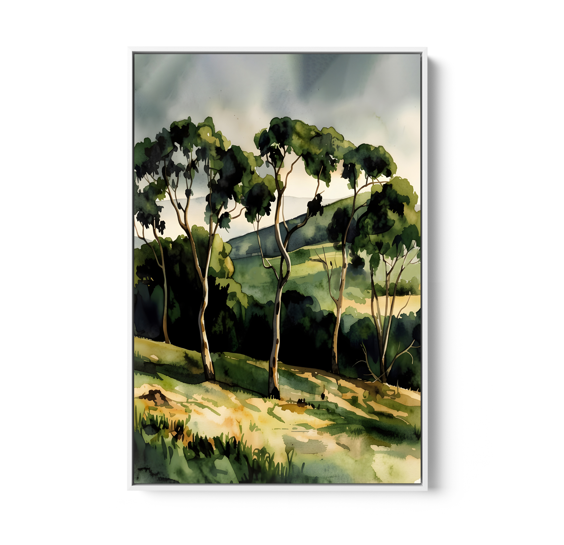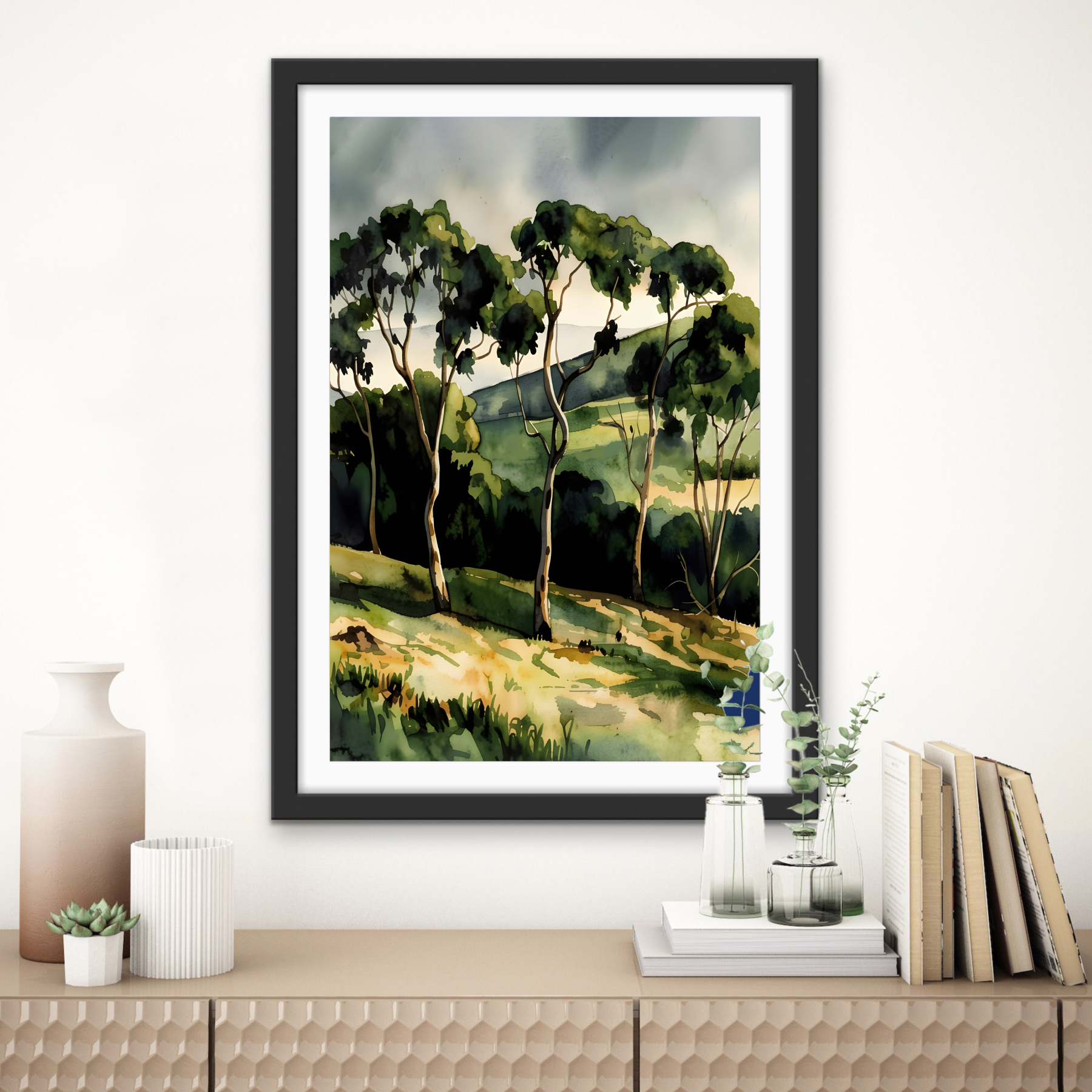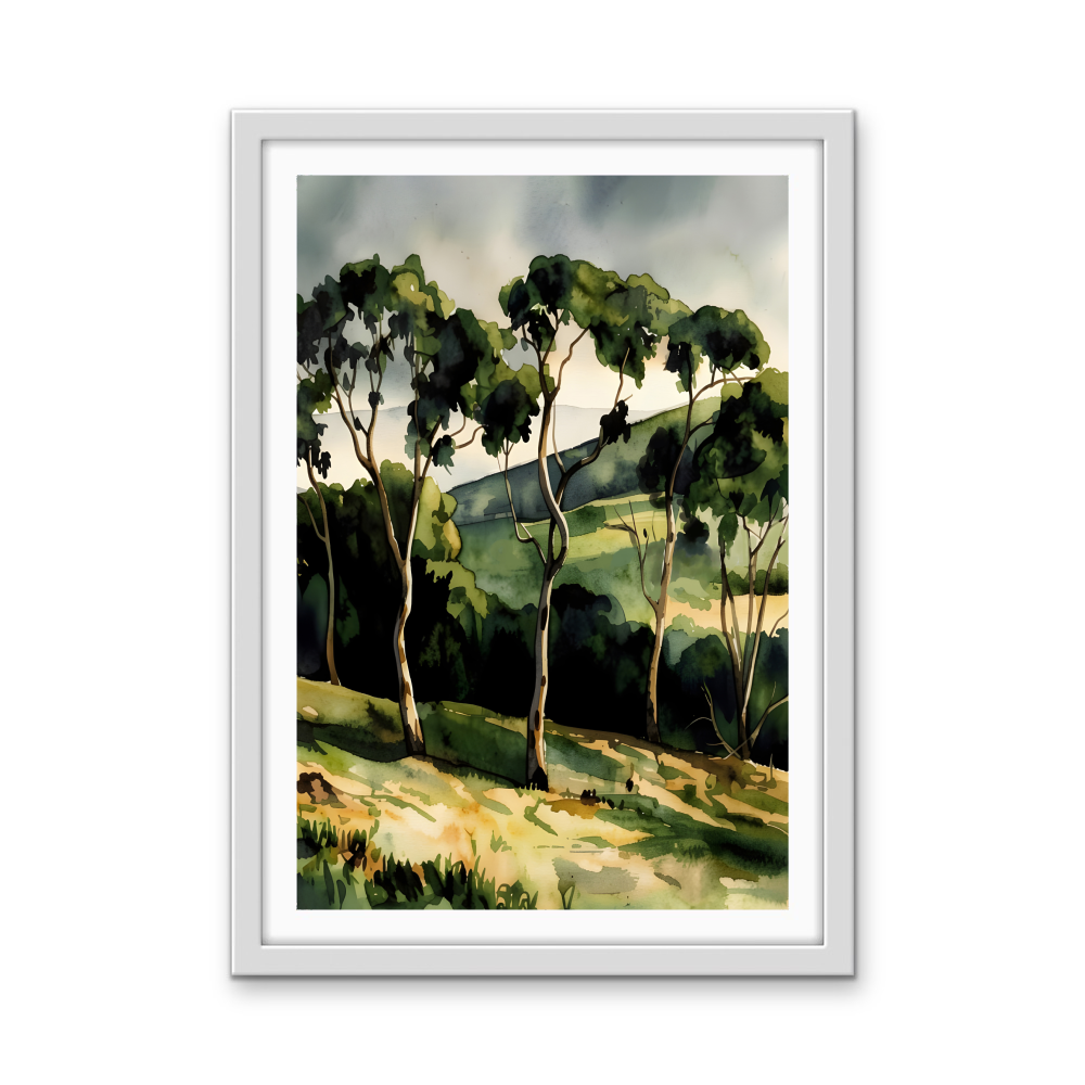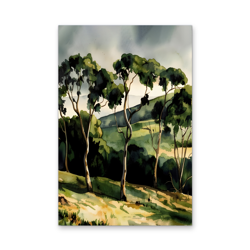 A gorgeous waterercolour-style artwork featuring the rich tones of an Australian country landscape after rain.